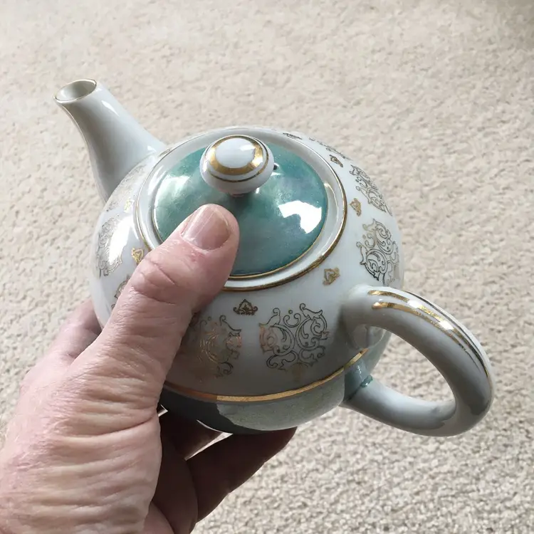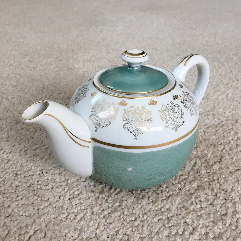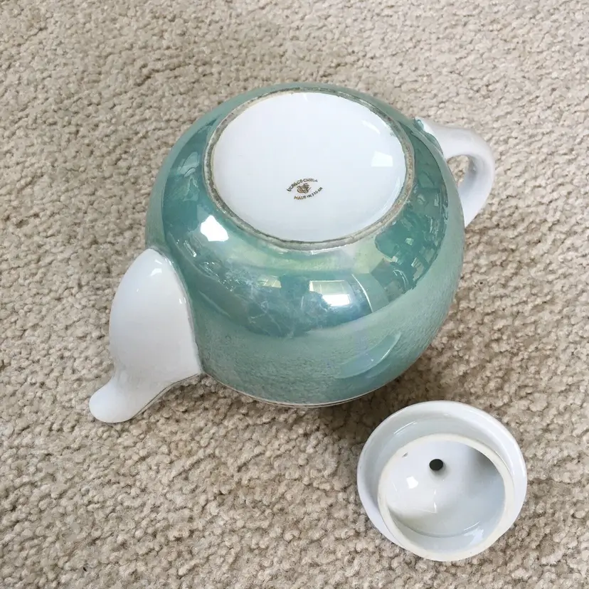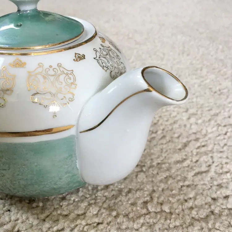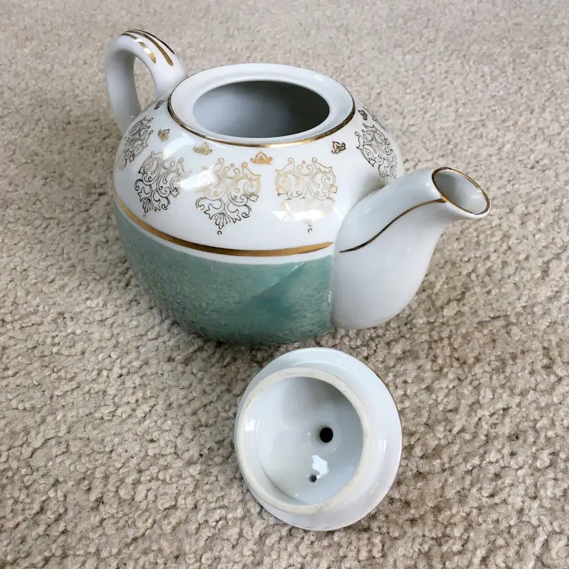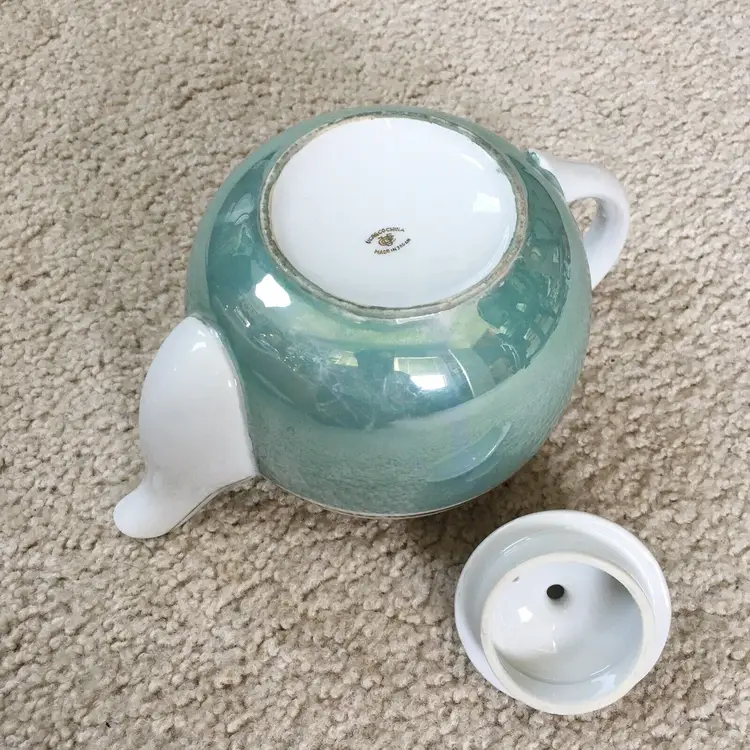 Vintage porcelain teapot made by UCAGCO CHINA in Japan. UCAGCO (United China and Glass Company) was based in New Orleans and New York, and was a creator and distributor of dinnerware and glassware. They also imported many Japanese china items during the 1950s. This teapot is hand painted in a beautiful teal blue-green color with gold trim and decoration. Very good condition with no chips, cracks or crazing to the porcelain. Displays Beautifully!! Some small color inflections from when originally hand painted. Diameter measures about 5” not including the handle or spout. See pics for more details and zoom in for closeups.