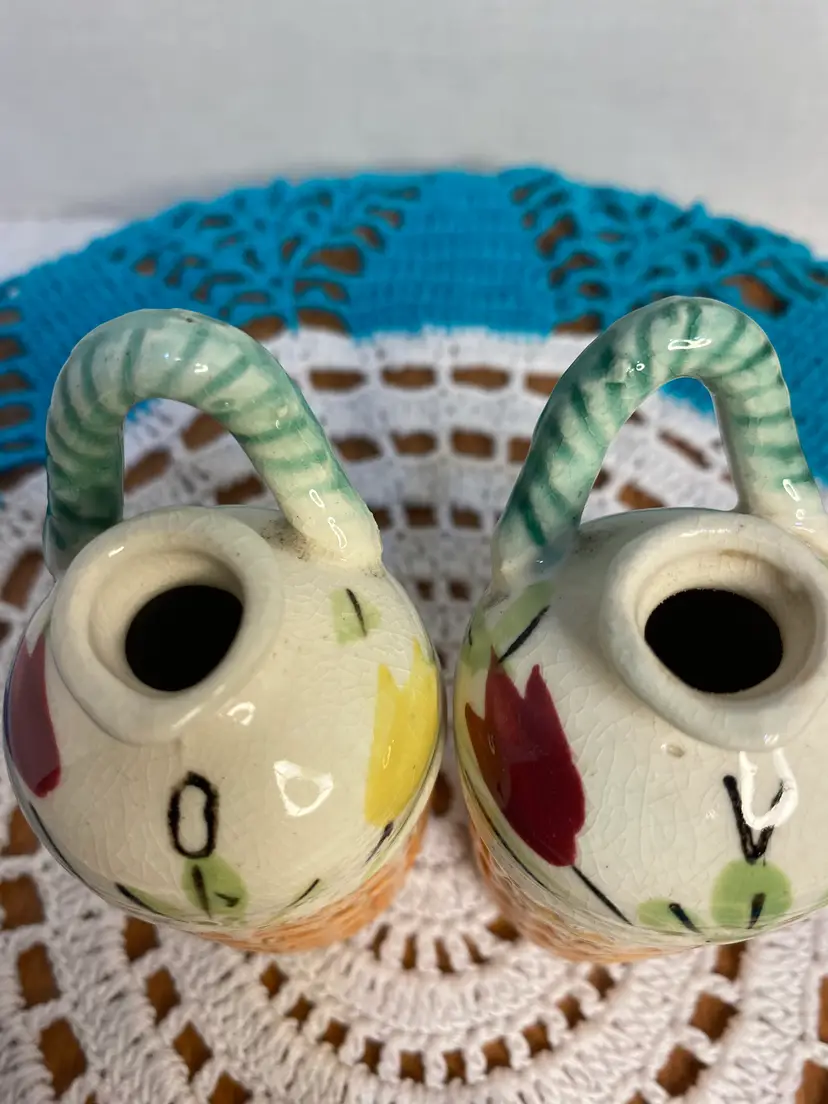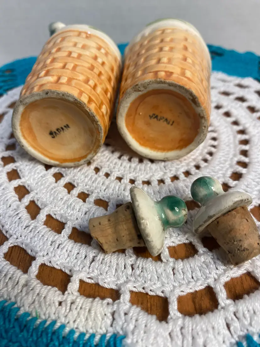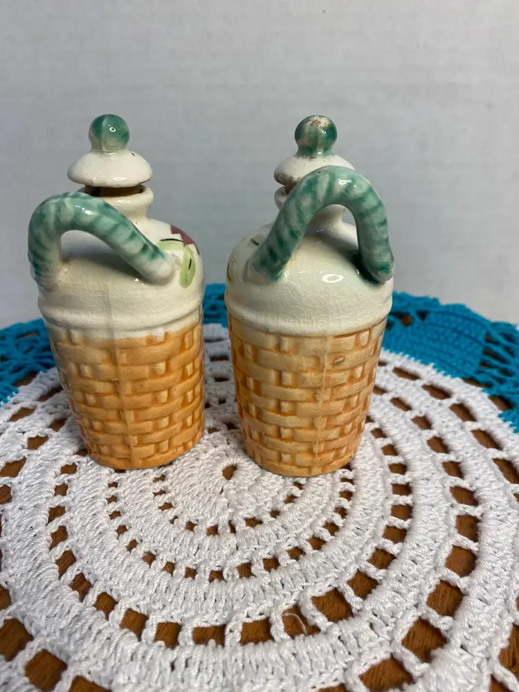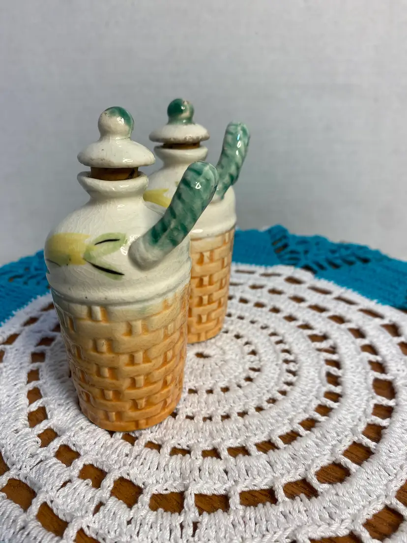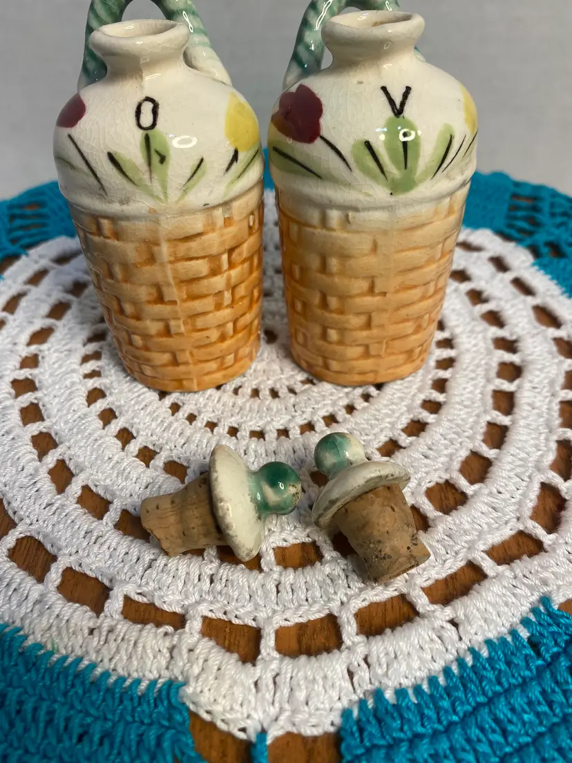 No chips or cracks, has original corks in stoppers. Finish is in good condition. Unique set. Measurements are 3 7/8” tall x 1 1/2” wide.