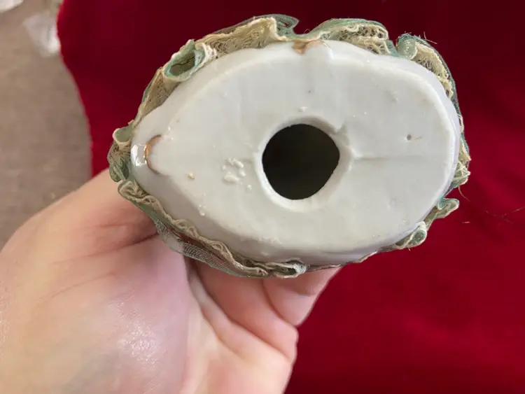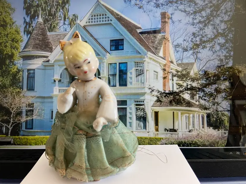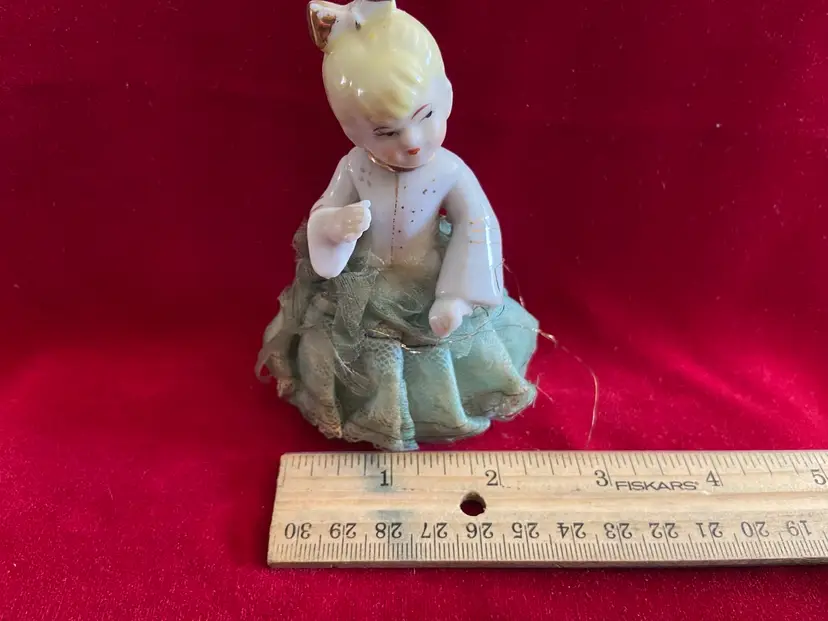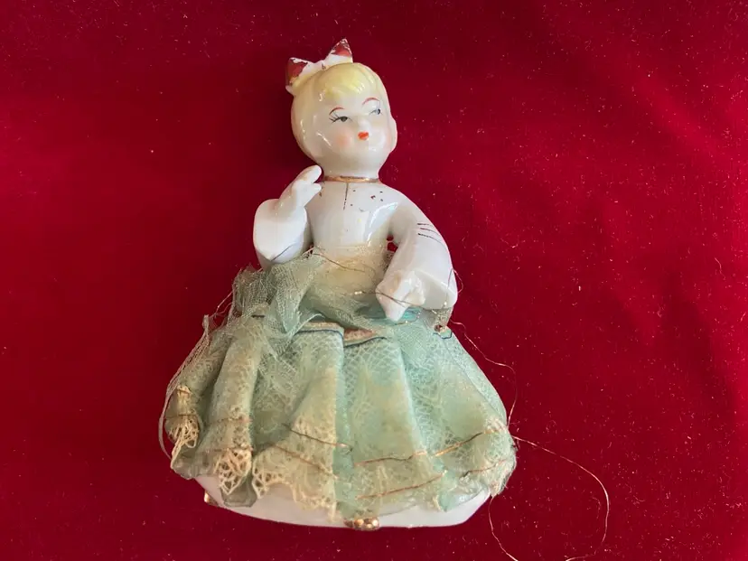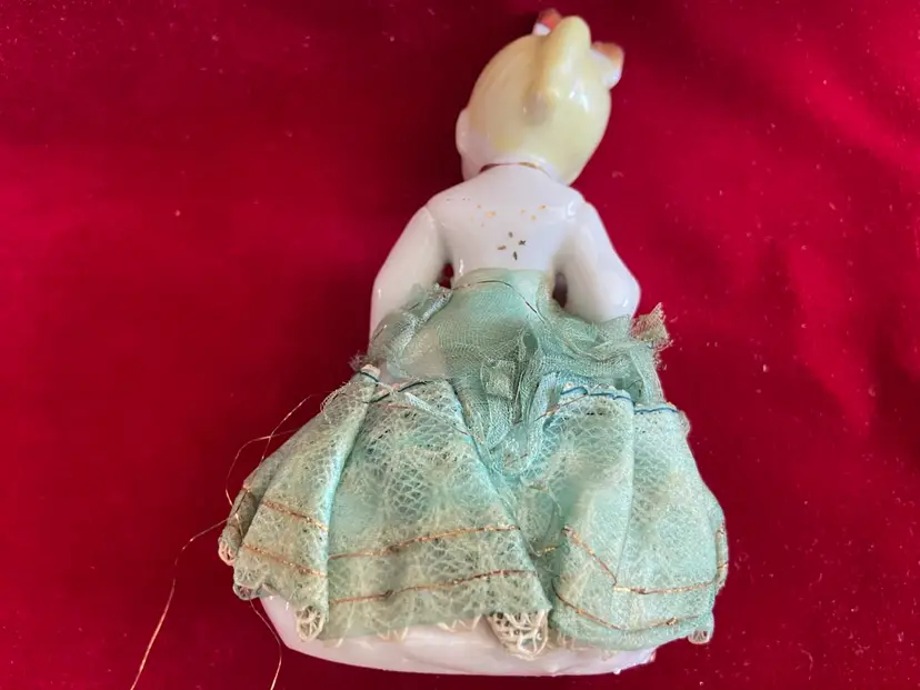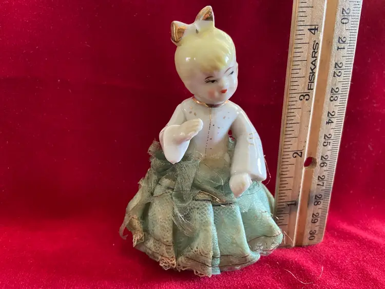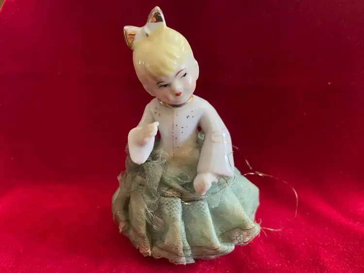 Vintage porcelain figurine of a girl with a ponytail and a green lace and net skirt, likely made in Japan in the 1950s