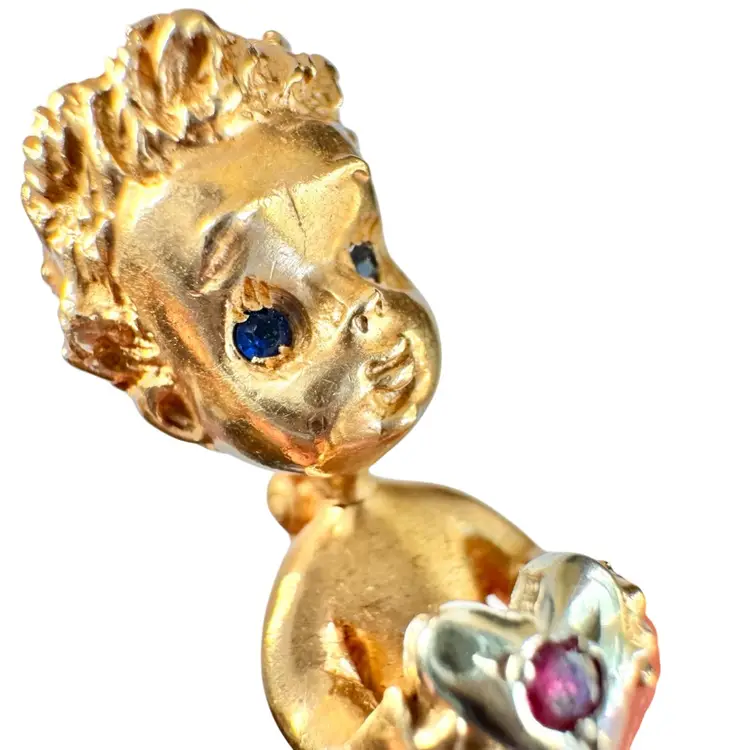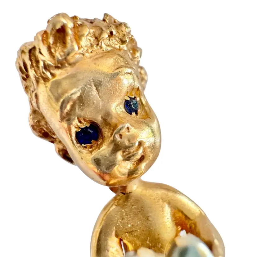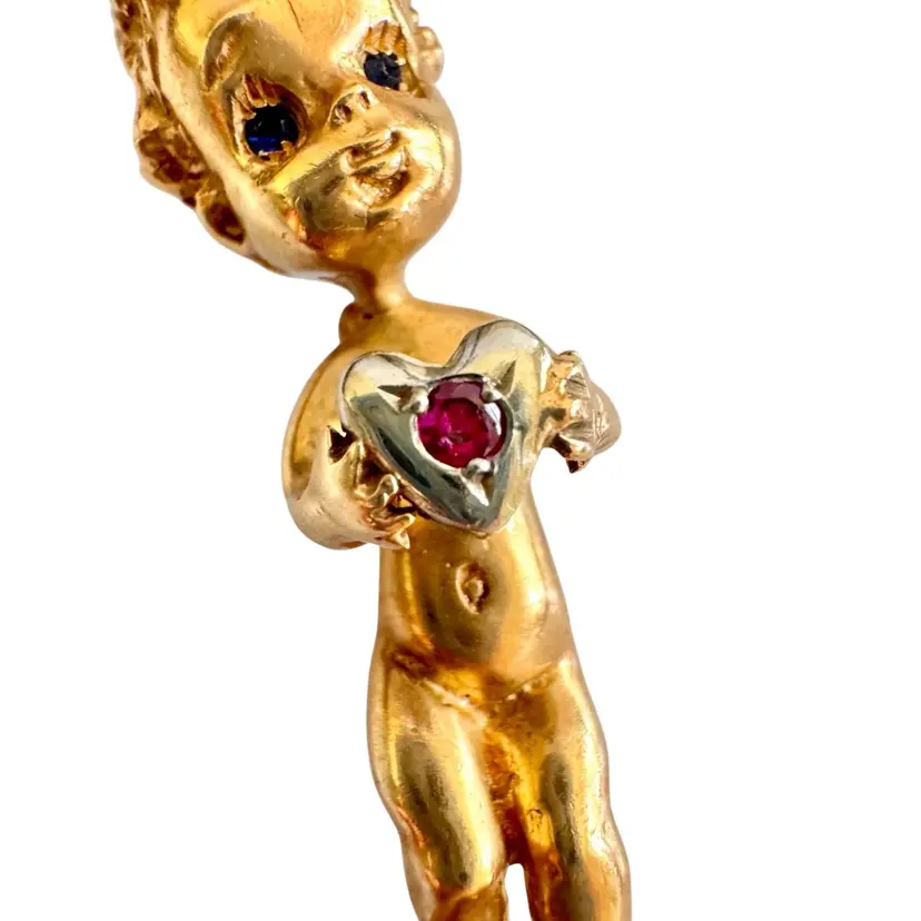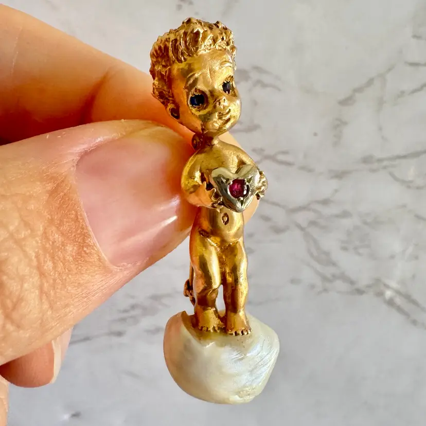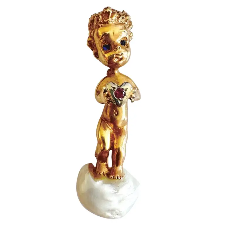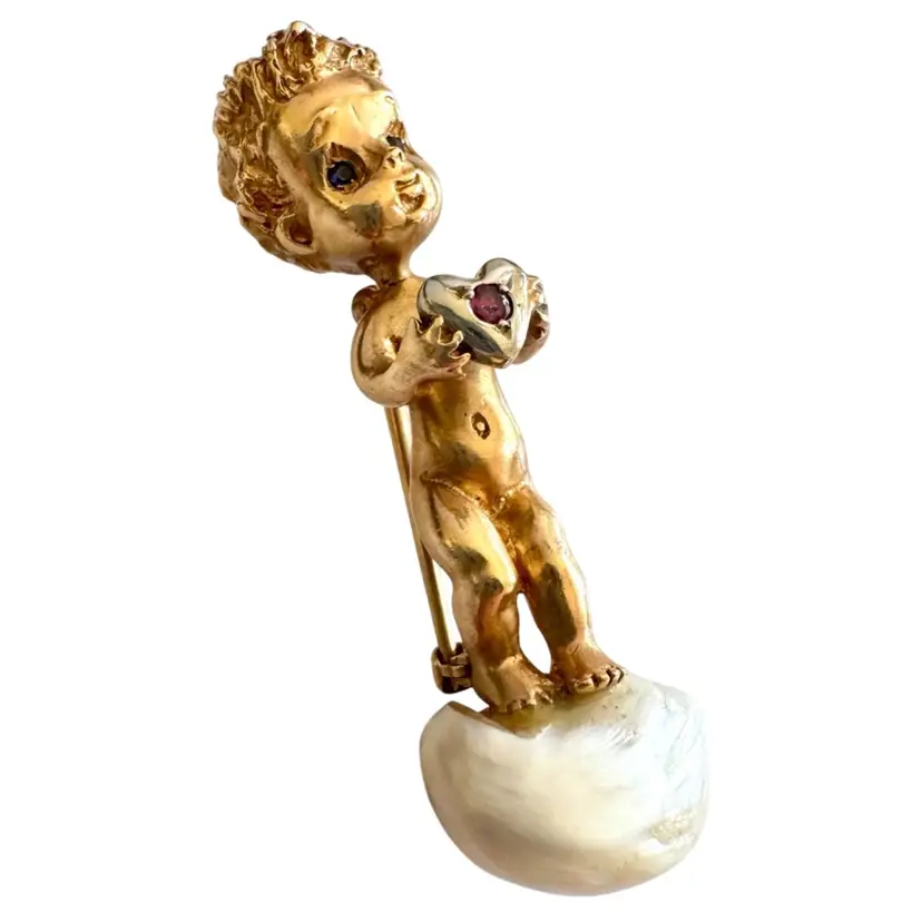 This exquisite vintage brooch by William Ruser depicts a charming cherub or child figure in solid 14K gold, standing atop a freshwater pearl with expressive blue sapphire eyes and holding a silver heart centered with a ruby, symbolizing love and whimsy. William Ruser (1908-1994) was an American jewelry designer who began his career in 1925, eventually opening a Beverly Hills boutique in 1947 where he crafted playful, sculptural pieces that became favorites among Hollywood celebrities like Elizabeth Taylor and Joan Crawford during the 1950s and 1960s. A rare and valuable collector’s item, perfect for vintage jewelry enthusiasts or those seeking a piece of mid-century glamour.
