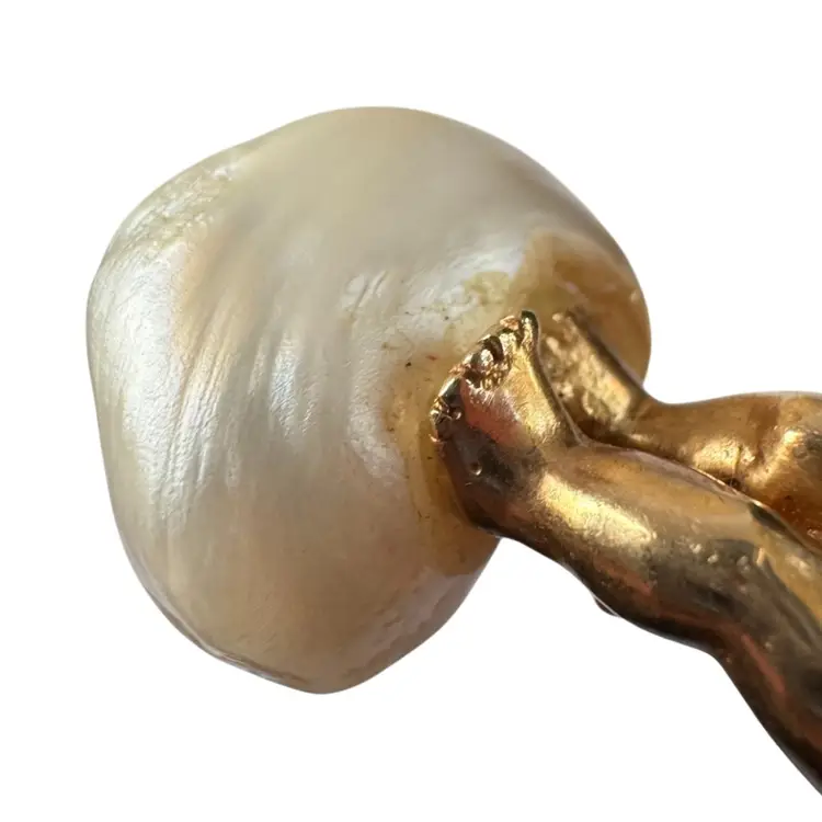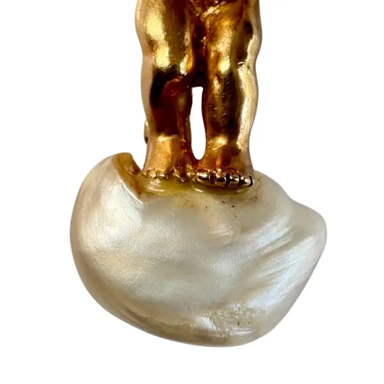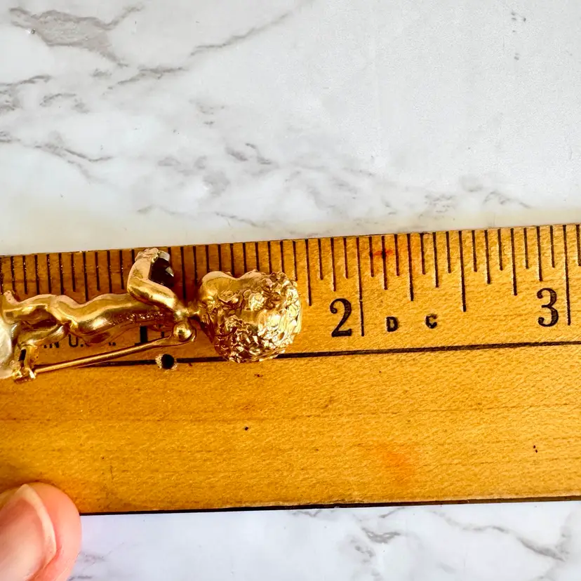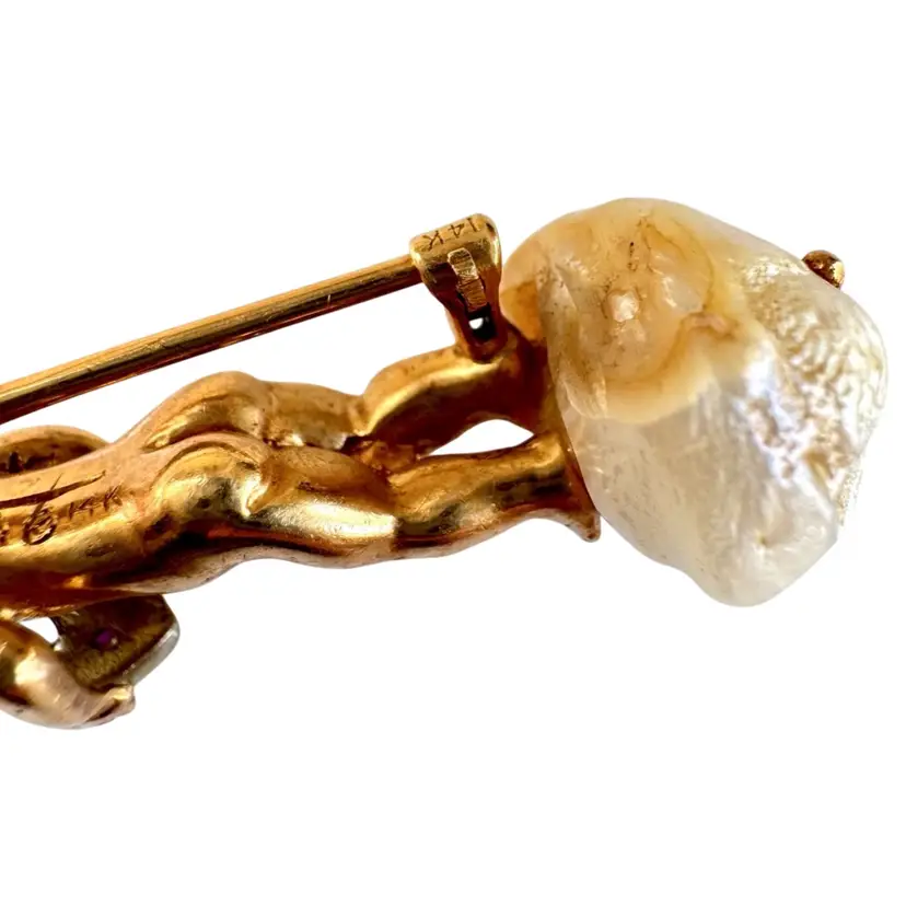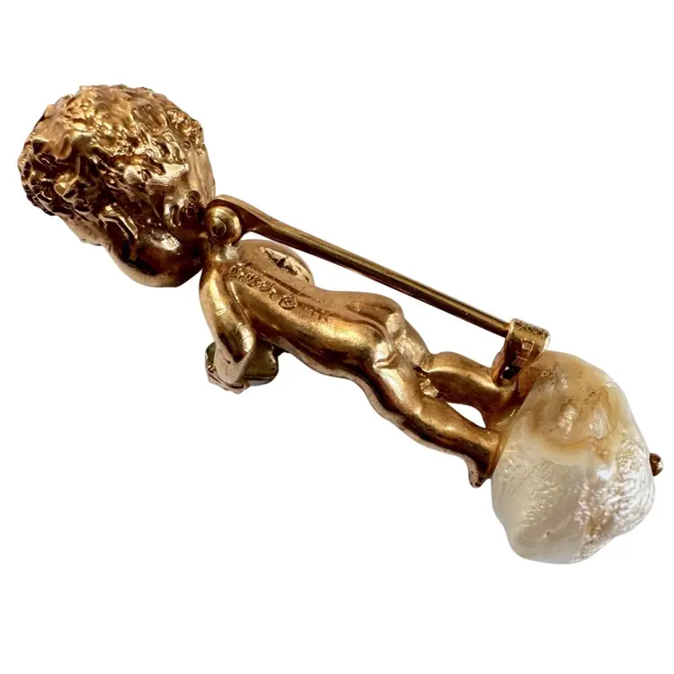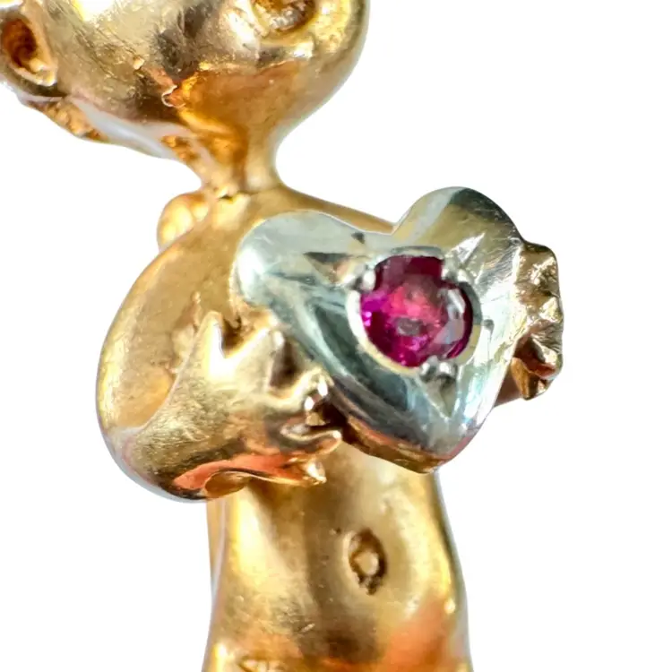 This exquisite vintage brooch by William Ruser depicts a charming cherub or child figure in solid 14K gold, standing atop a freshwater pearl with expressive blue sapphire eyes and holding a silver heart centered with a ruby, symbolizing love and whimsy. William Ruser (1908-1994) was an American jewelry designer who began his career in 1925, eventually opening a Beverly Hills boutique in 1947 where he crafted playful, sculptural pieces that became favorites among Hollywood celebrities like Elizabeth Taylor and Joan Crawford during the 1950s and 1960s. A rare and valuable collector’s item, perfect for vintage jewelry enthusiasts or those seeking a piece of mid-century glamour.