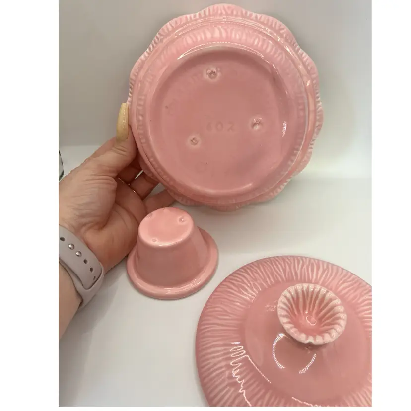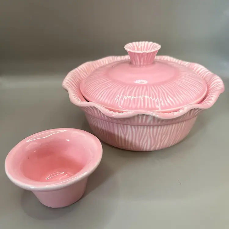 Perfect pink Miramar of California pottery dish with matching votive holder. Made in 1956, #602. Features a gorgeous ruffled edge and stylish natural striped texture pattern. Backstamped with maker.