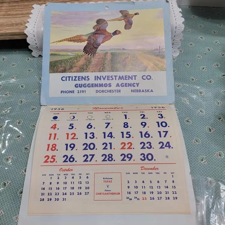 Step back in time with this charming 1956 advertising calendar from Citizens Investment Co. in Dorchester, Nebraska. Featuring vibrant illustrations of pheasants in flight, this piece is perfect for collectors or adding a nostalgic touch to your decor. Please note, this item is vintage and may show signs of wear, adding to its authentic charm. Feel free to reach out for more details or photos!