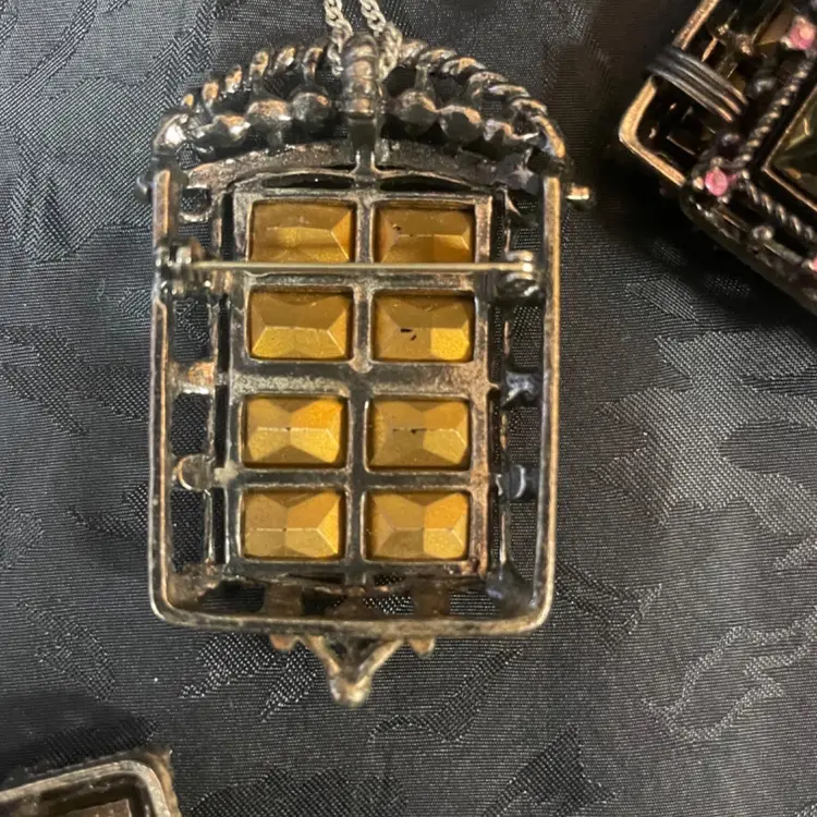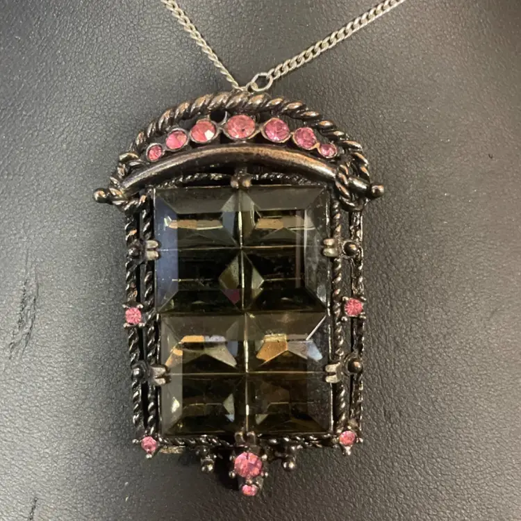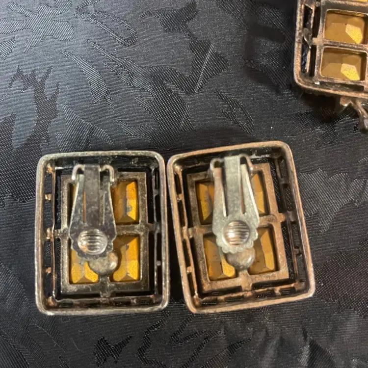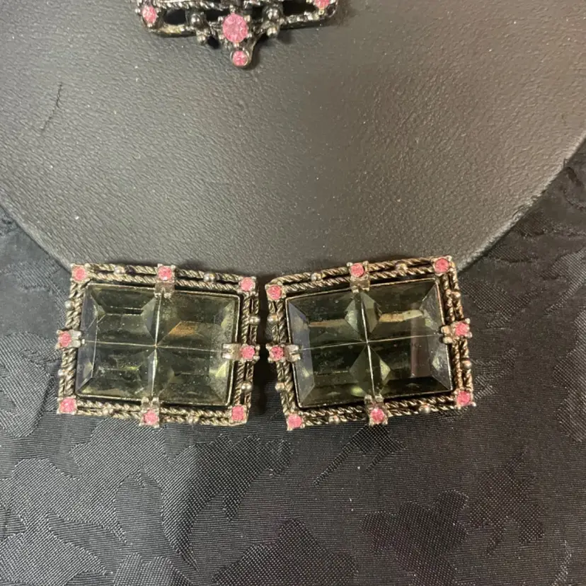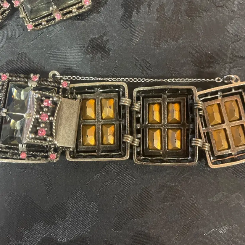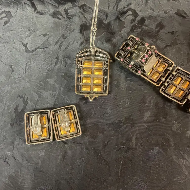 Fabulous Sarah Coventry Midnight Magic three piece set. Clip on earrings, brooch/pendant on chain marked sterling, and bracelet. The earrings measure 1.25” long x 1” wide The pendant/brooch measures 2.5” long x 1.5” wide on a chain marked sterling that when stretched measures 22” long The bracelet is 7.5” long and has a chain protector to keep the bracelet from falling off.