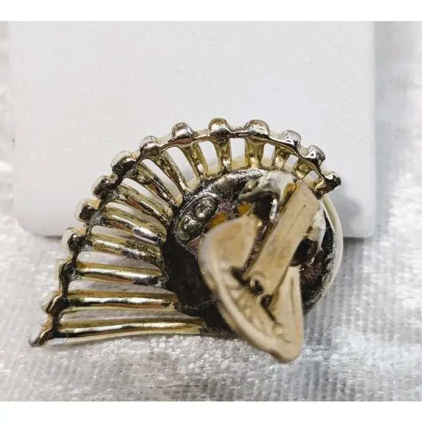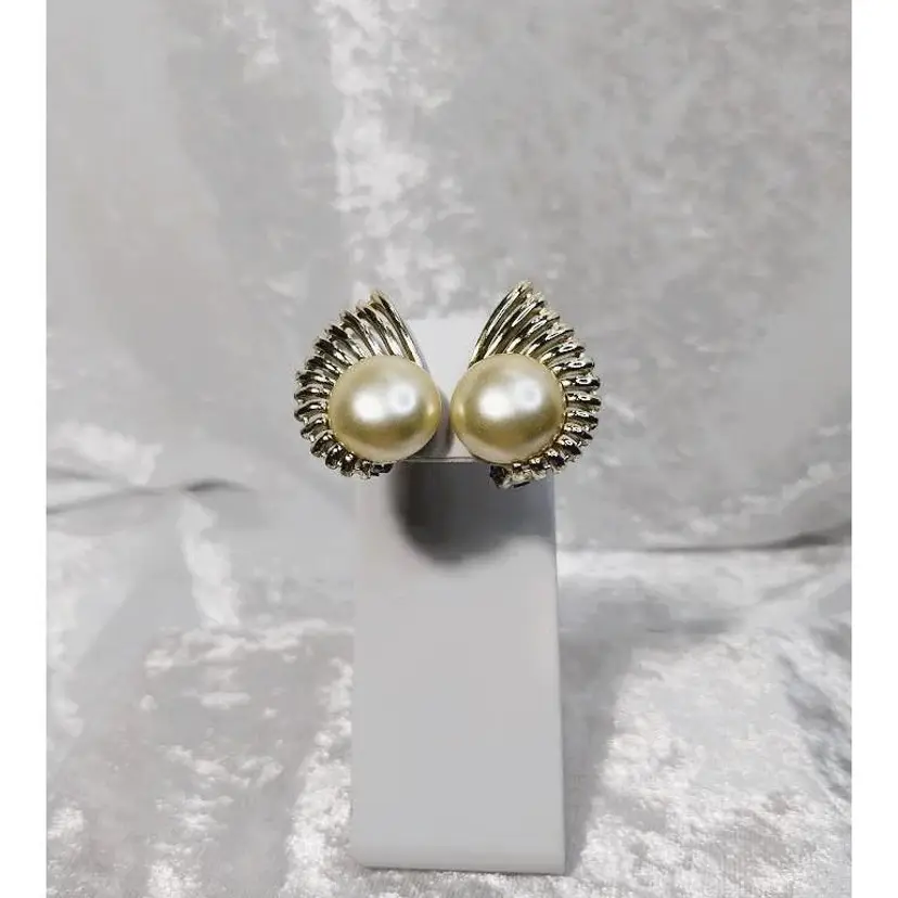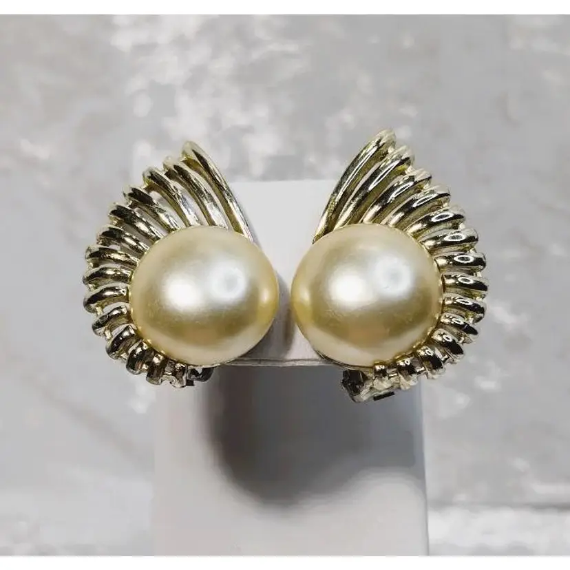 These stunning Sarah Coventry clip on earrings are named "Pearl Flight" and were introduced in 1956. These earrings each feature 1 large faux pearl dome on a gold-tone setting. The open work setting surrounds the pearls in a wing-like fashion. The earring are marked SC on the back of the earrings. They measure approximately 1¼” H x 7/8” at the widest point and close with paddle back clips. These earrings are in excellent pre-owned vintage condition.