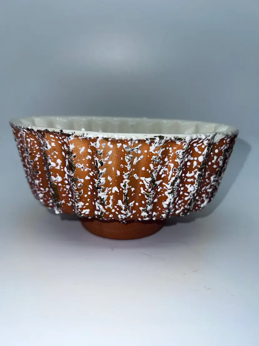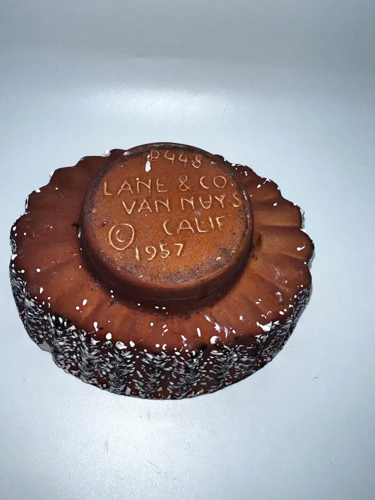 This unusual design is from 1957 Lane & Co Pottery dish Planter is from Van Nuys, California. It is stamped P4448 and has a unique design. It does have a small chip on the side which blends in but please see pictures for better view. Weight 13 oz 3.25” height 5” width 6.5” length