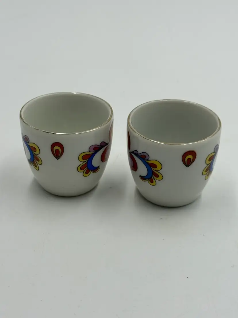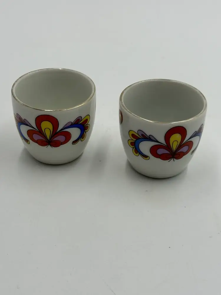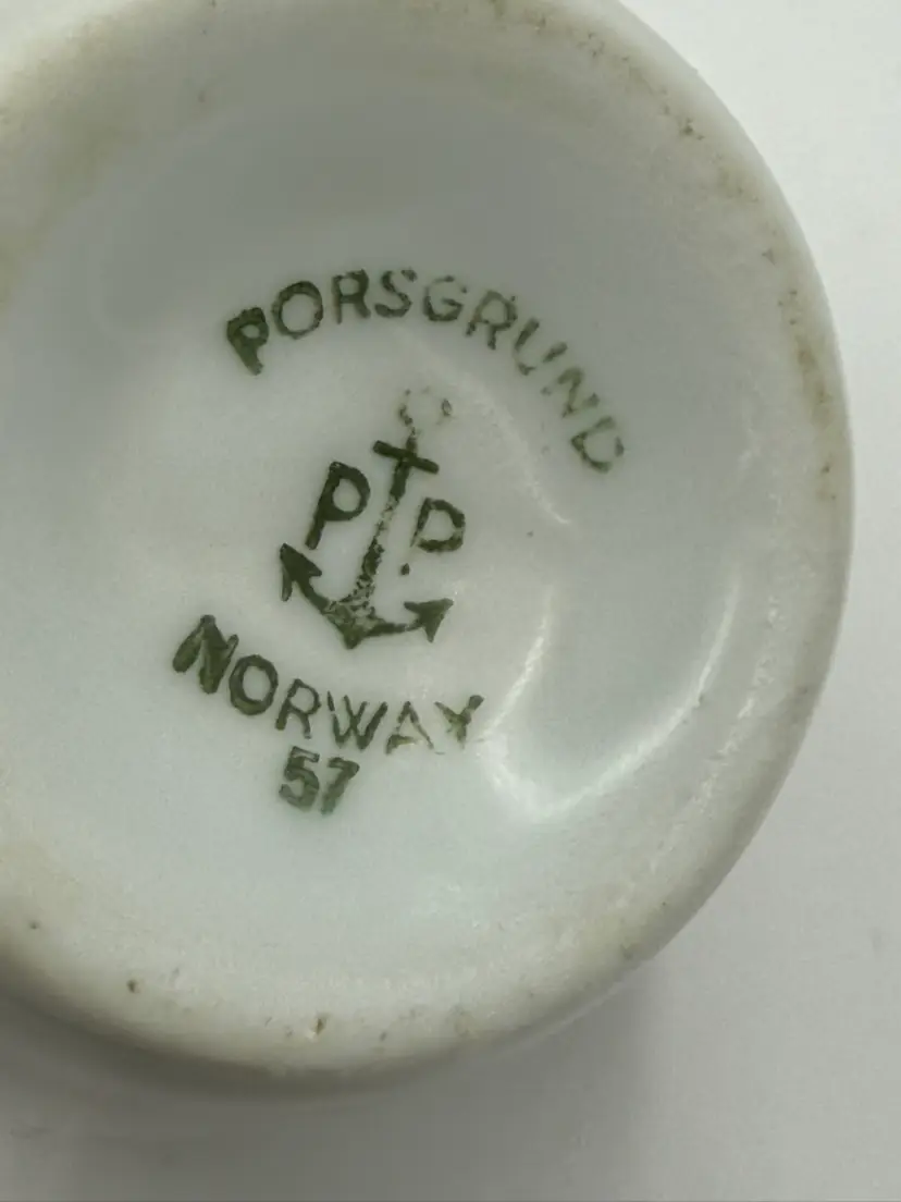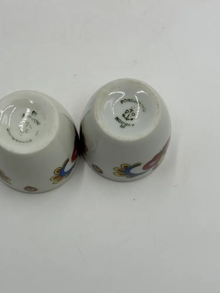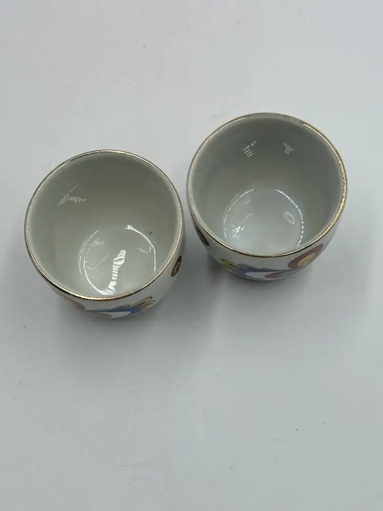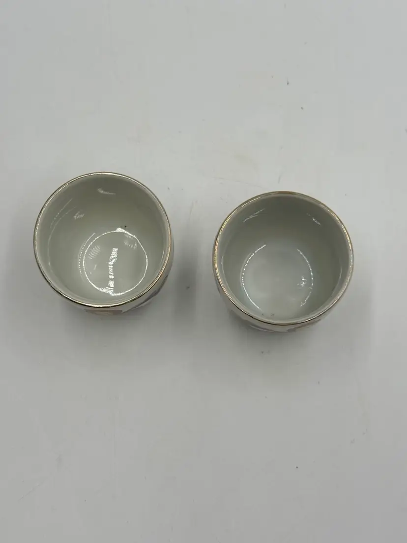 In good condition. Does not have any chips or cracks. There is some wear on the gold trim. Measures 1 3/4 inches tall and 1 3/4 inches in diameter.