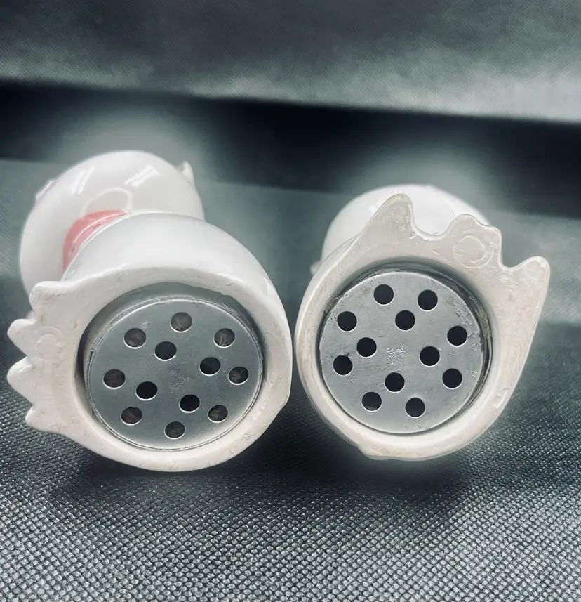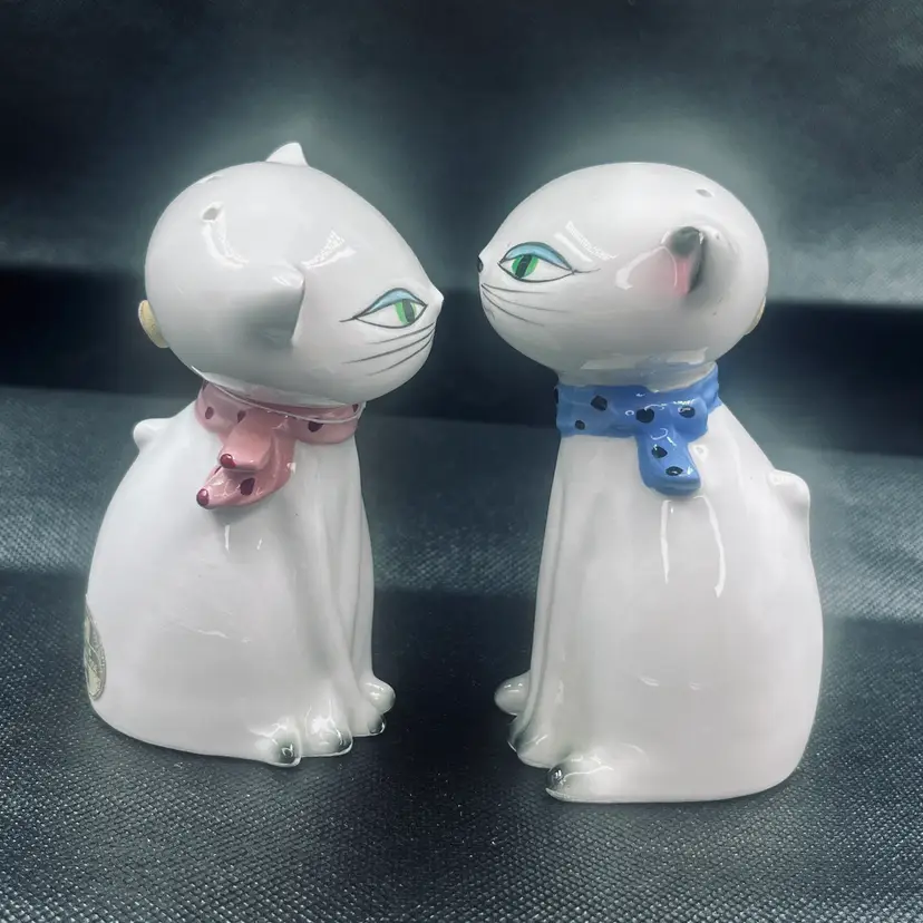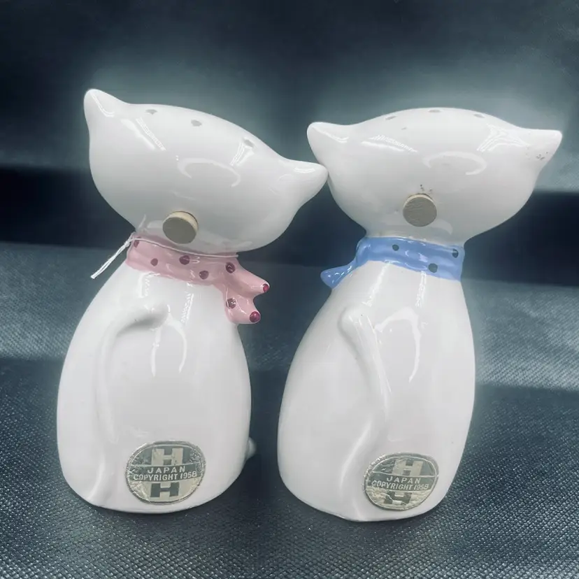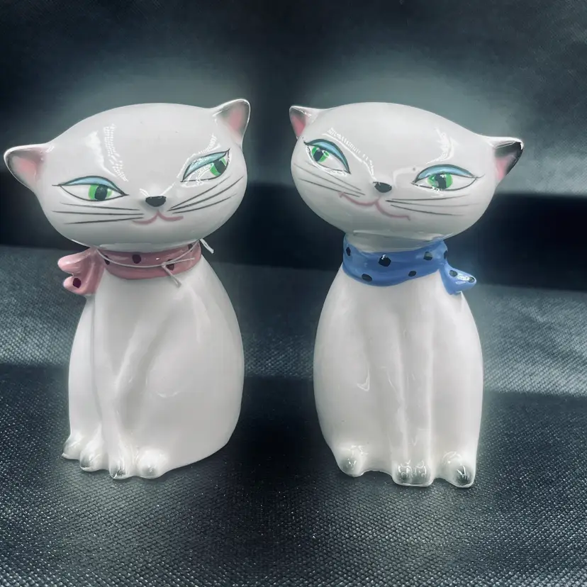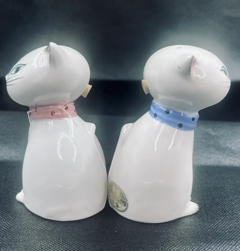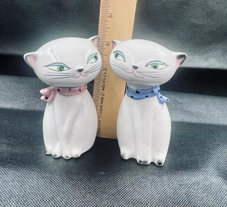 Yay - Holt Howard wonderfulness. These sweet kitties are so cute and highly collectible. They have bright green eyes and hnd painted details.Whimsical and functional. Great condition. No chips or cracks. Noise makers are still in the cats but they are no longer operational due to age.