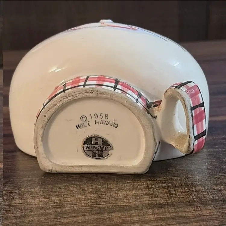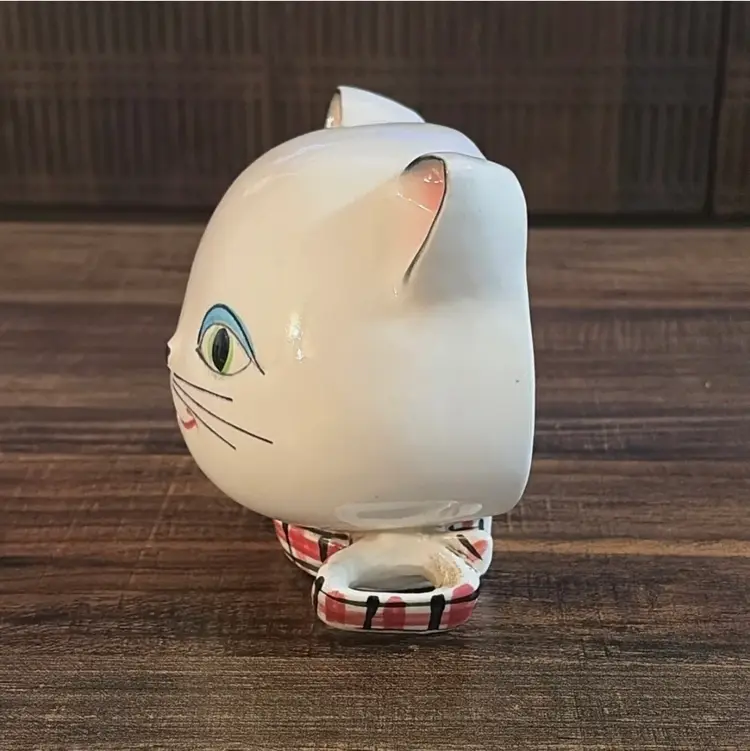 Vintage Holt Howard Kozy Kitten String & Scissors Holder from 1958, a charming Mid-Century Modern kitchen collectible. This adorable ceramic kitten was designed to hold a ball of kitchen twine inside the body, with the string feeding through the front and scissors stored neatly in the side holder. A classic and highly collectible piece from Holt Howard’s famous Kozy Kitten line. These whimsical kitchen pieces were popular in the 1950s and remain favorites among Holt Howard collectors, cat lovers, and Mid-Century decor enthusiasts.