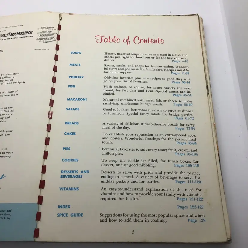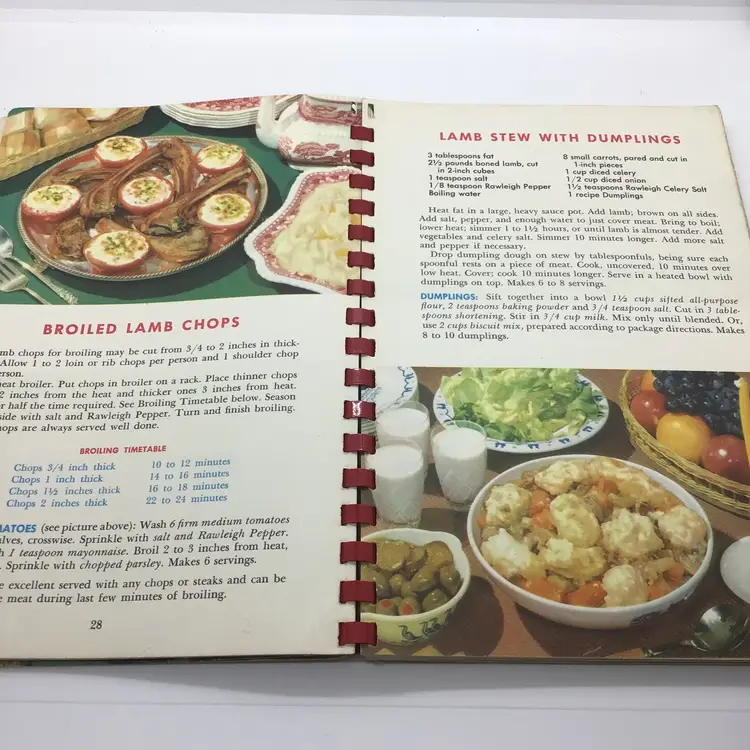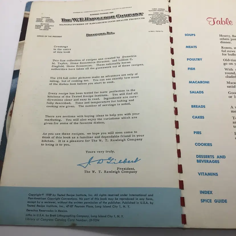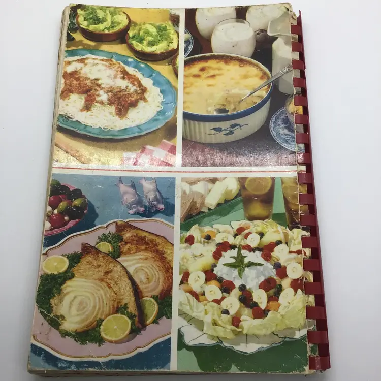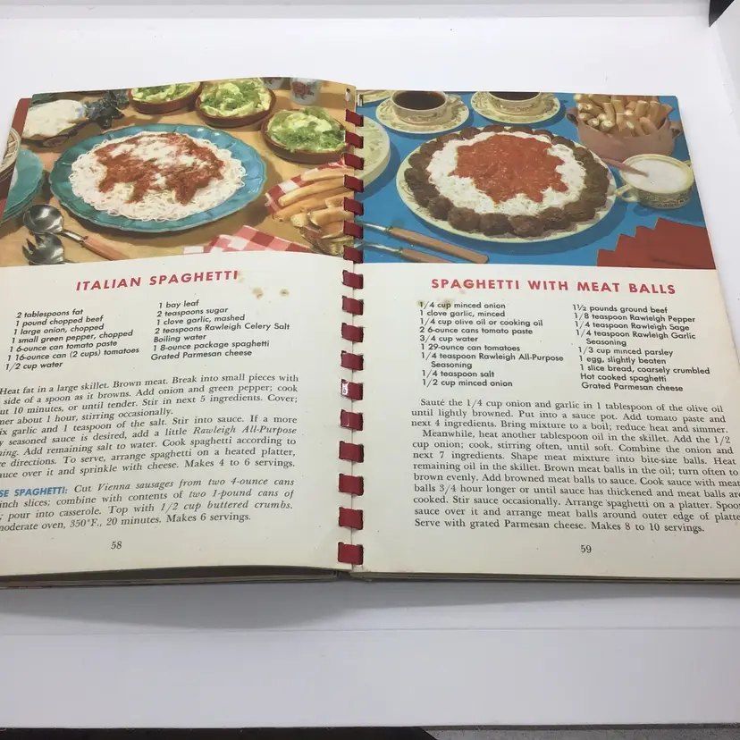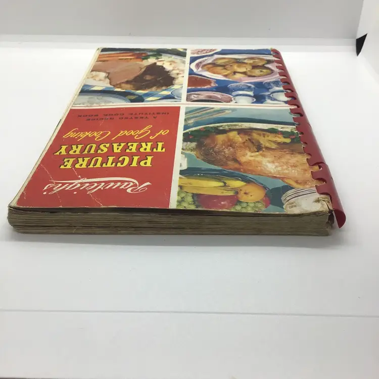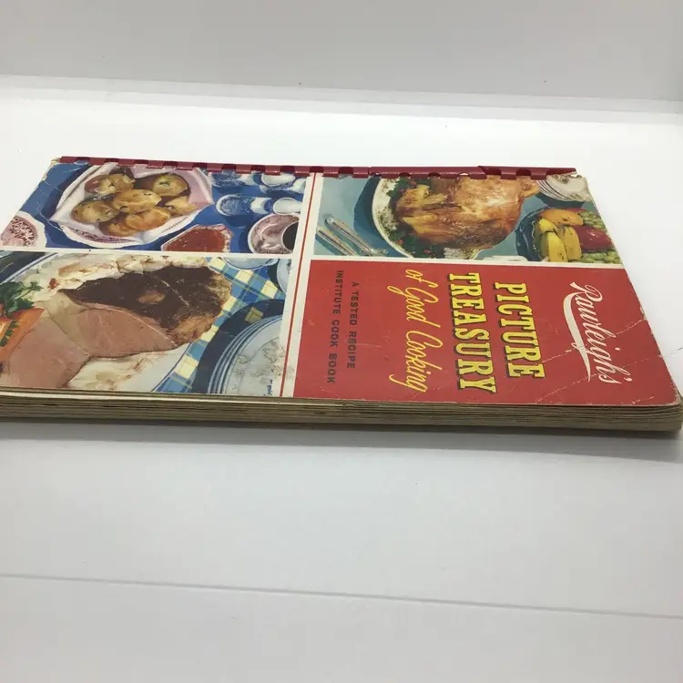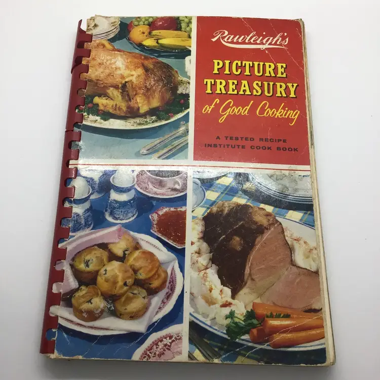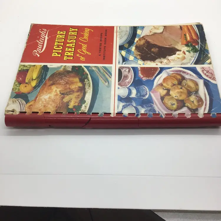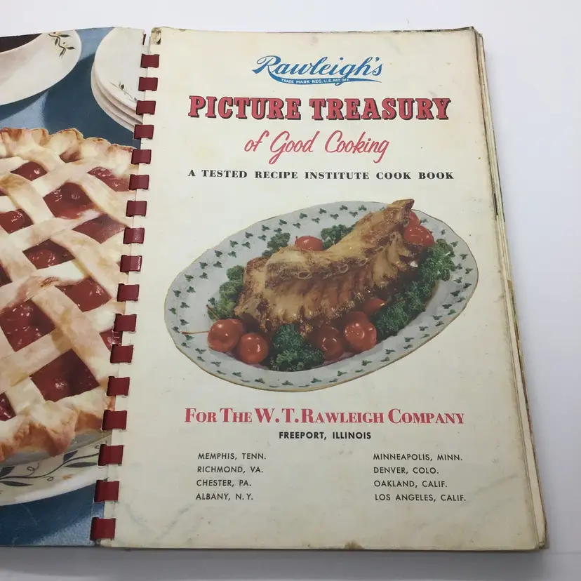 Vintage 1959 Rawleigh's Picture Treasury of Good Cooking Book Cookbook. There is some wear to this cookbook. The plastic finding is cracked in three places, but it still holds the book together just fine. There is page edgewear. There are some light stains in the cookbook but everything is readable. There are color pictures. This item is from 1959 and it comes from a non-smoking home.