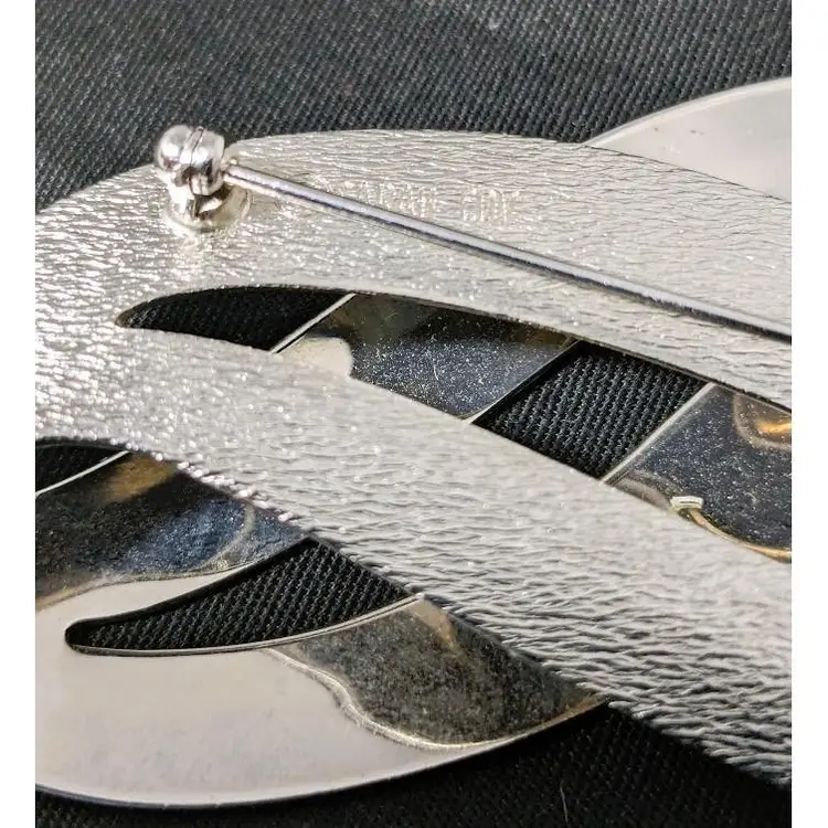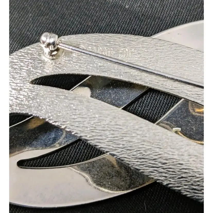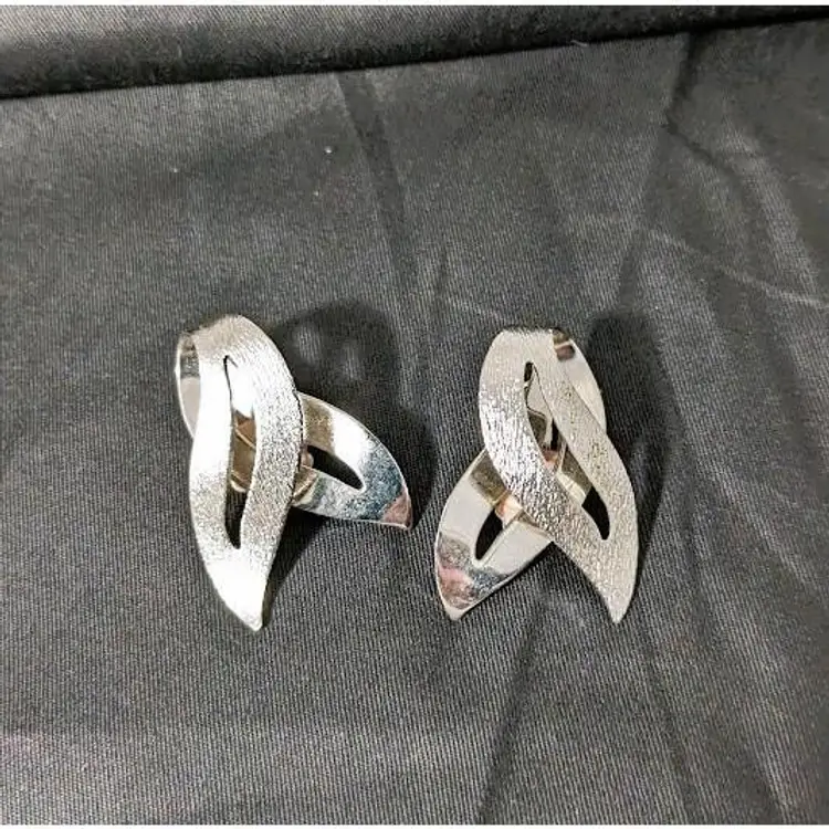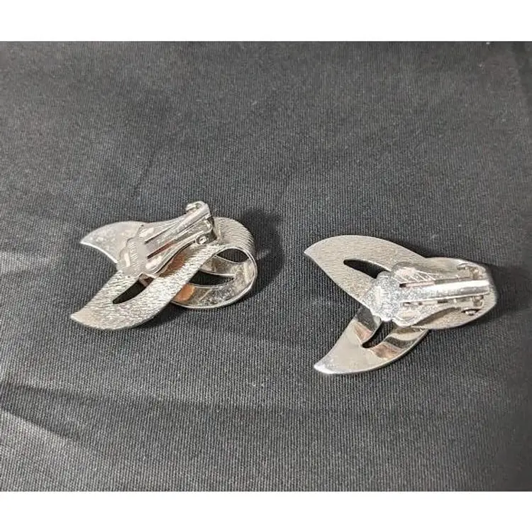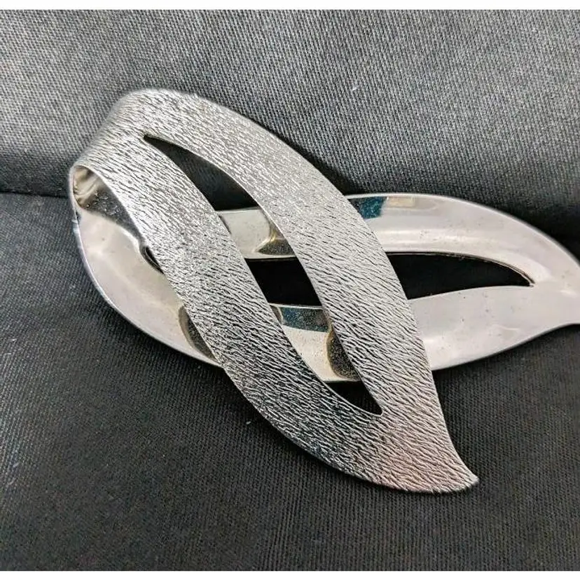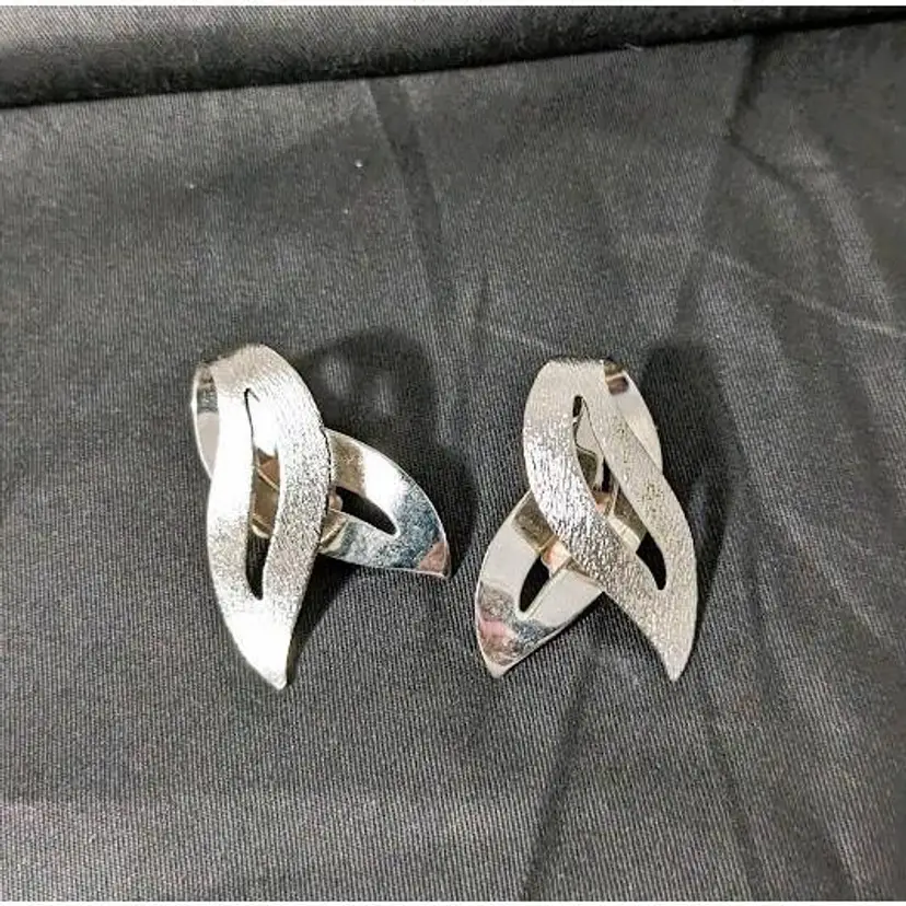This Sarah Coventry set is called Satin Flame and was introduced in 1960. The Brooch is large, approximately 3 1/2" x 1 3/4" and features both brushed and polished overlapping flames in a beautiful design. The clip on earrings are the same design and are approximately 1 1/2" long. All pieces have the Sarah Coventry markings. All pieces are in excellent condition considering their age - no nicks or scratches.