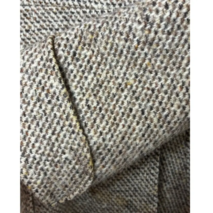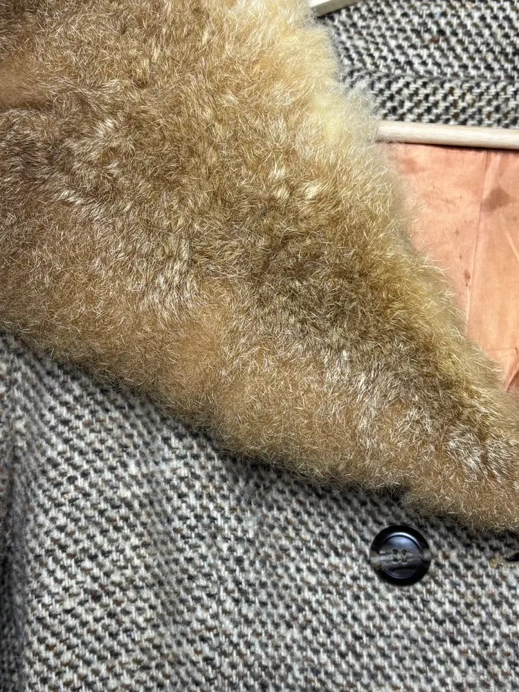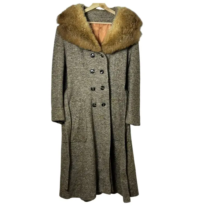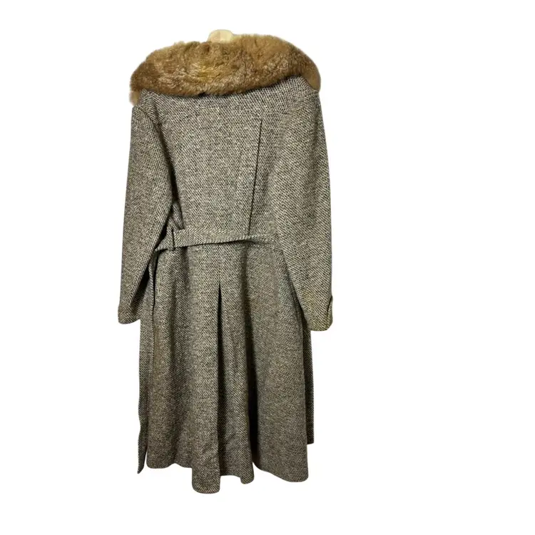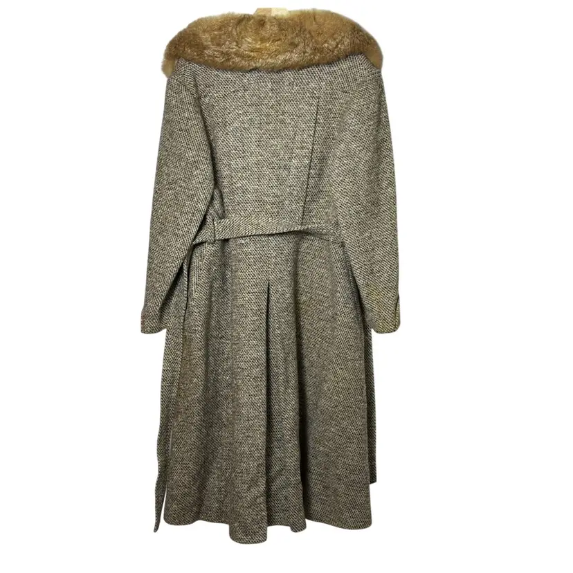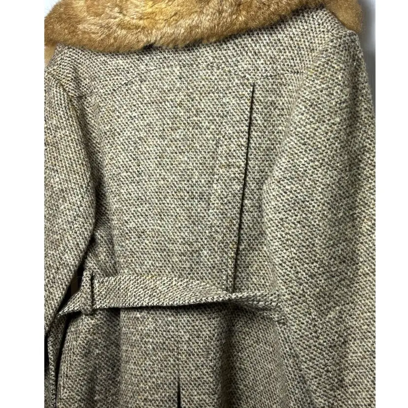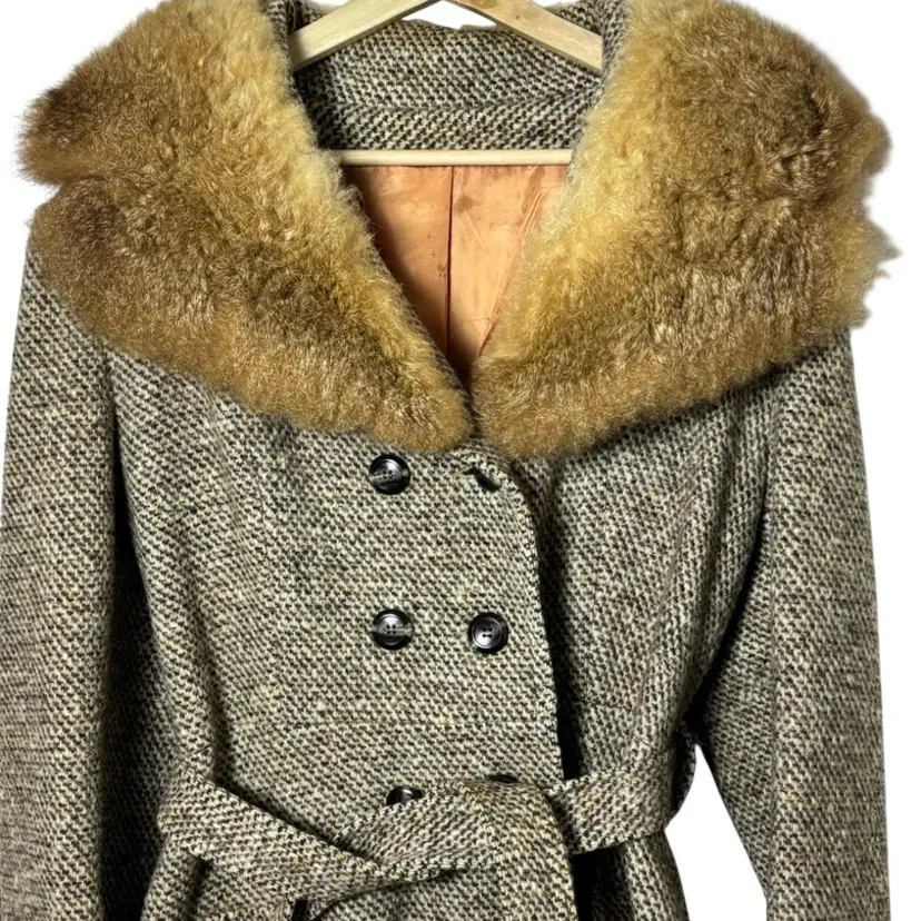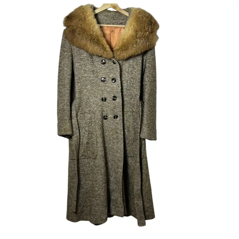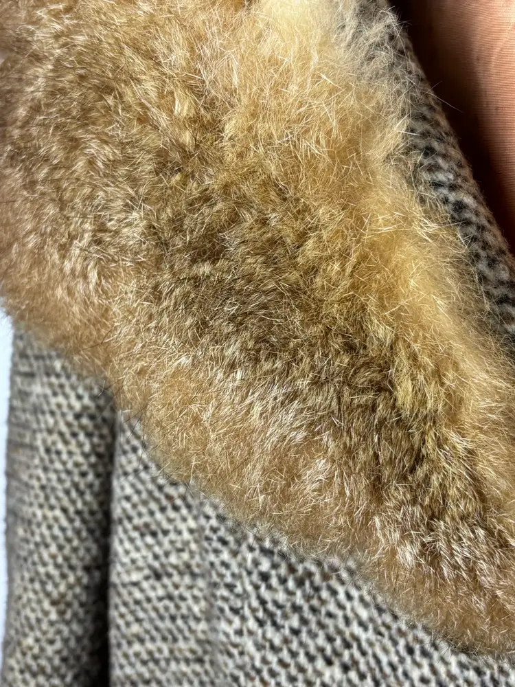 Beautiful vintage tweed coat dating to the late 1960s–early 1970s, featuring a classic full-length belted silhouette and a dramatic genuine fur collar (fur type not specified, likely rabbit). The coat measures approximately 21” pit to pit (about a 42” bust), 23” sleeve length, and 45” from shoulder to hem, fitting like a modern women’s Medium or Small, with room for light layering.