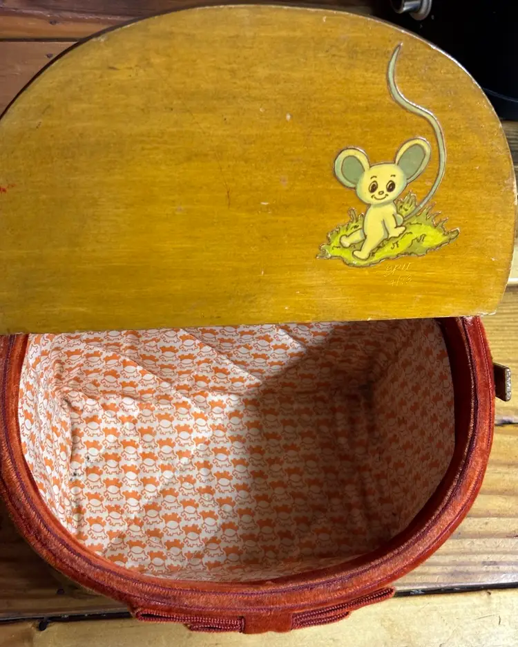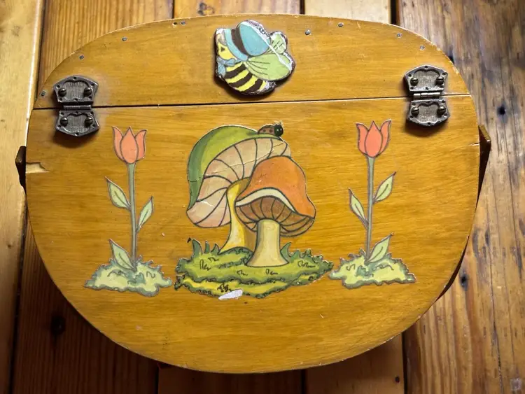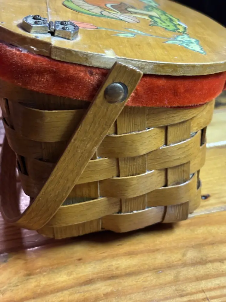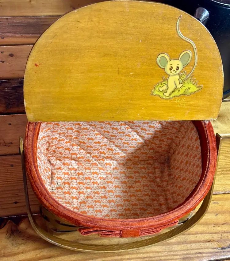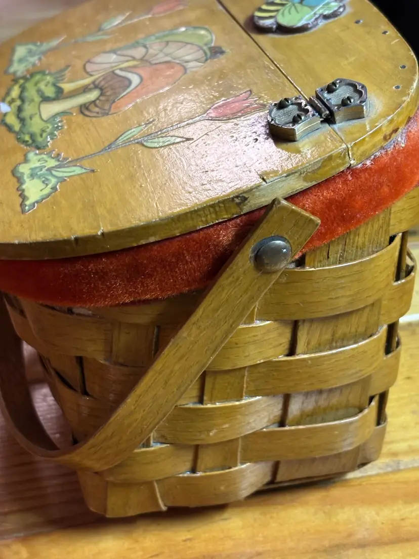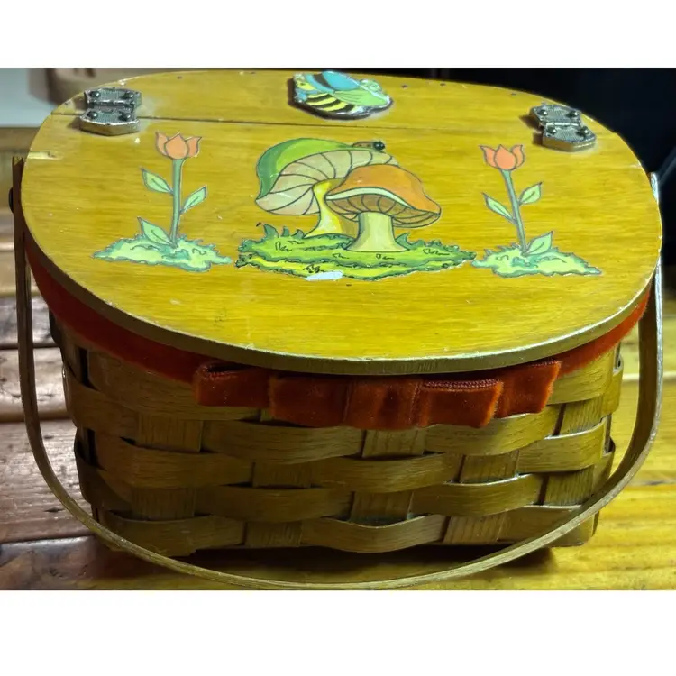 Approx. 8.5”x6.5”x6” Vintage wicker basket purse with a wooden lid, from 1973. It is decorated with mushrooms and flowers on the lid and a little mouse on the underside (with GPU initials and 4/73 right under the mouse)giving it a retro, bohemian style. Hinged lid, handle, and a fabric lining inside. Can be used as a purse, sewing basket, or decorative storage container. Adorable puppy dog liner in orange and cream colors