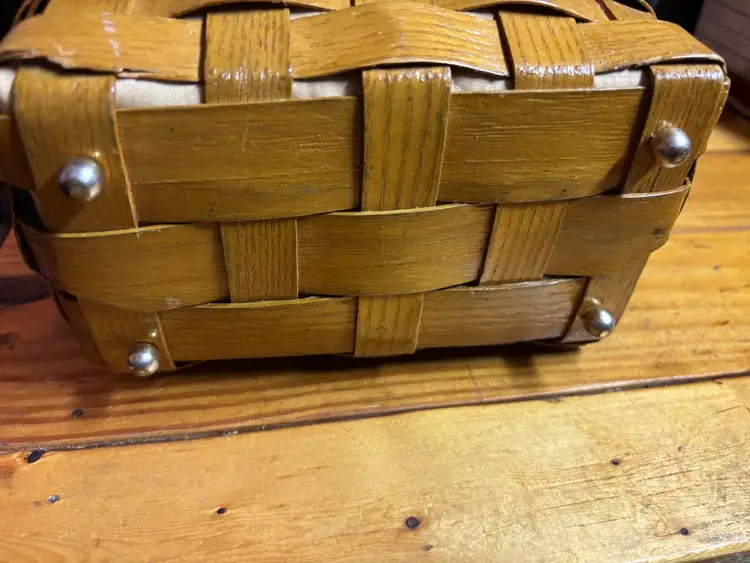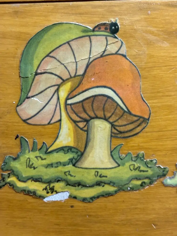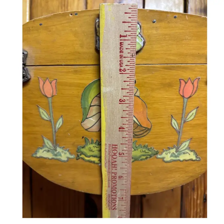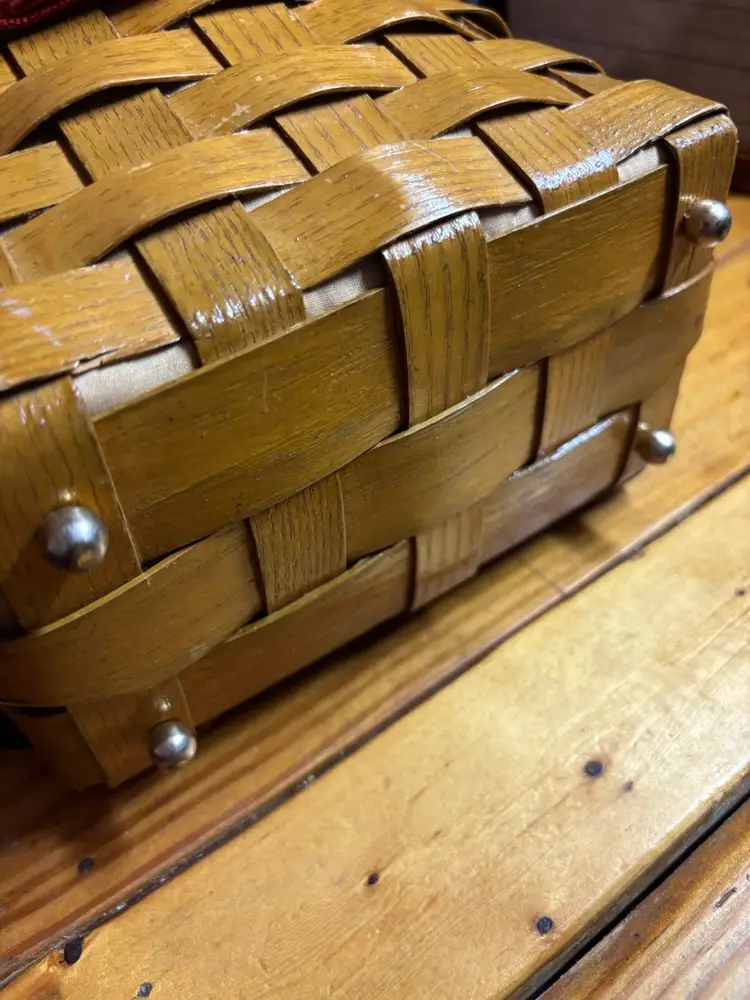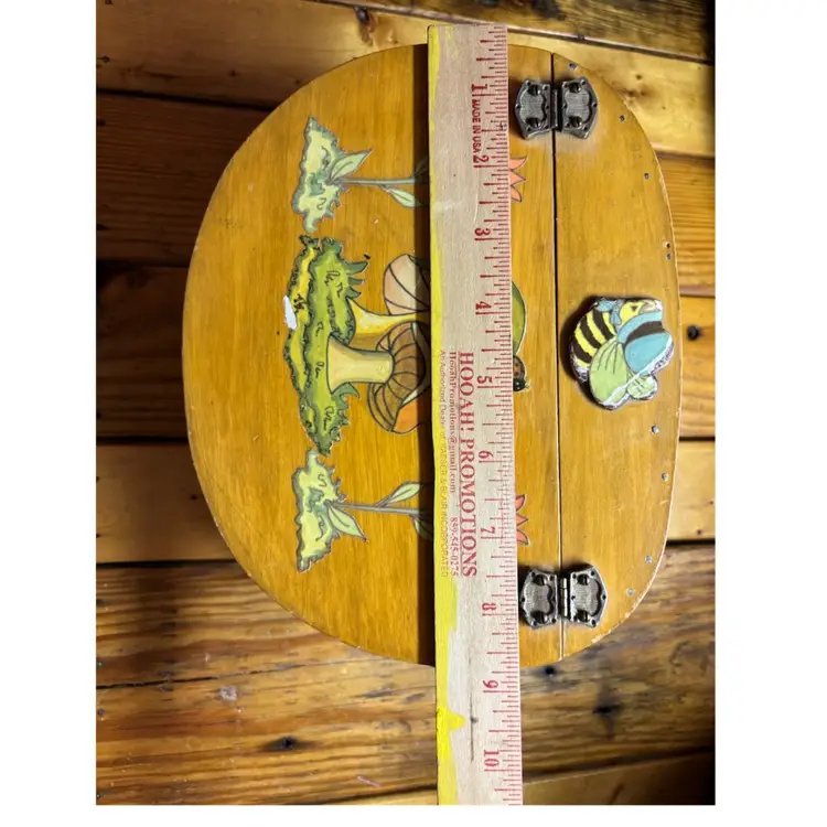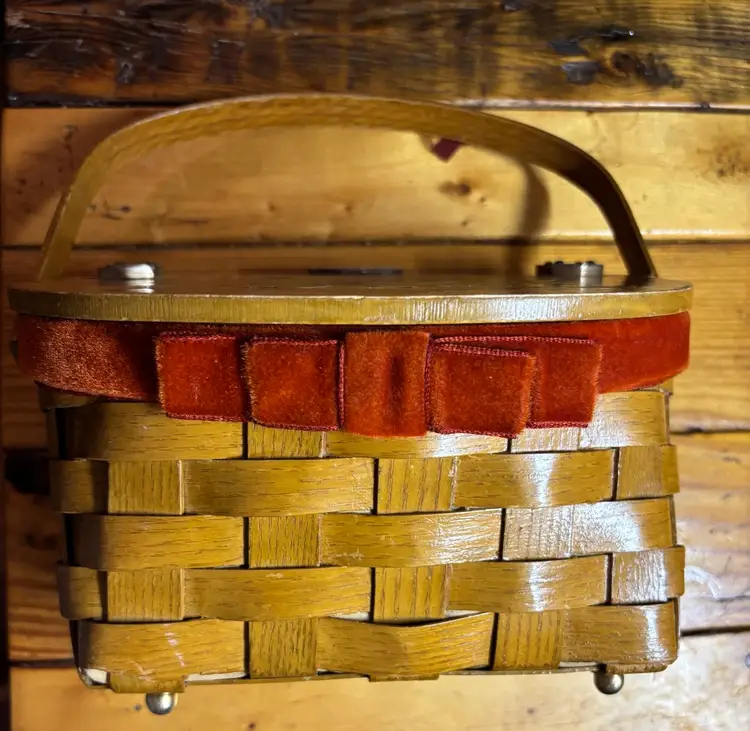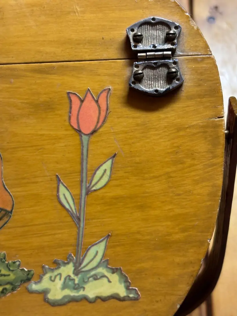 Approx. 8.5”x6.5”x6” Vintage wicker basket purse with a wooden lid, from 1973. It is decorated with mushrooms and flowers on the lid and a little mouse on the underside (with GPU initials and 4/73 right under the mouse)giving it a retro, bohemian style. Hinged lid, handle, and a fabric lining inside. Can be used as a purse, sewing basket, or decorative storage container. Adorable puppy dog liner in orange and cream colors
