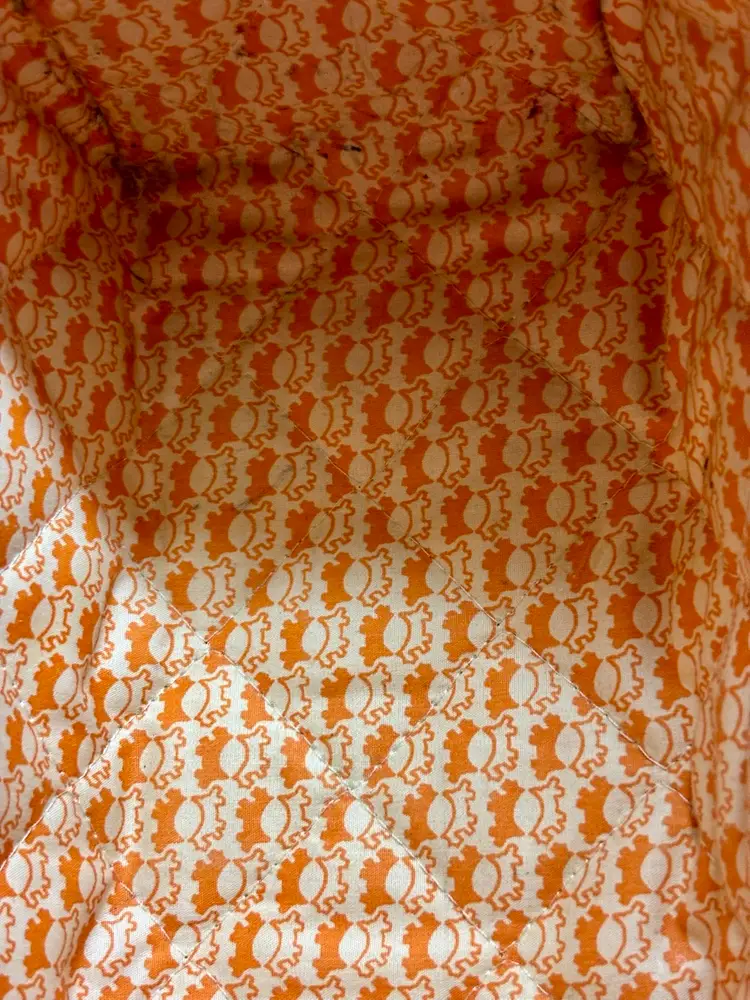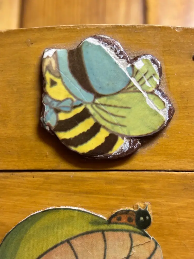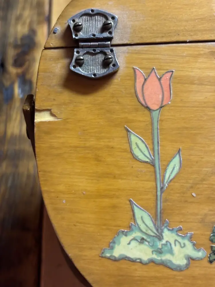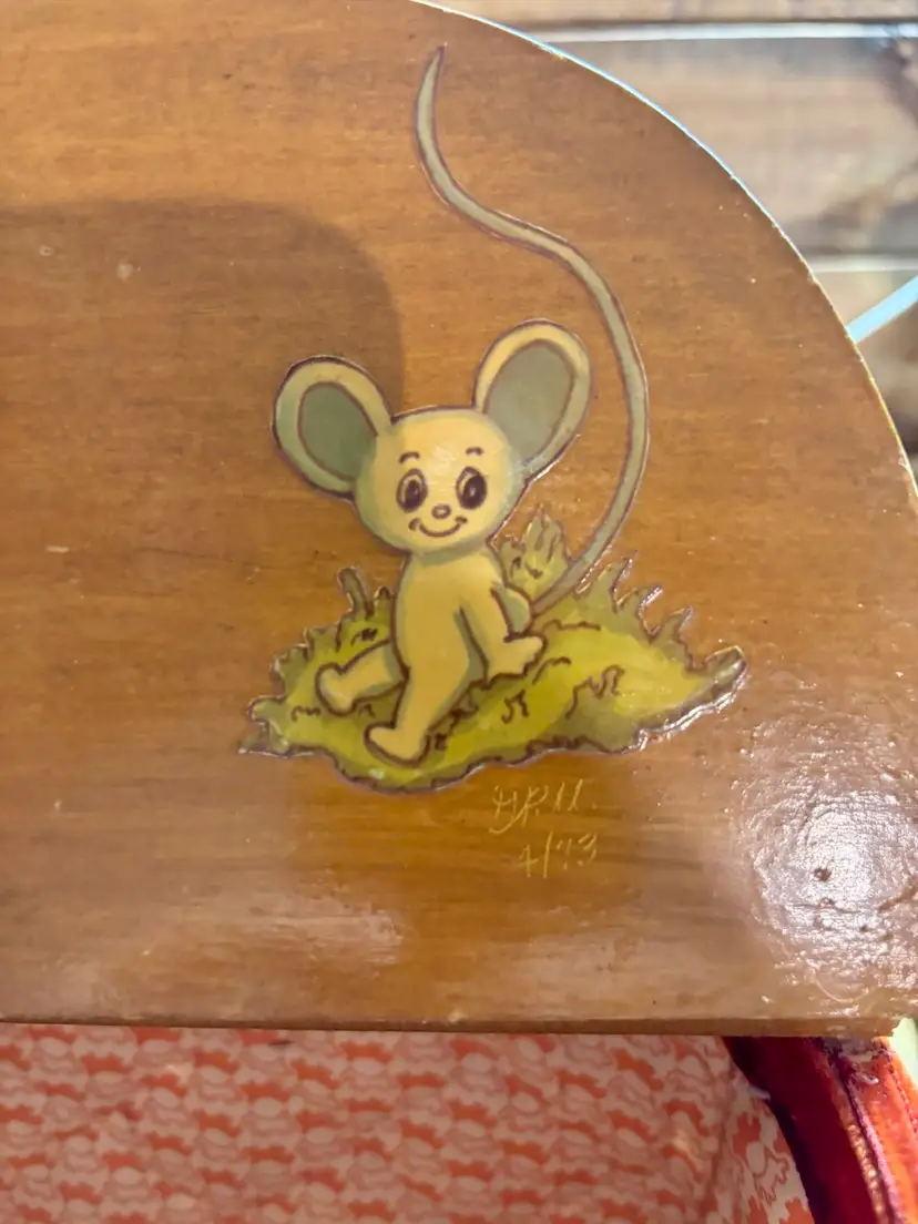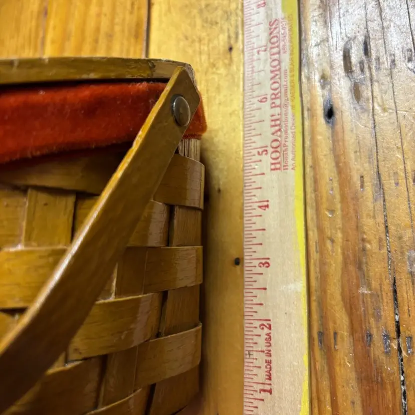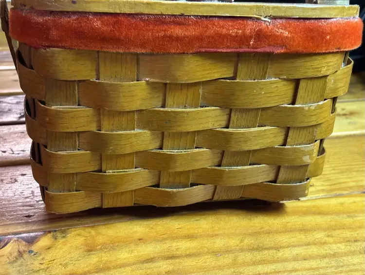 Approx. 8.5”x6.5”x6” Vintage wicker basket purse with a wooden lid, from 1973. It is decorated with mushrooms and flowers on the lid and a little mouse on the underside (with GPU initials and 4/73 right under the mouse)giving it a retro, bohemian style. Hinged lid, handle, and a fabric lining inside. Can be used as a purse, sewing basket, or decorative storage container. Adorable puppy dog liner in orange and cream colors