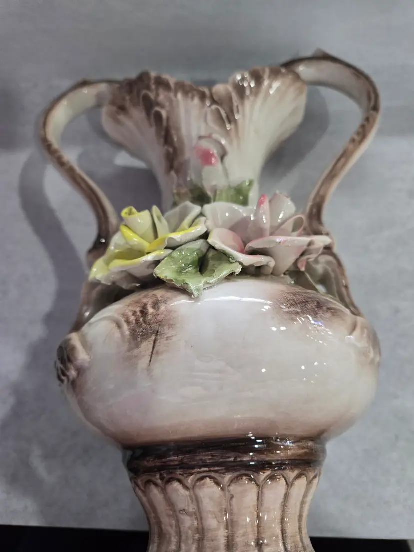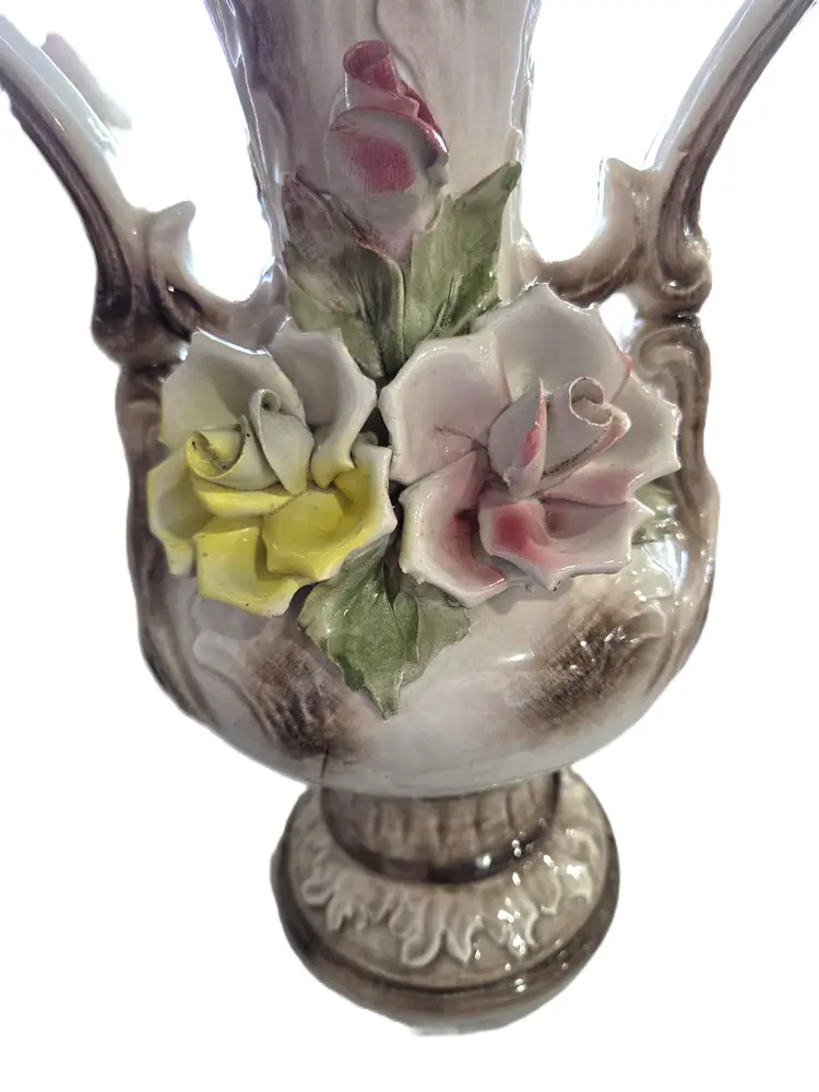 This stunning two handled vas e by Capodimonte is a beautiful piece with the iconic roses on it. There are no chips or cracks.