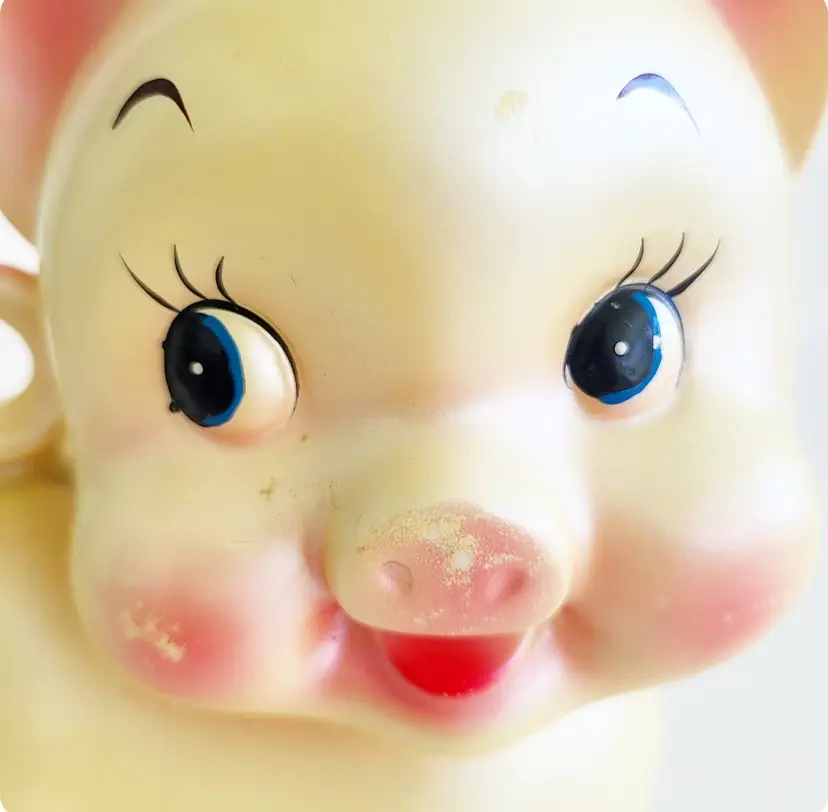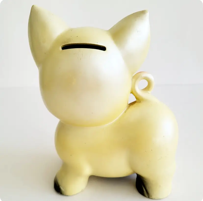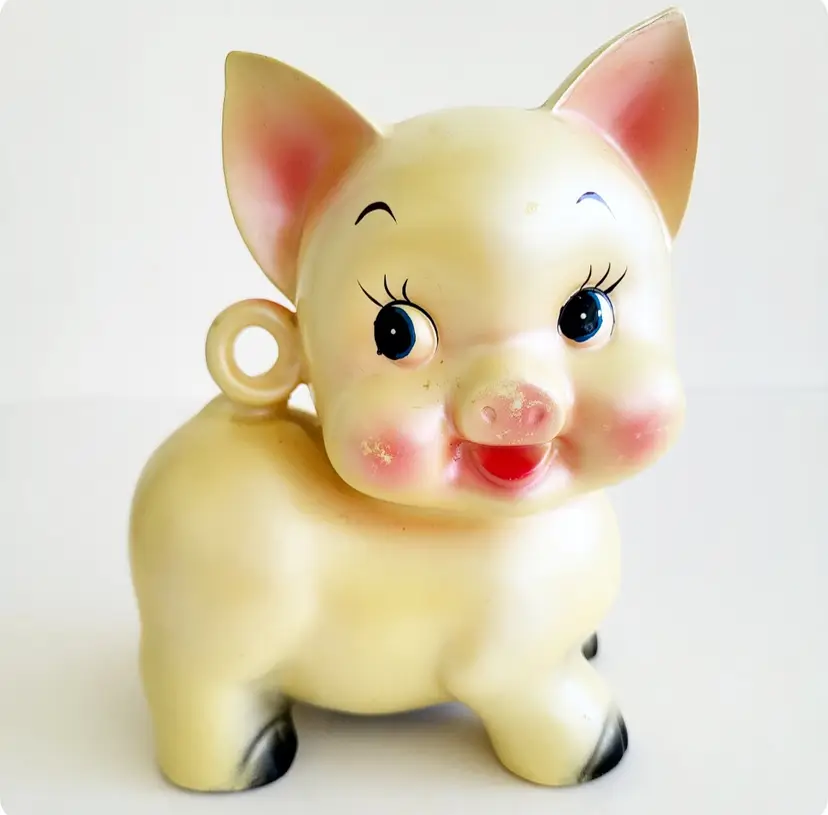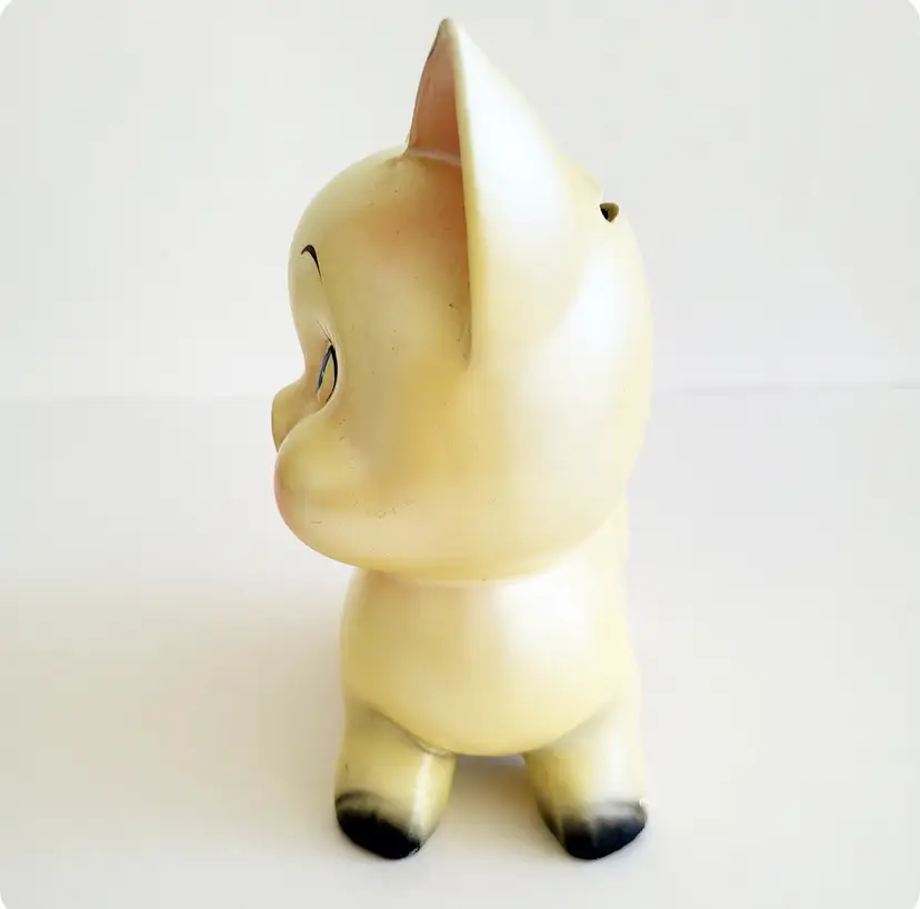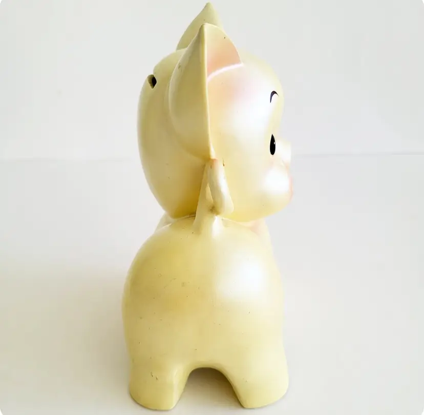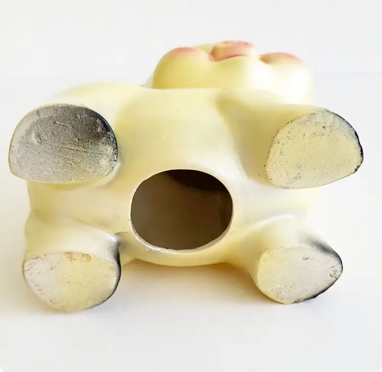 Vintage 1960s Ceramaster Japan Pig Bank. SCROLL FOR ALL DETAIL PHOTOS Pearlized yellow color. This piece is all airbrushed cold-painted ceramic, there is some paint scratches present, see photos. No chips. Stopper is missing. Measures 4.75 in x 6.5 in x 3 in.