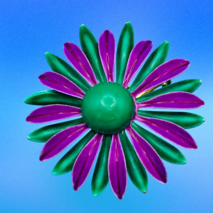 Bold and colorful vintage enamel flower brooch in a striking mod design. Features layered petals in bright green and purple with a raised green dome center. This statement piece is a classic example of 1960s–1970s “flower power” jewelry, perfect for collectors and lovers of retro fashion.