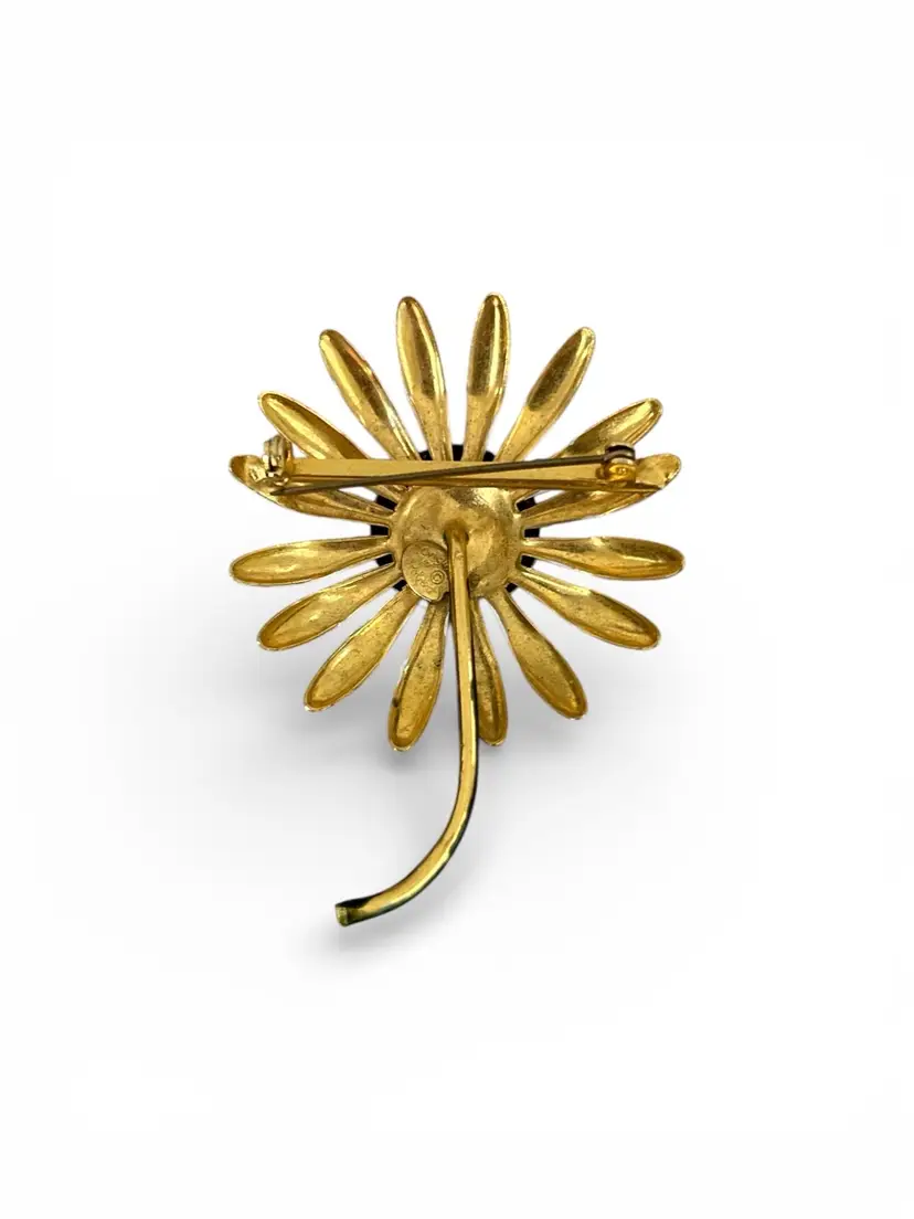 Brighten up your outfit with this charming vintage enamel daisy brooch. Its cheerful design adds a playful touch to any ensemble.