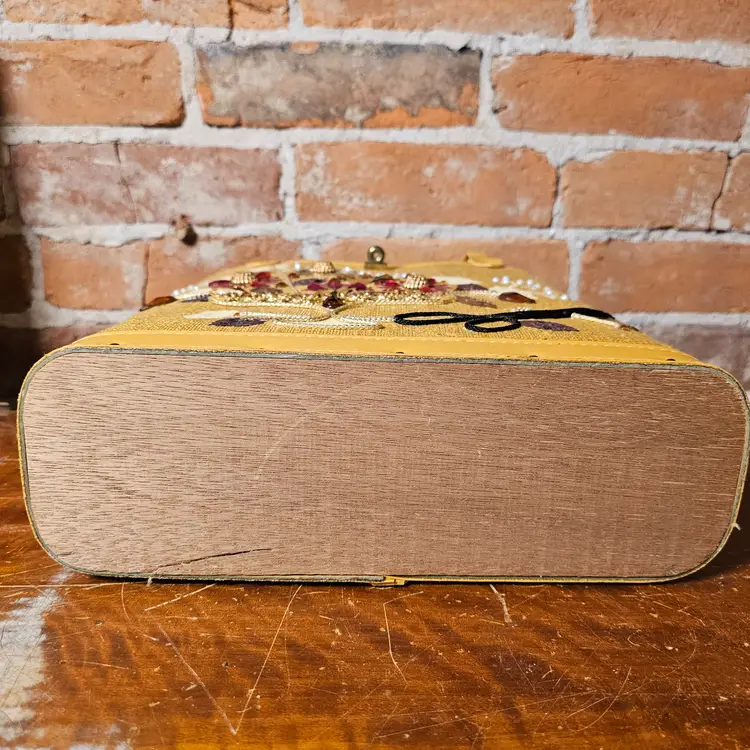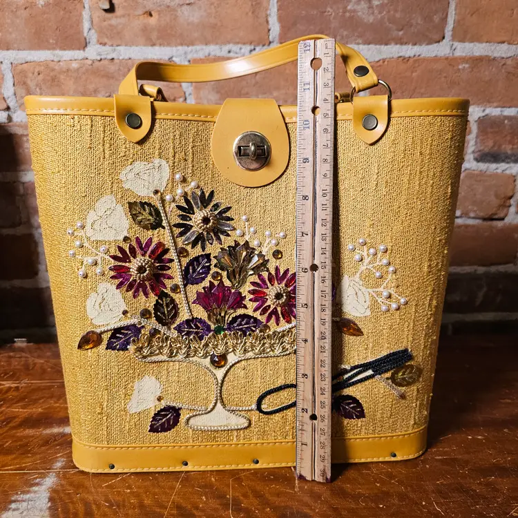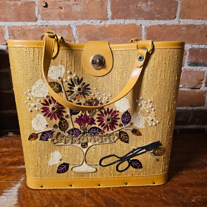Interior includes a zippered pocket and offers plenty of space for everyday essentials. A true statement piece perfect for collectors or anyone who loves bold vintage accessories.