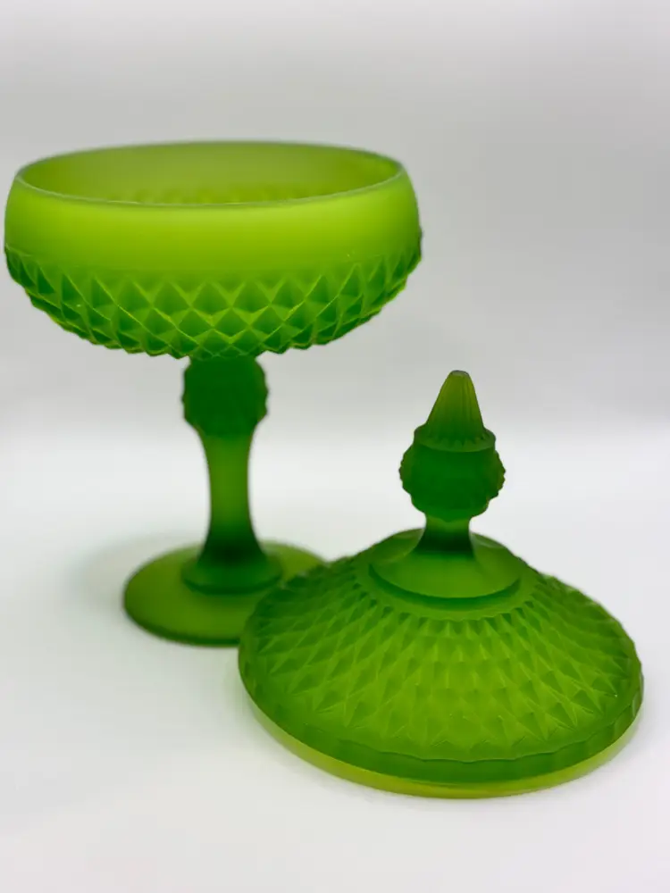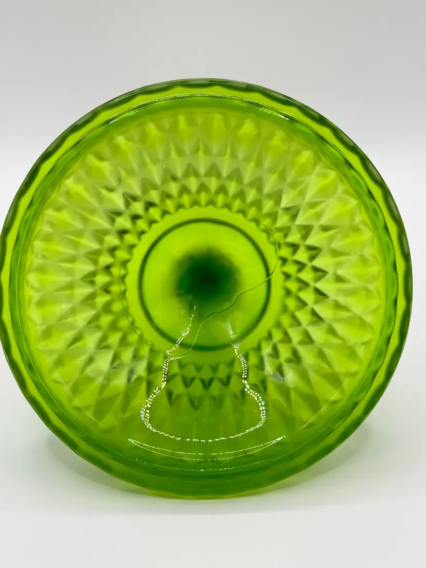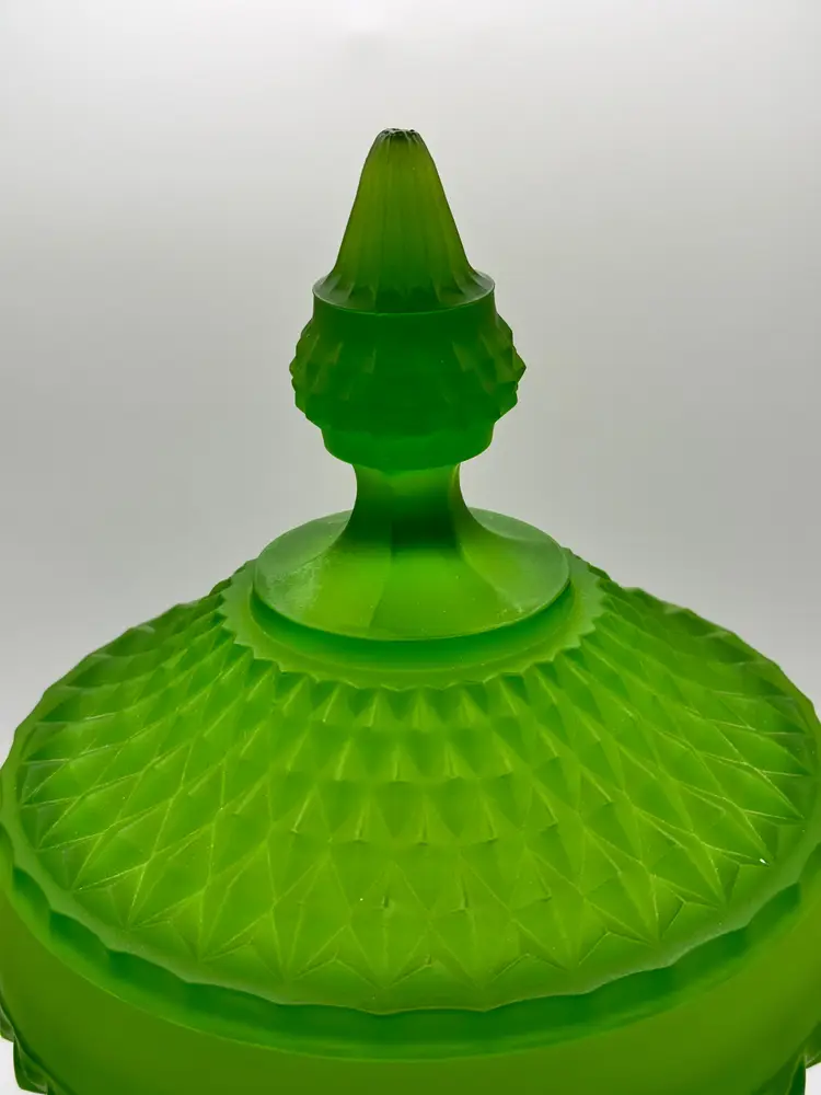 Vintage 1960’s Indiana Glass, diamond point pattern, covered candy dish lidded satin lime green, by Indiana Glass Co., made in USA. Very beautiful pressed glass diamond point pattern, perfect for any occasion & room. No chips or cracks. Measures 6.5x12x6.5. Weighs 4lb.