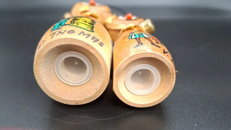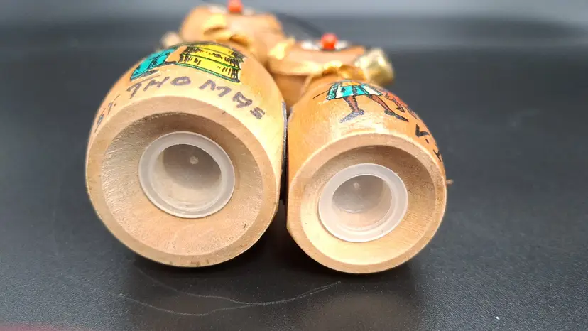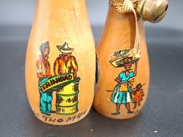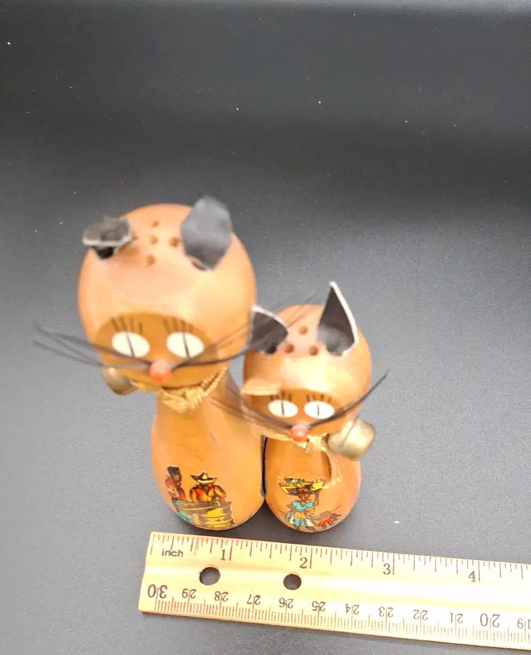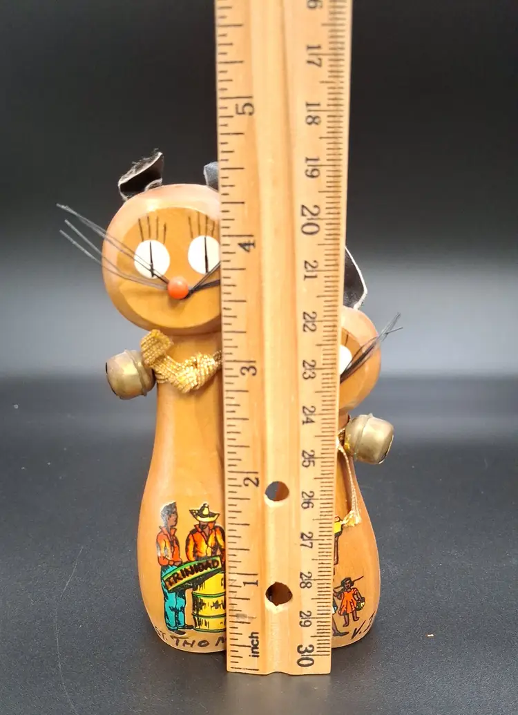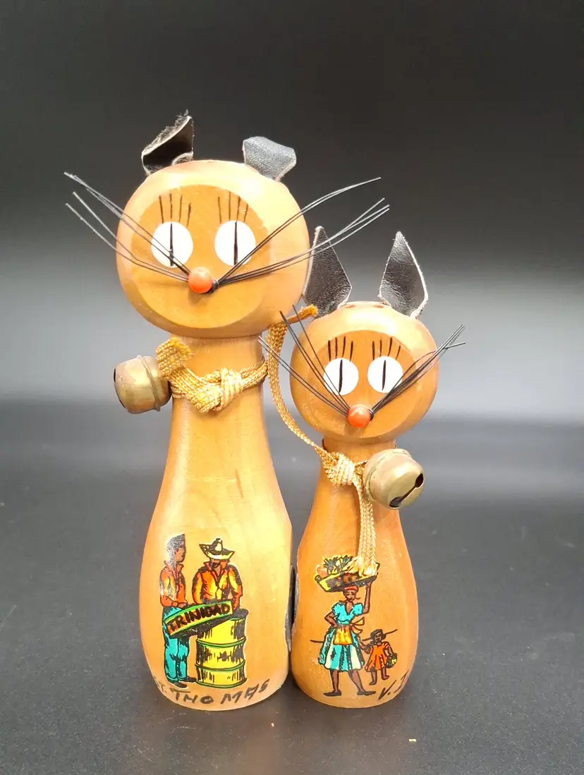 Add a dash of charm and culture to your kitchen with this delightful pair of vintage magnetic cat salt and pepper shakers, likely from the 1960s. Standing 5 inches tall, these wooden feline figures feature expressive painted faces, soft black ears, and gold cord collars. Each shaker showcases a hand-painted Caribbean scene—one labeled “TRINIDAD” and “ST. THOMAS,” the other signed “V.C.”—making them both functional and collectible.