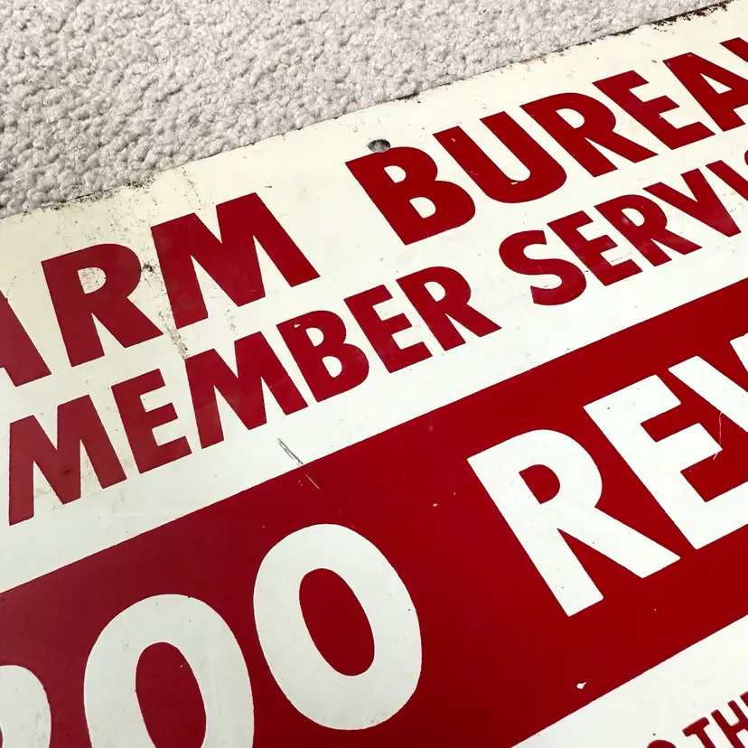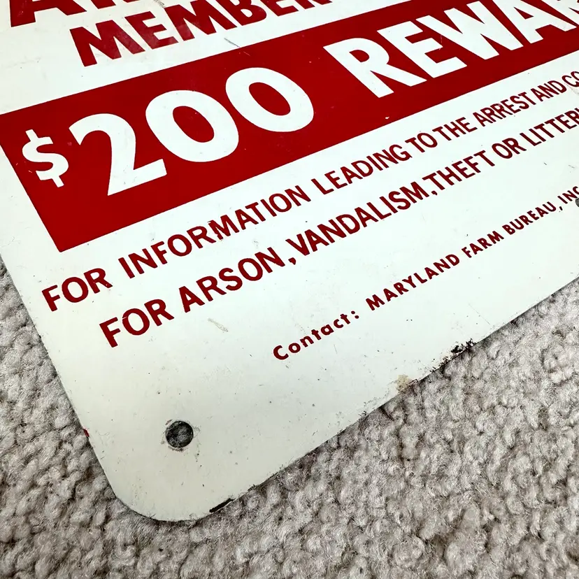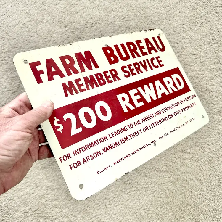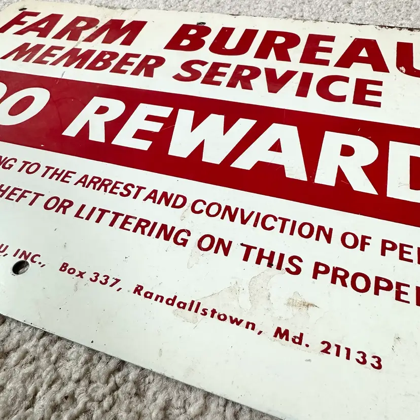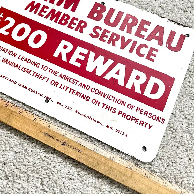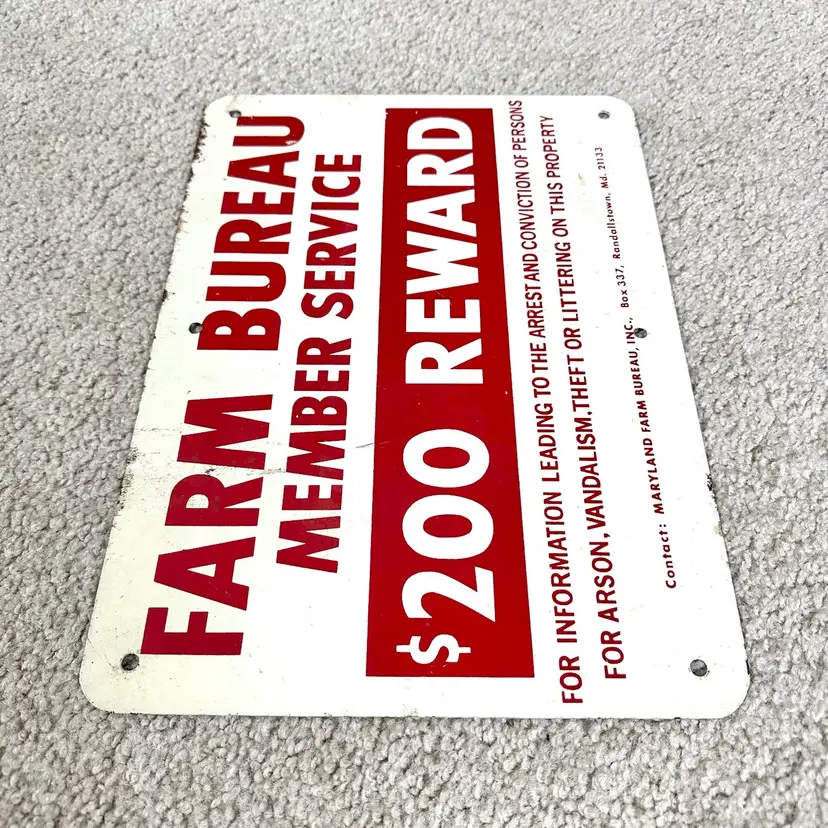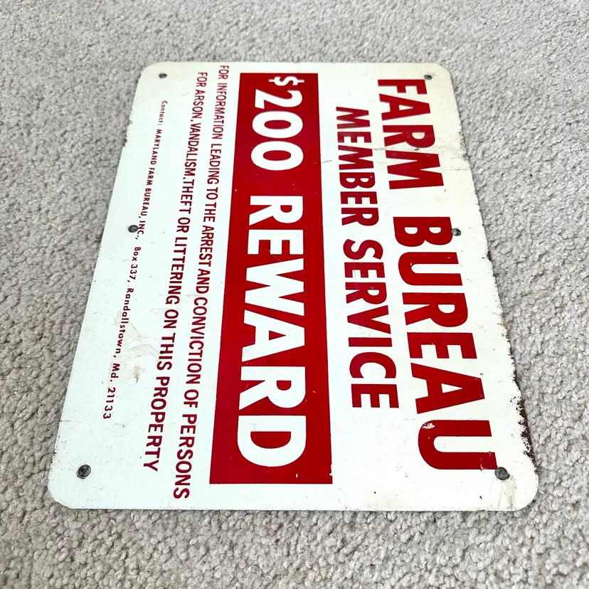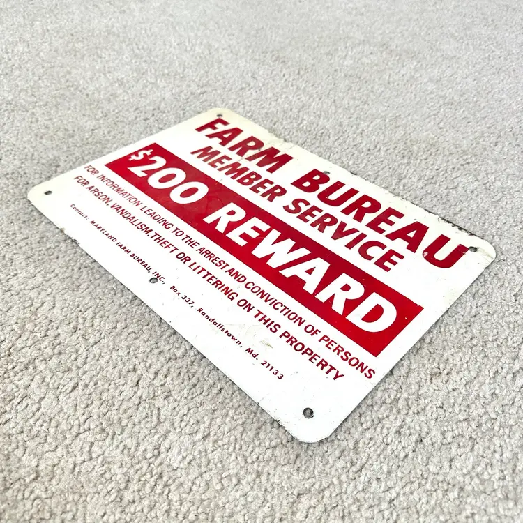 Vintage Maryland Farm Bureau Member Service $200 Reward Randallstown, MD steel metal sign. ***This is an original sign from 1960s or earlier and not one of the later repros commonly found. Good condition with some wear from age and use as shown in the pics. Beautiful aged patina with some rust and paint loss along the edges. DISPLAYS WELL!! Mounting holes along top and bottom edges for easy hanging. Sign measures about 14 x 9 7/8”. See pics for more details.