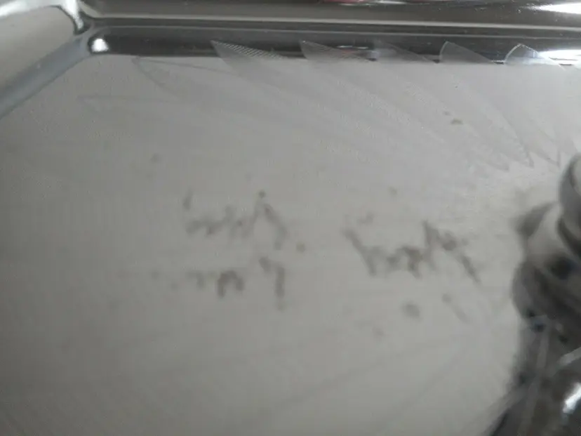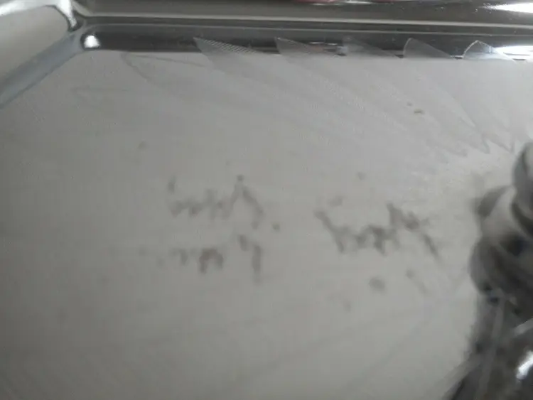 Handle has what looks to be little bit of buildup - its not as shiny as it should be on the top, I think some wiping will fix that up, it also has something on tray part you can gently scratch it off with your fingernail, so I think it will clean up as well. There is a bit of discoloration on the middle of one side, it looks like rust. I don' t know if that will clean off or not.