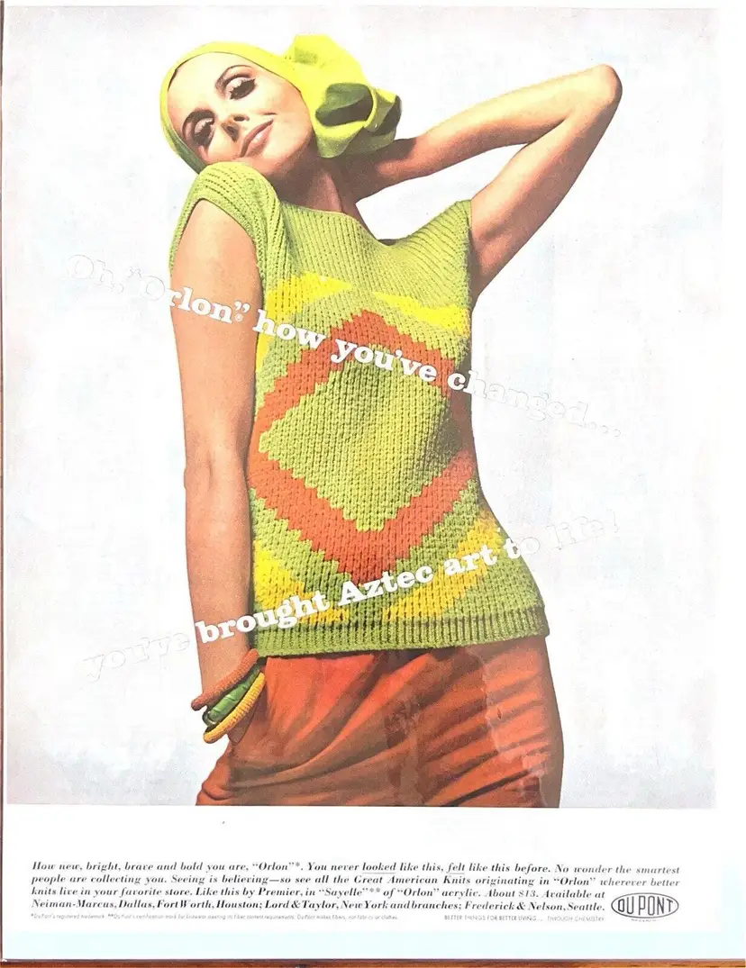 Vintage 1960s Mod Fashion Print Ad Aztec Orlon Yarn Sweater Dayglo Knitting