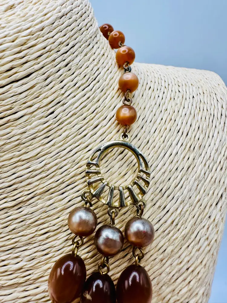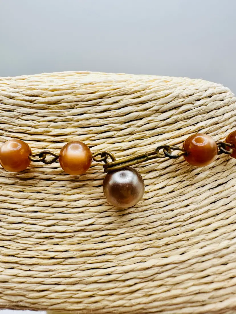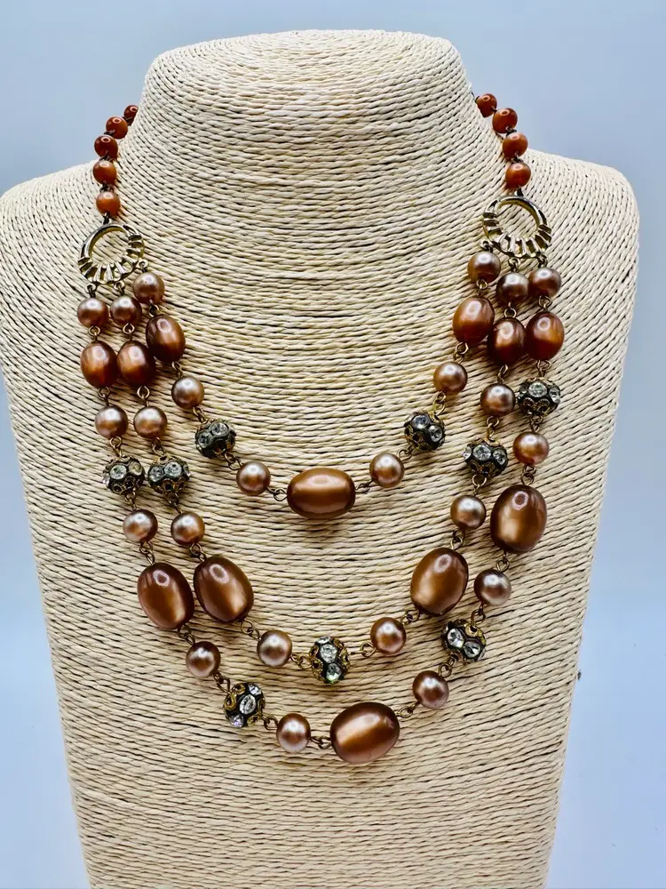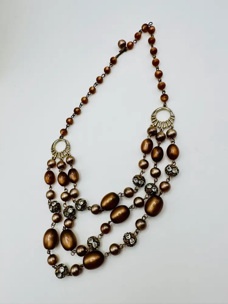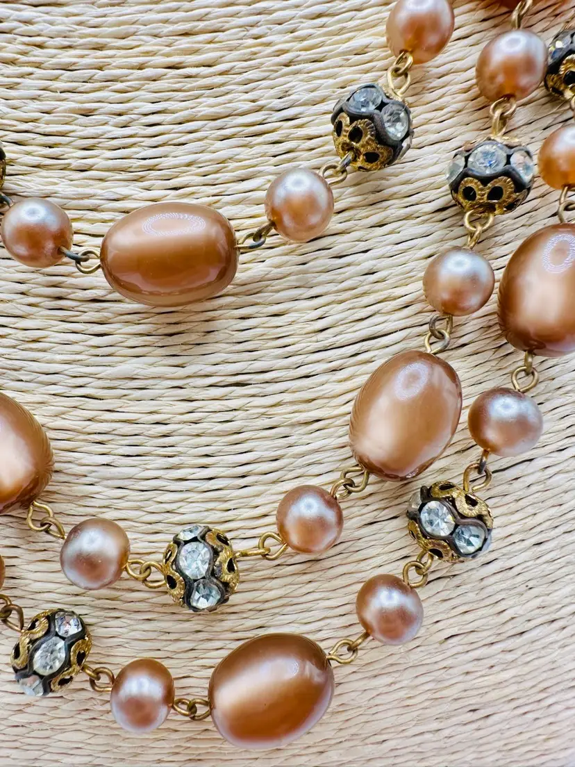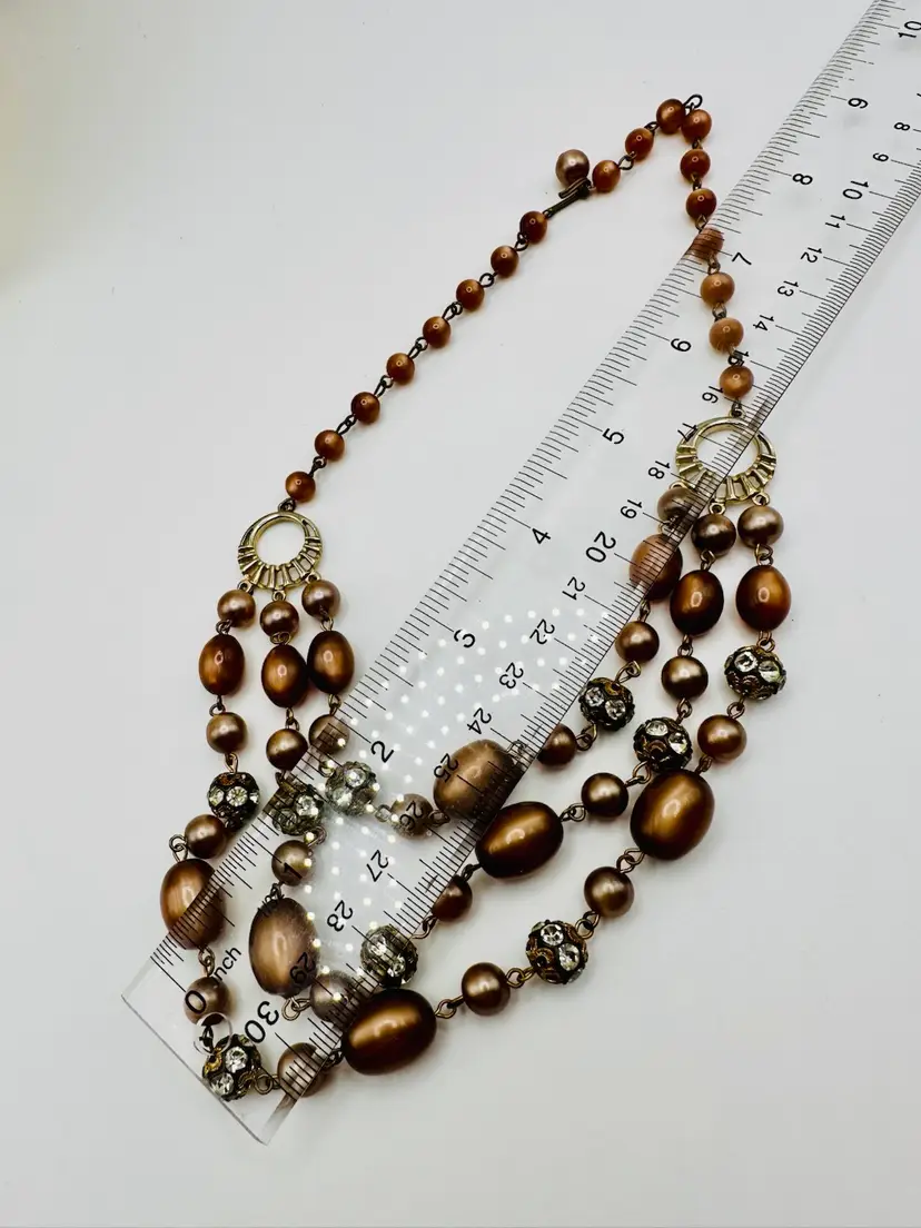 Some wear around the rhinestone beads just due to age and on the shepherd’s hook. The length of the necklace is actually 14 inches to the first strand. You could add an extender. This piece is so beautiful.