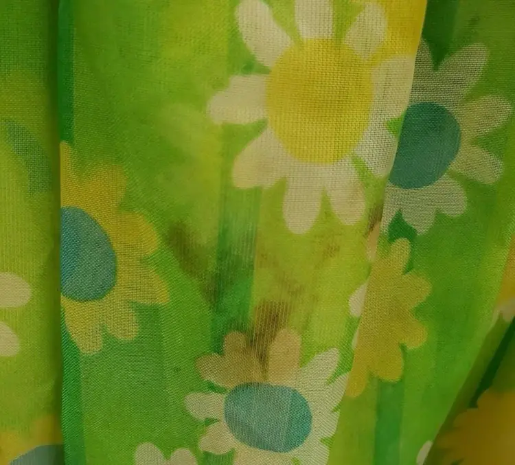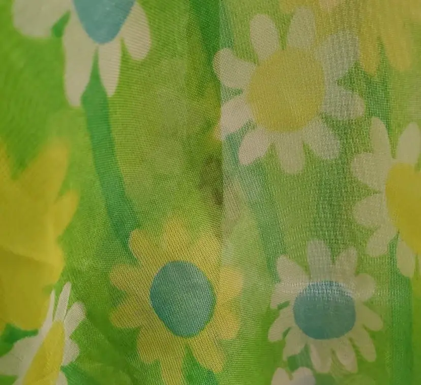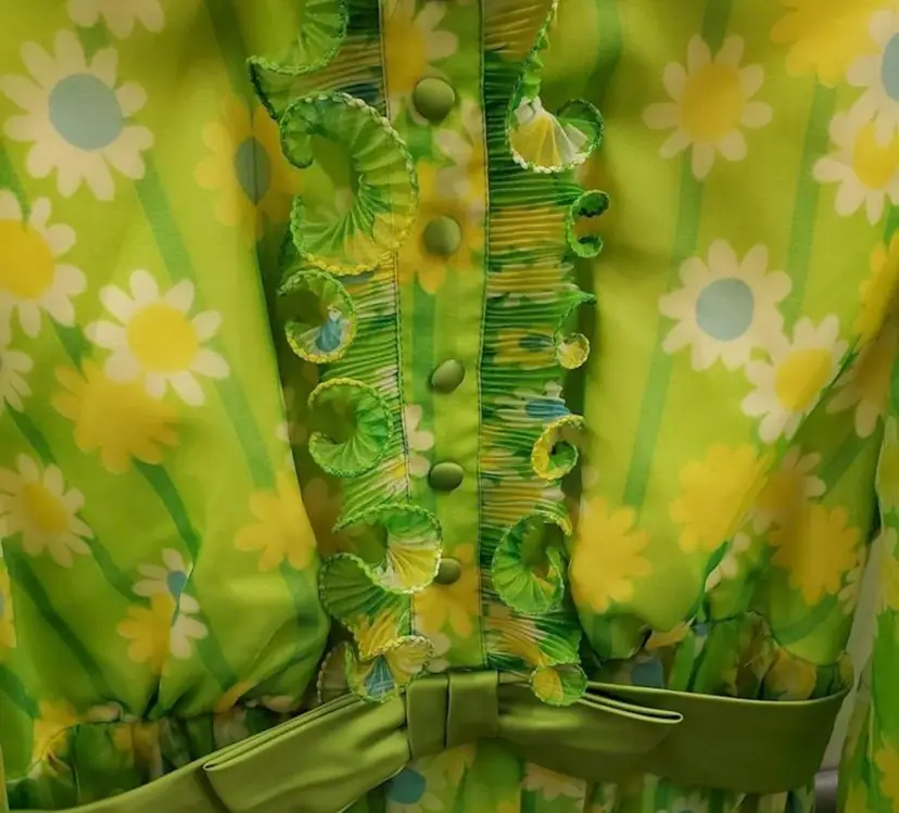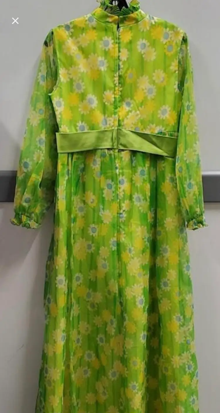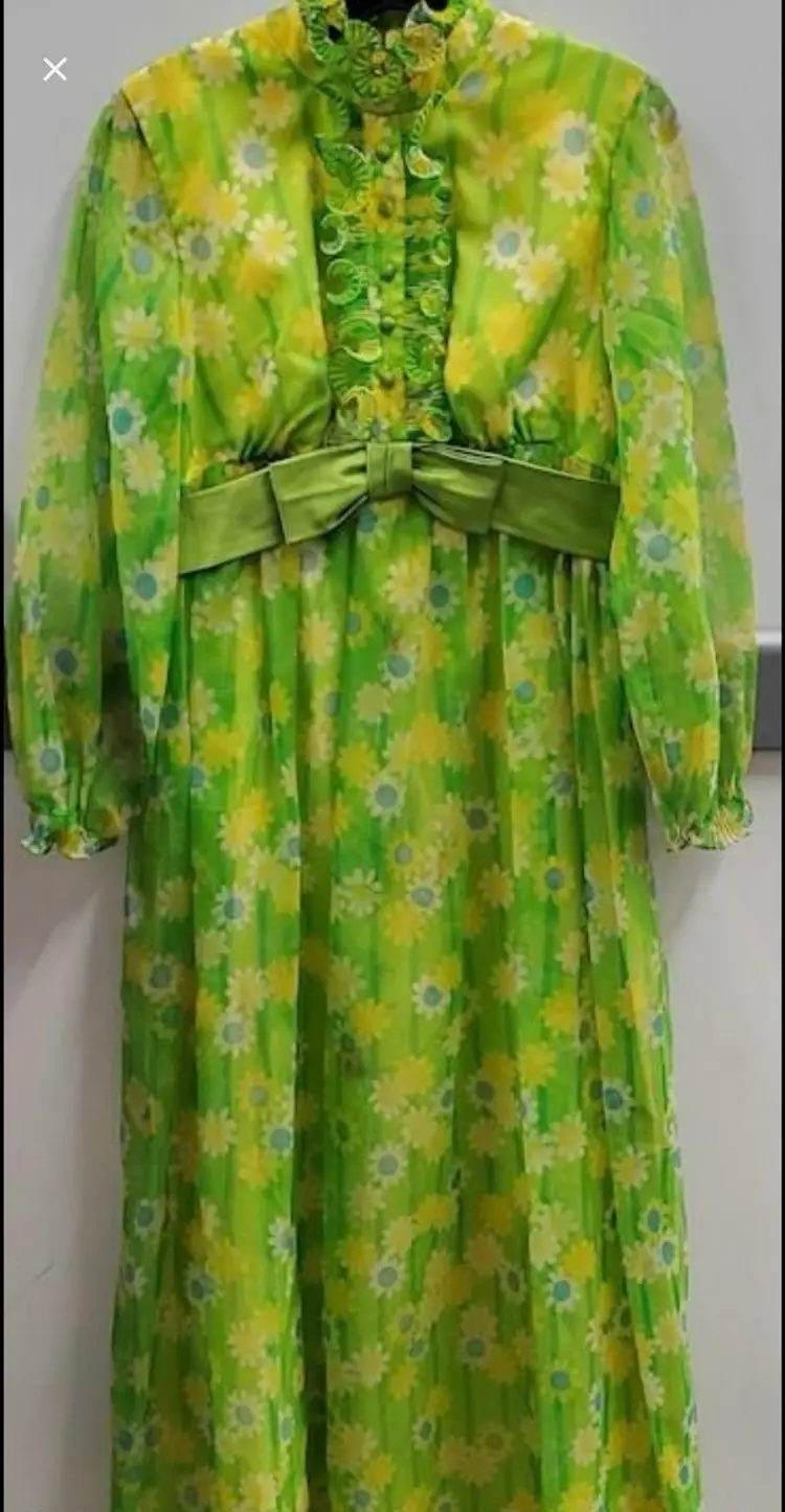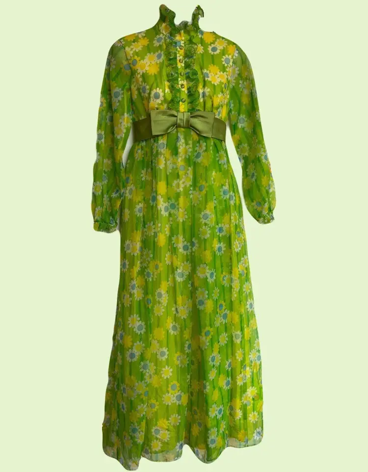 This classic floral dress from the 1960s is in excellent vintage condition, with vibrant green and yellow hues perfect for any retro-inspired look.