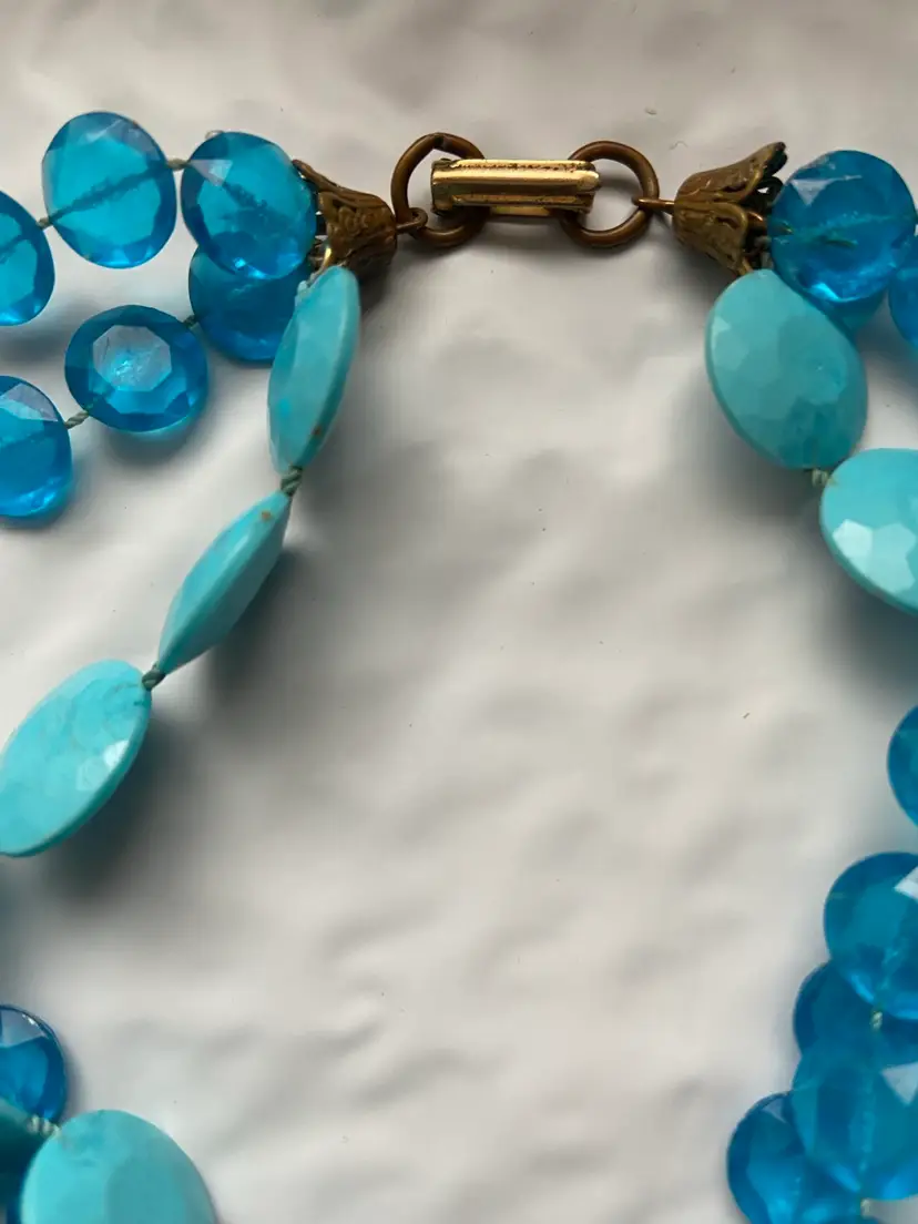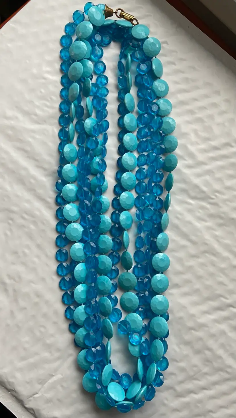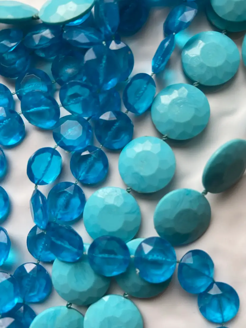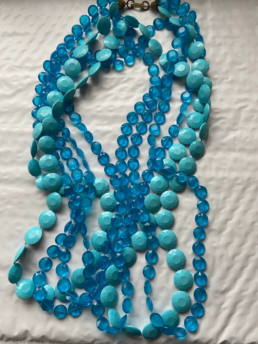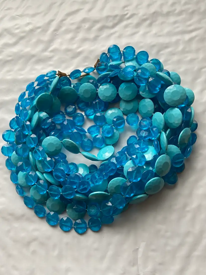 Fun plastic bead necklace from the 1960s. Two different shaped beads in Hues of blue. Necklace is quite long at 54” with metal clasp. Necklaces in good condition with intact beads and working condition clasp.