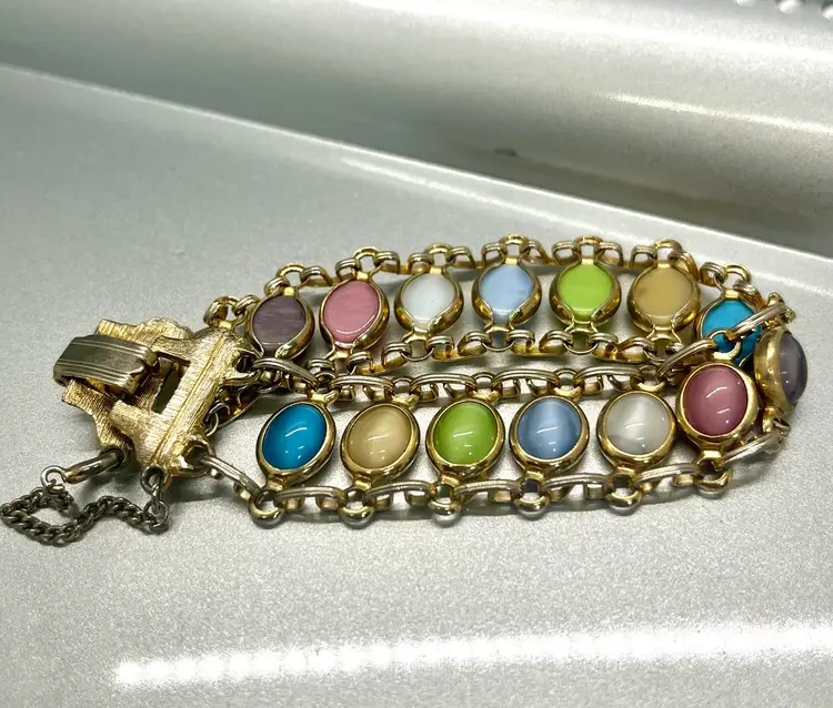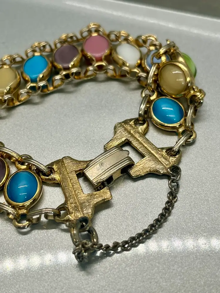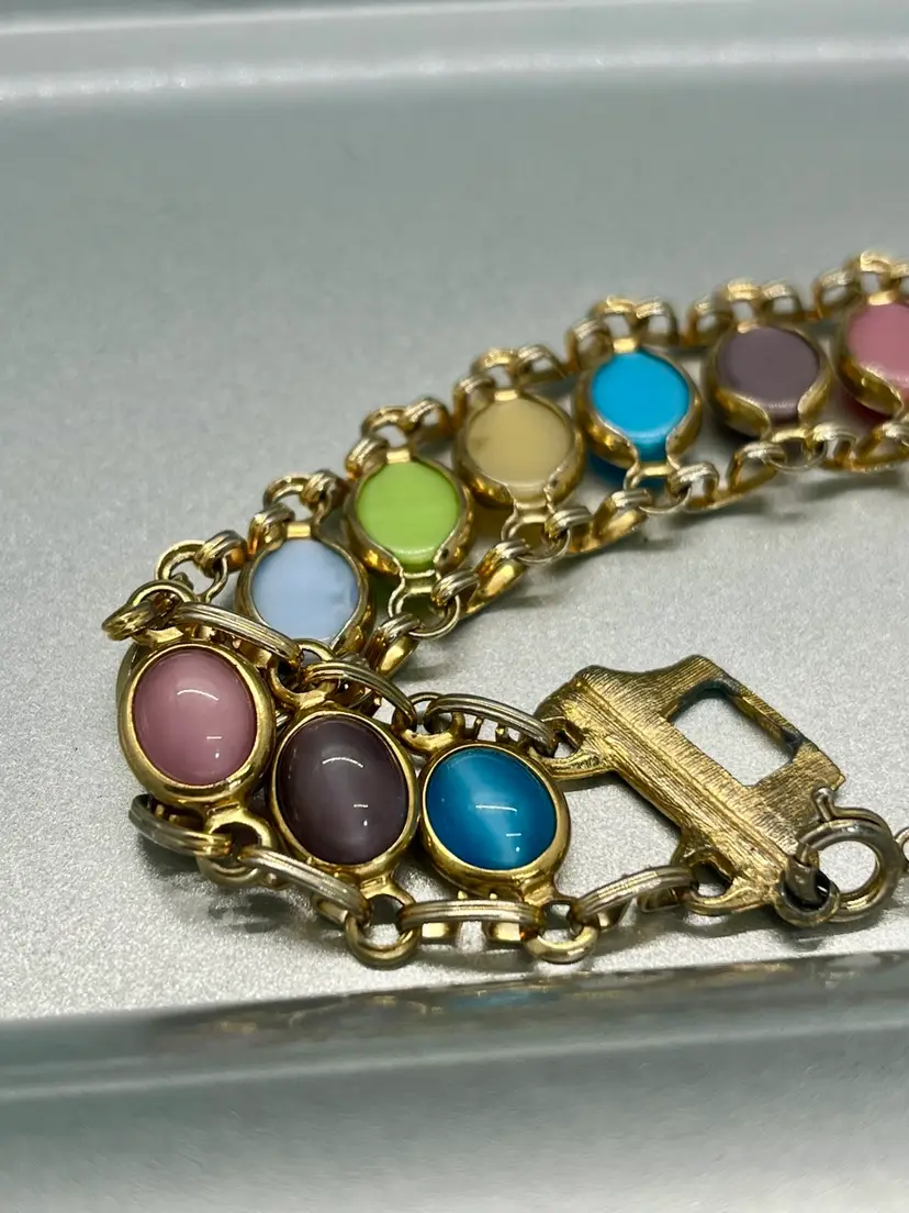 This vintage 1960's Satin Glass Multi Color Cabochon Stone Gold Tone Bracelet exudes a classic charm with its multicolor cabochon stones set in a gold tone metal chain. The bracelet features a unique design that beautifully complements any outfit, making it a stylish accessory for women. Made with quality glass material, this original piece adds a touch of elegance to any fashion ensemble, perfect for those who appreciate vintage jewelry with a retro flair