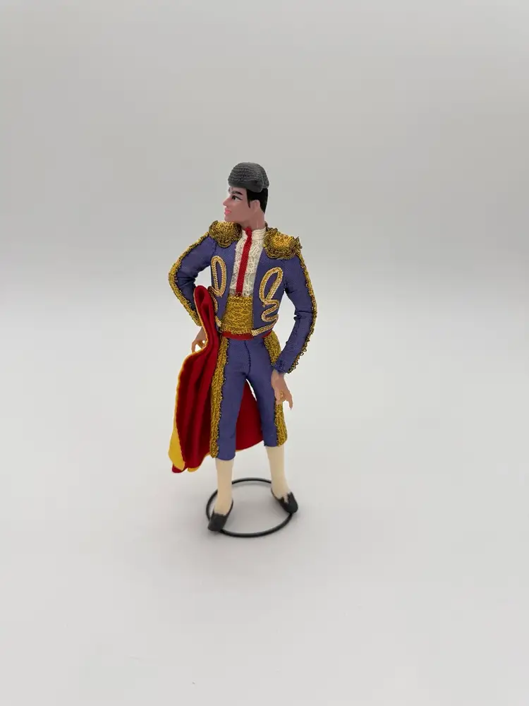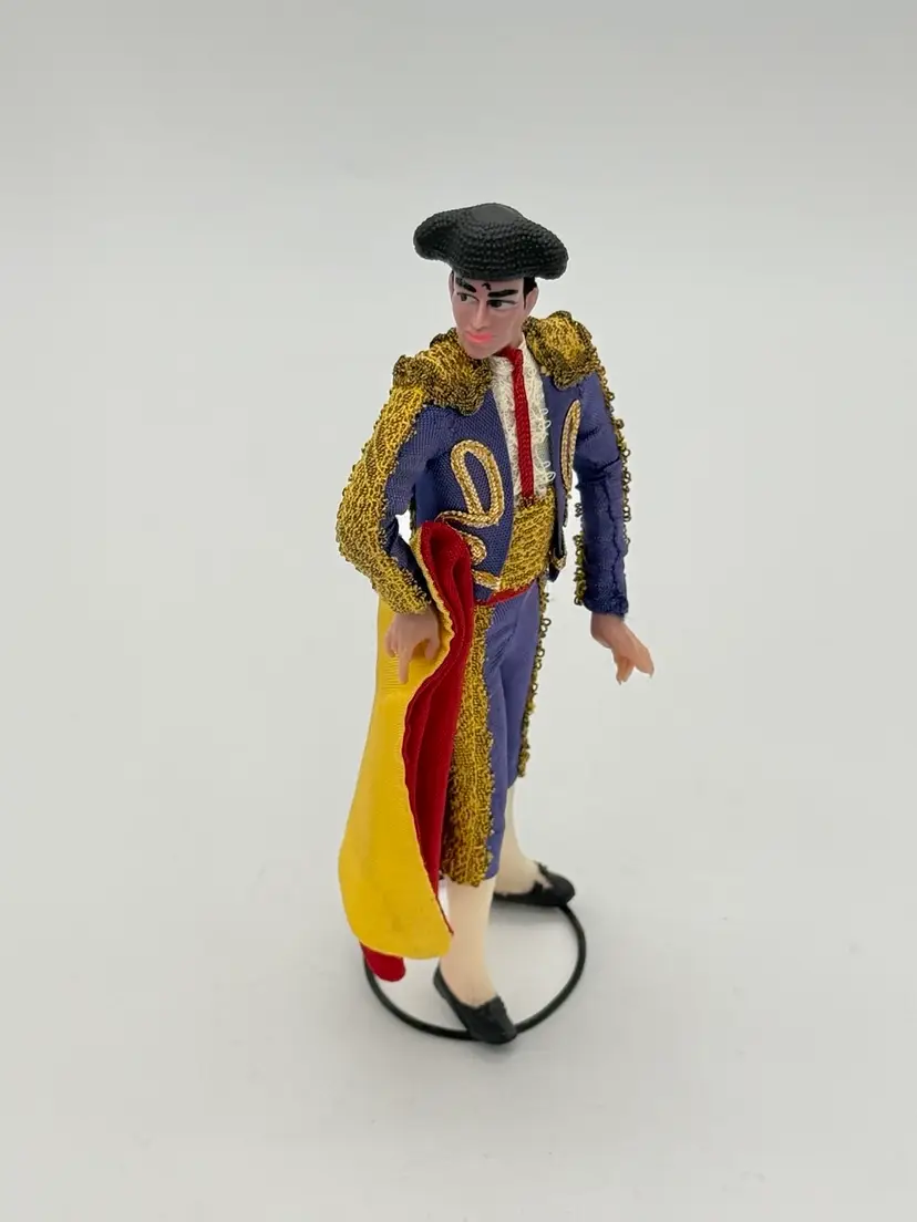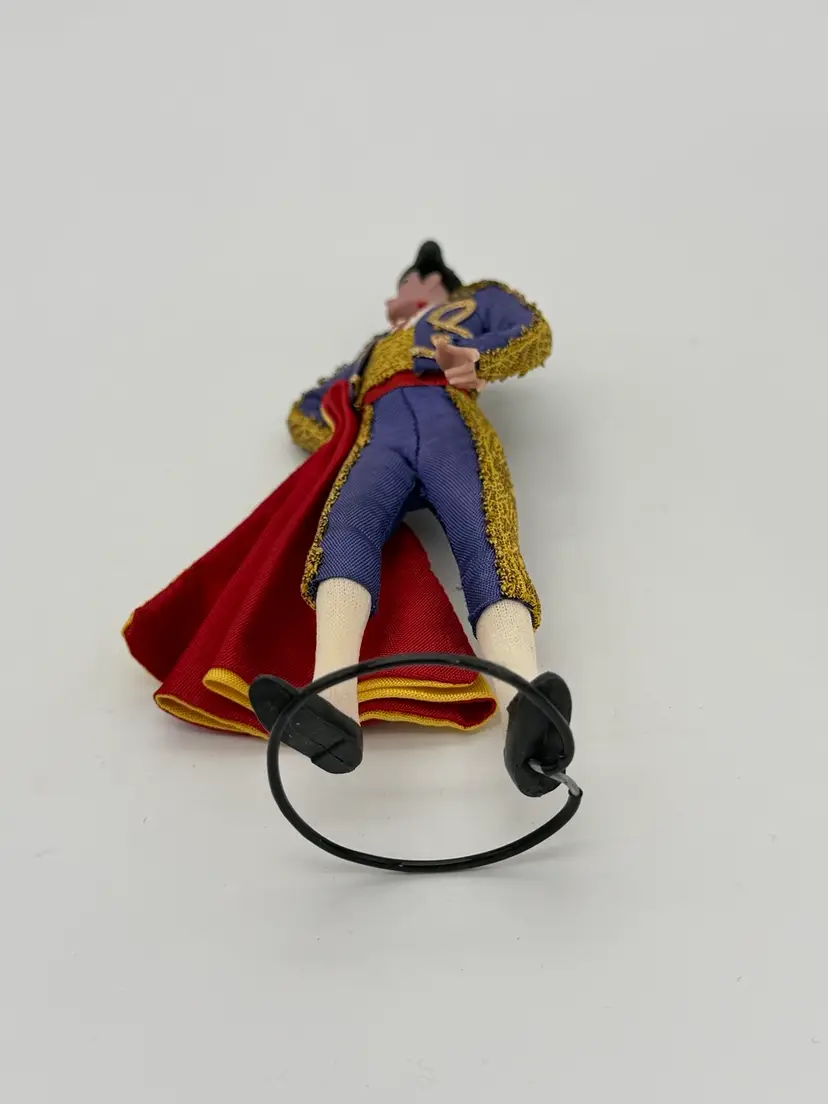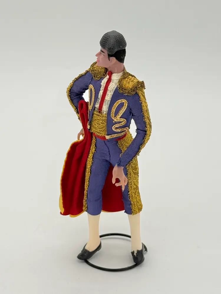 This Vintage 1960's Souvenir Marin Chiclana Spanish Doll depicts a young boy dressed as a Matador Bull Fighter, complete with original clothing and an attached stand. Handmade in Spain, this freestanding artist doll features a medium complexion, black hair, and black eyes. Standing at 6.5 inches tall, this rare and unique collectible captures the essence of Spanish culture and tradition from the 1960s, making it a sought-after piece for doll collectors and enthusiasts alike.