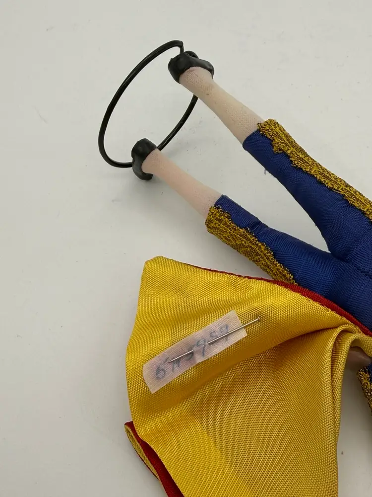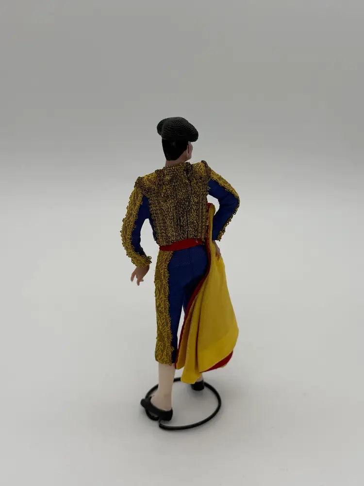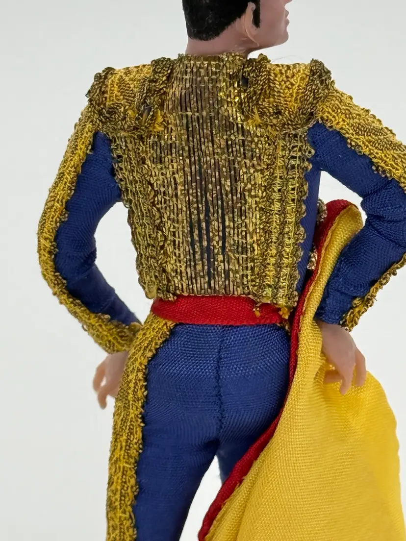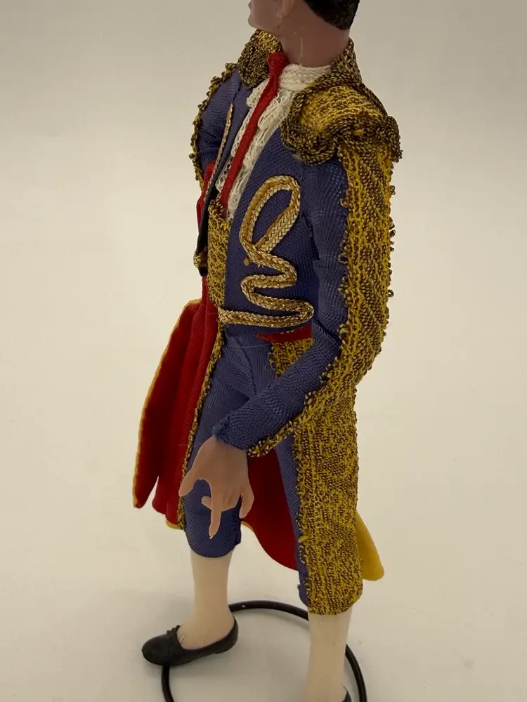 This Vintage 1960's Souvenir Marin Chiclana Spanish Doll depicts a young boy dressed as a Matador Bull Fighter, complete with original clothing and an attached stand. Handmade in Spain, this freestanding artist doll features a medium complexion, black hair, and black eyes. Standing at 6.5 inches tall, this rare and unique collectible captures the essence of Spanish culture and tradition from the 1960s, making it a sought-after piece for doll collectors and enthusiasts alike.