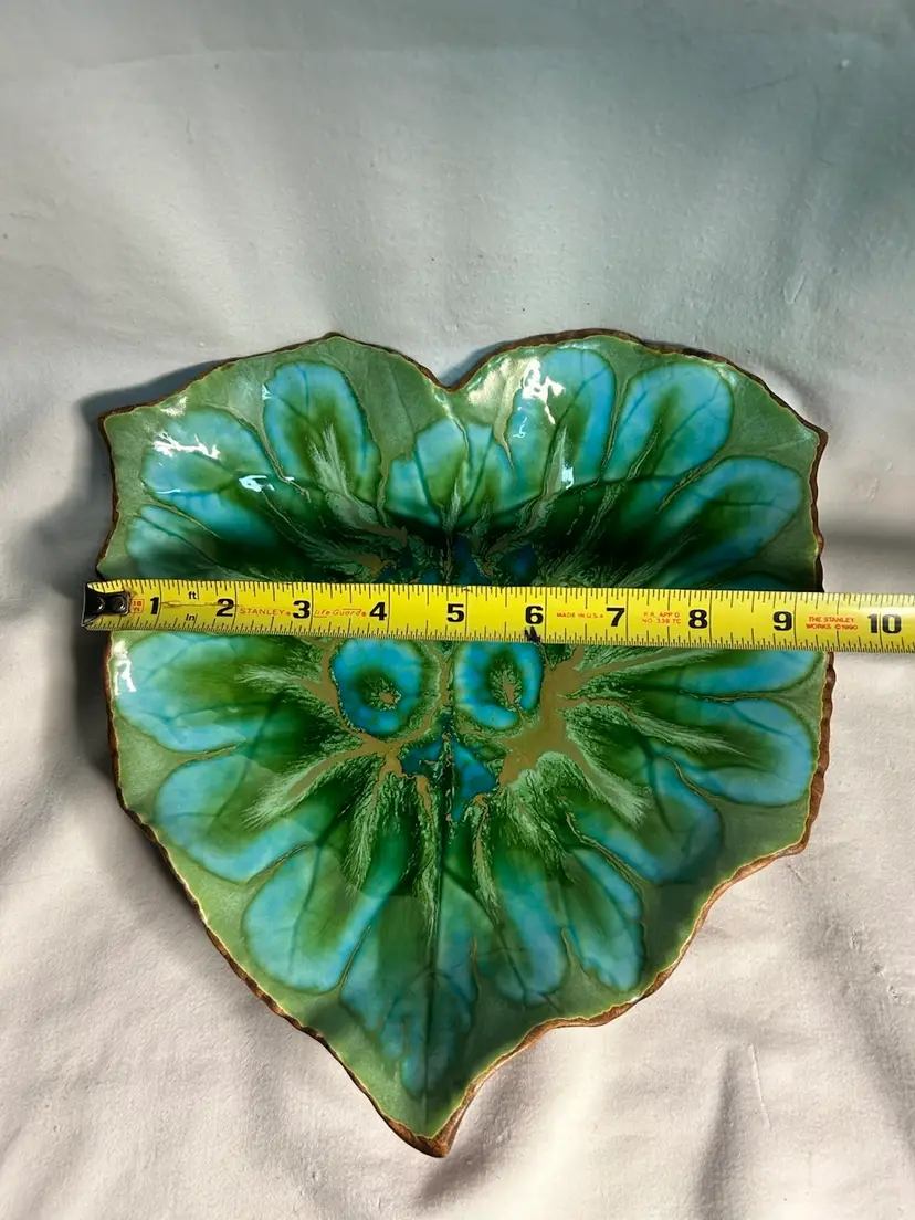 The colors on this vintage piece are so beautiful. Reminds me of peacock colors. This vintage Treasure Craft serving tray is a unique addition to any collection. The emerald green and turquoise blue leaf pattern and art pottery production style make it a beautiful piece for display or use. The brand is known for its quality and this tray is no exception. It was manufactured in California in the 1960s and has a timeless mid-century appeal. Pottery production technique adds to its durability and makes it a great choice for everyday use or display as you please.