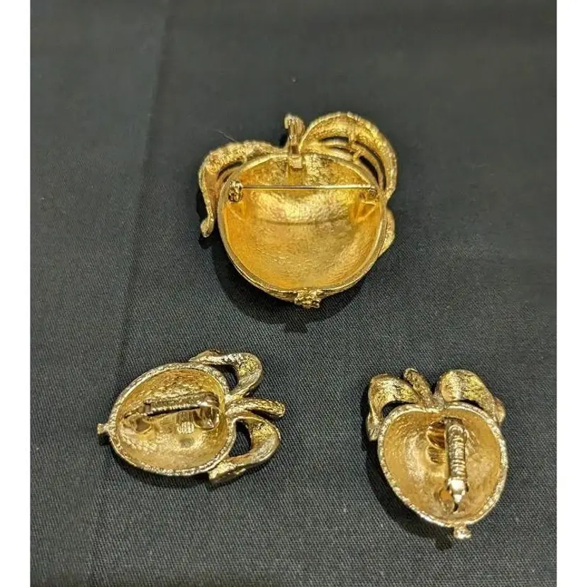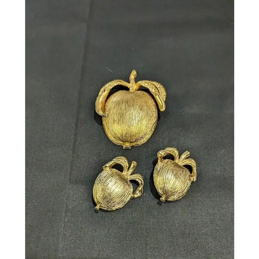 Vintage 1961 Sarah Coventry Adam's Delight Brooch and Earring set. This set is gold tone and the earrings are clip on. All in good condition. All pieces are signed with the Sarah Coventry Hallmark.