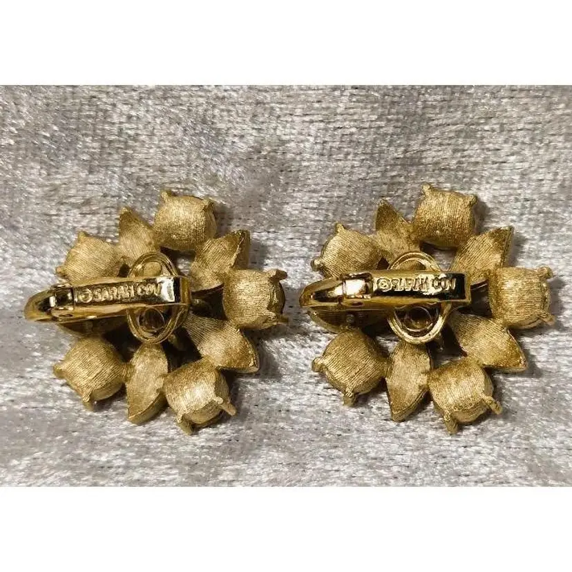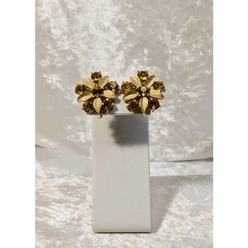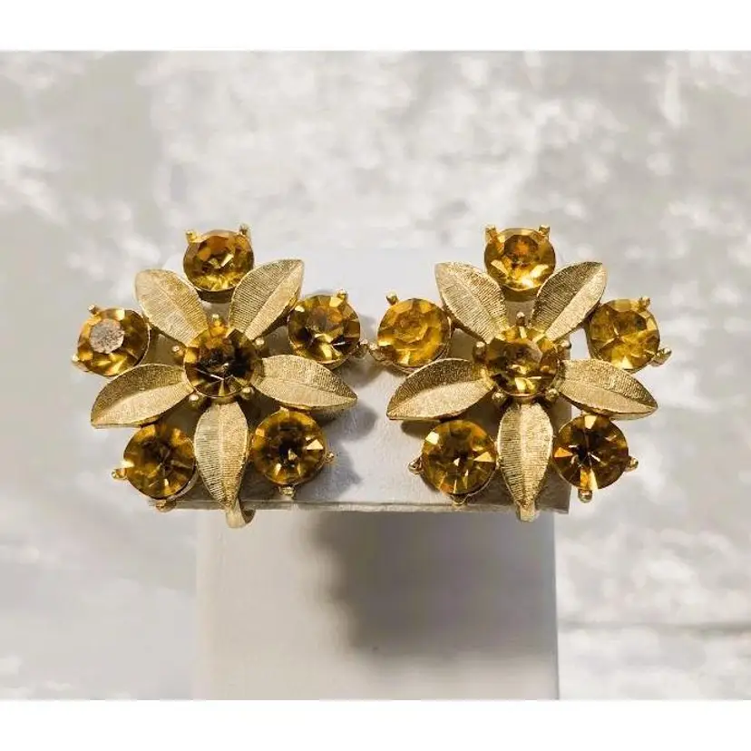 These amazing Sarah Coventry clip on earrings are named Amber Lites and are from 1961. They are beautiful flowers set in a brushed gold tone with amber colored rhinestones with a lot of sparkle and shine. They are signed SarahCov on the back of each earrings.