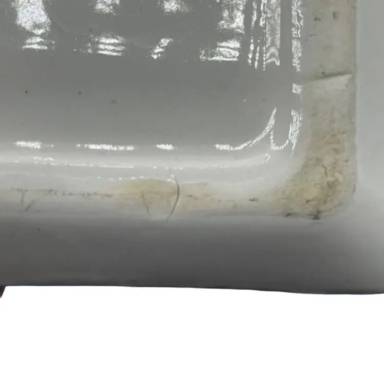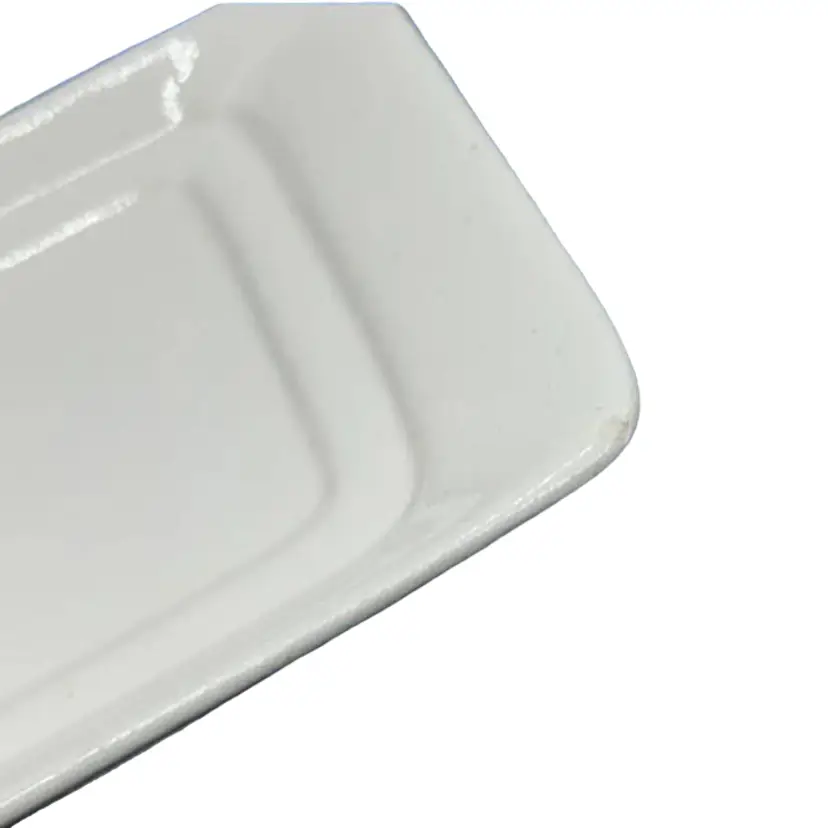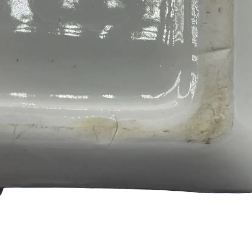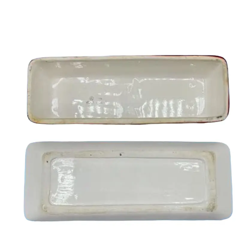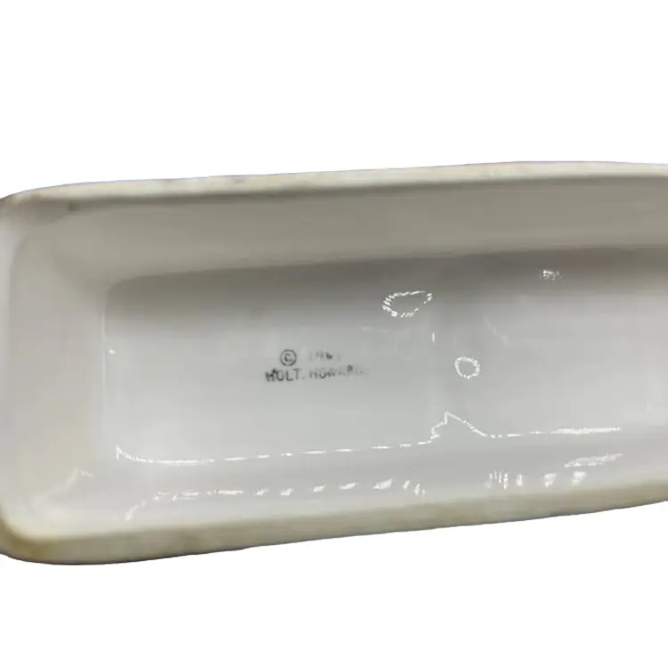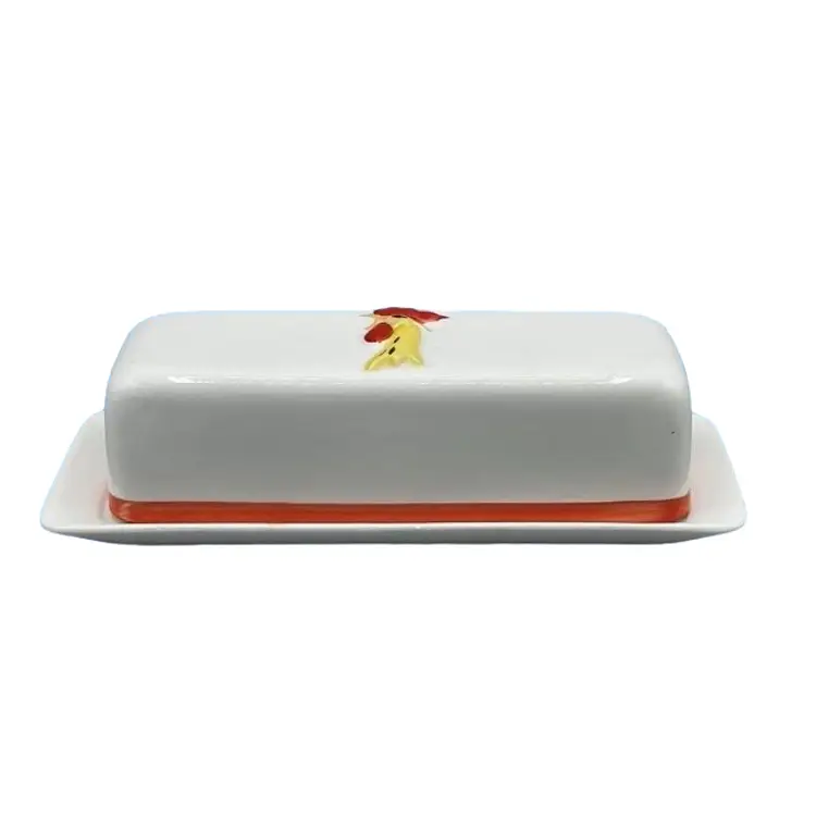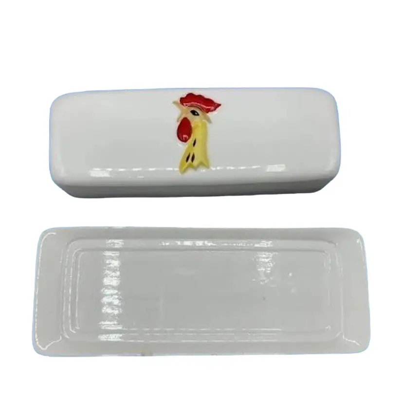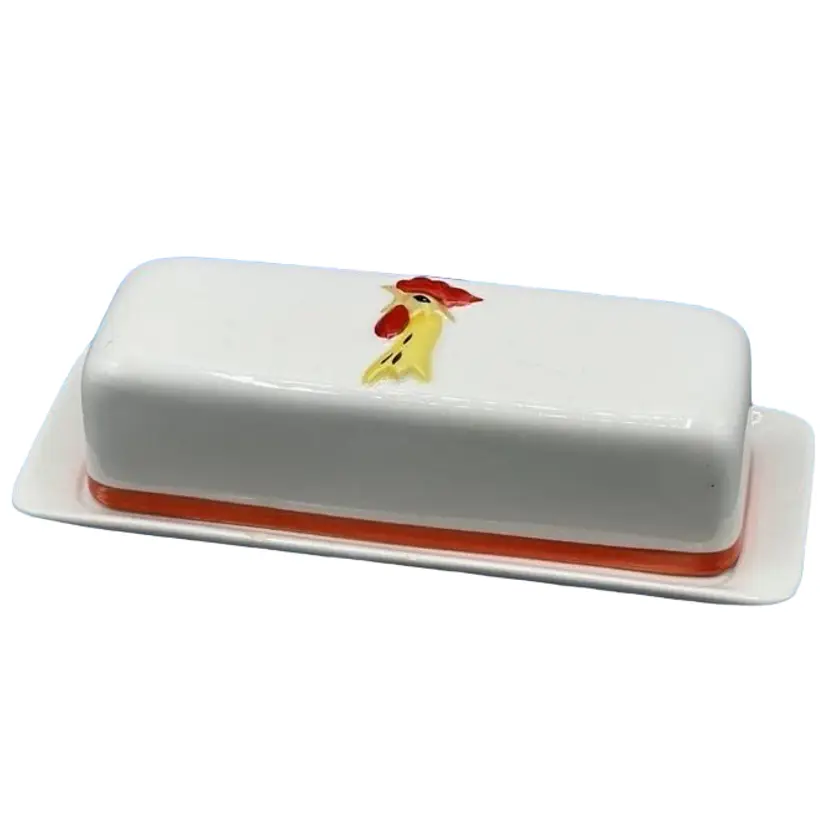 This kitschy Holt Howard butter dish has a raised Coq Rouge rooster face on the lid with a plain underplate. There are no chips or cracks on the lid but the base does have a few small chips as well as a manufacturer defect wrinkle on the bottom. Overall, the dish is about 7-1/4 inches long.