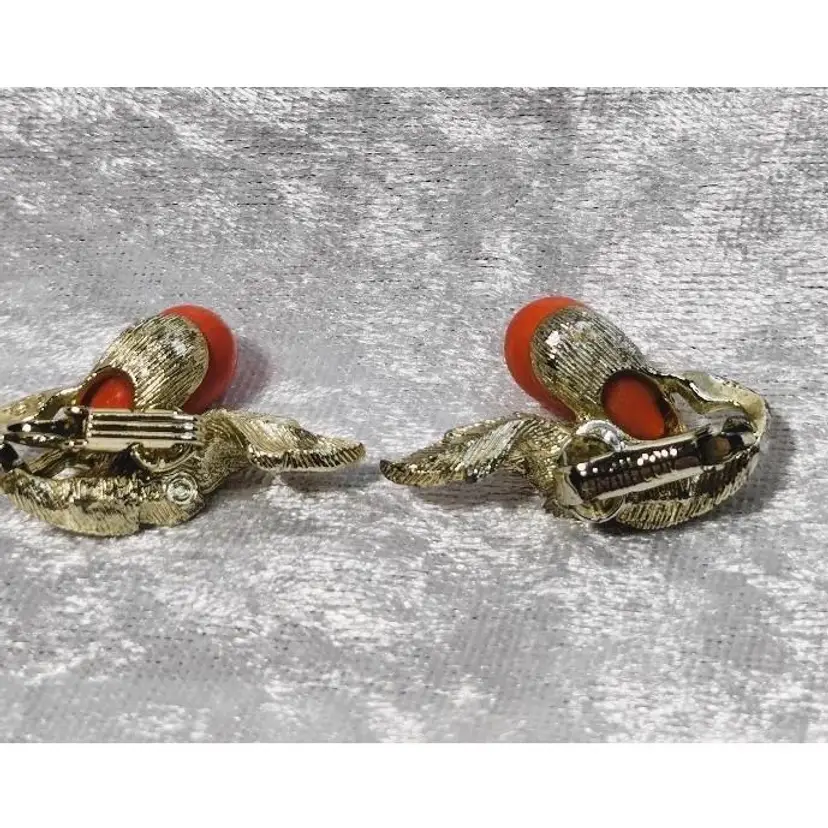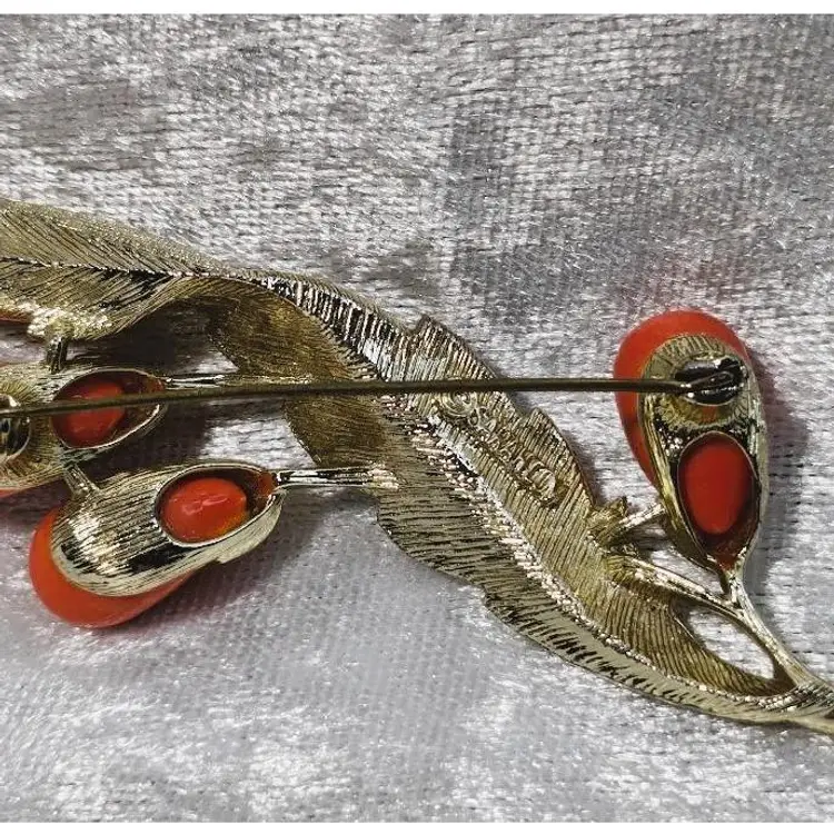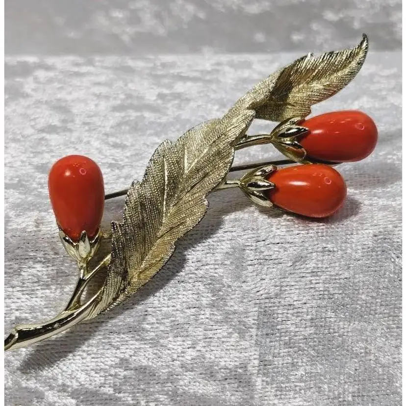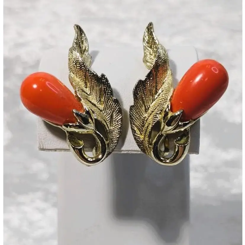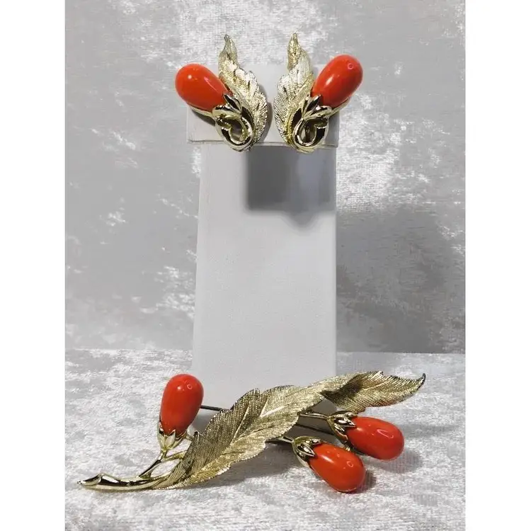 This vintage Sarah Coventry brooch and clip on earring set is called "Bittersweet" and is from 1962. It features a brushed gold tone leaf design with coral colored teardrop shaped beads. The brooch measures approximately 3.5 inches long and the earrings are approximately 1.25 inches long.