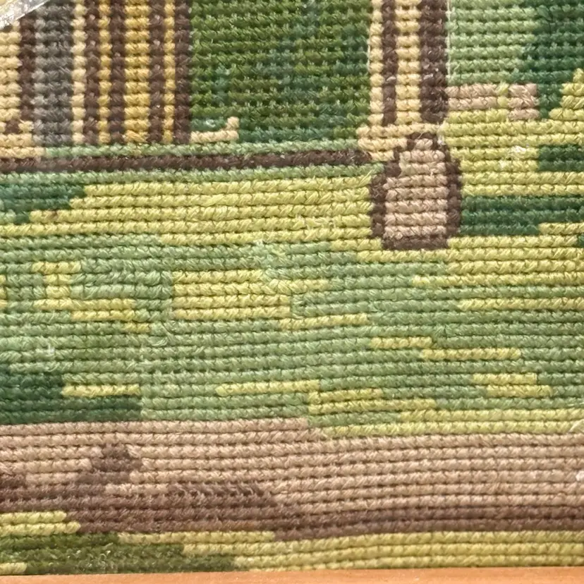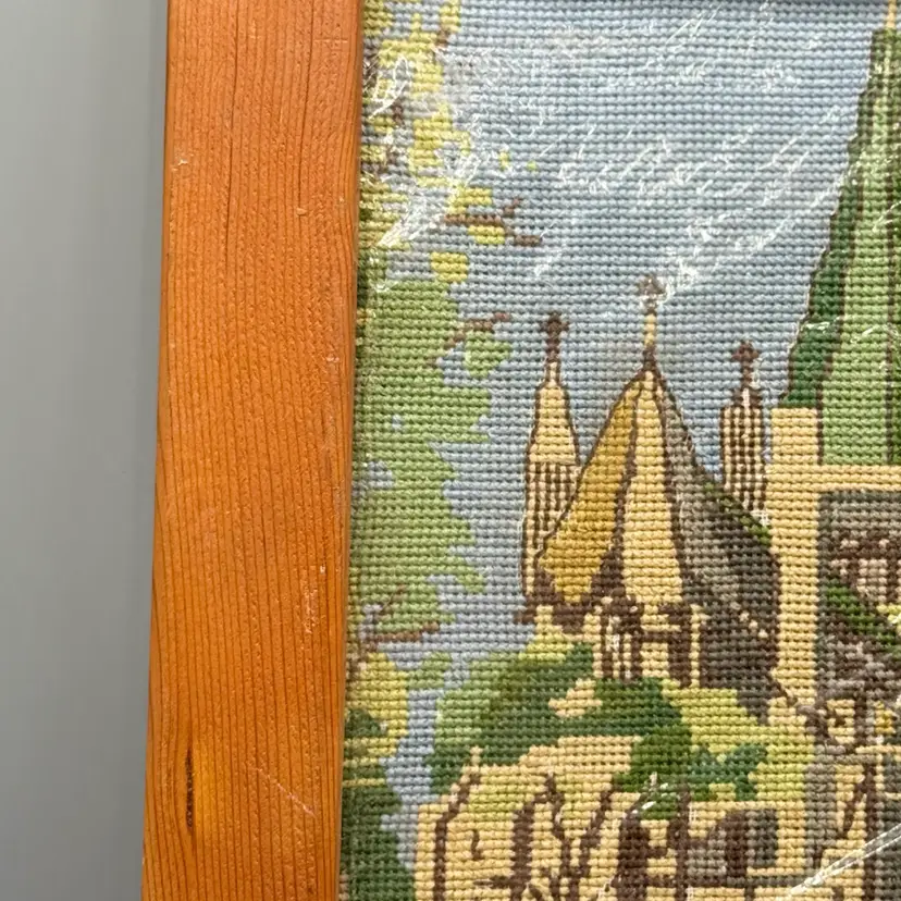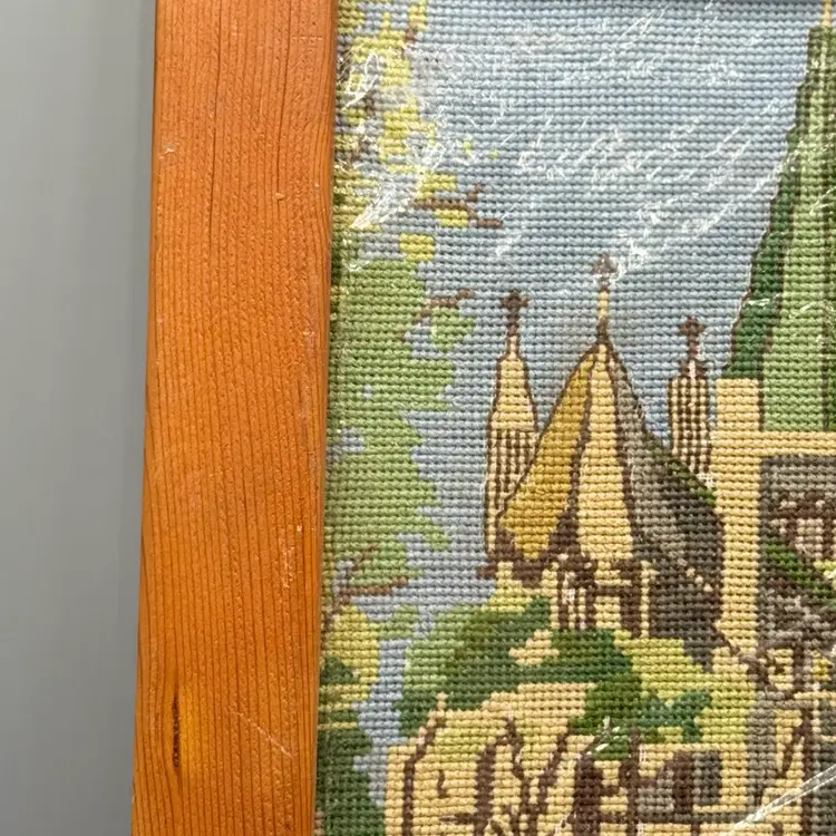 This exquisite vintage wool needlepoint depicts the Askvoll Church (Askvoll kyrkje) in Sunnfjord, Norway. Completed in 1964, the piece is a faithful architectural portrait of the 1863 "long church," specifically highlighting its iconic tall green spire which was added in 1896 to give the structure its "proud" and distinctive silhouette. Excellent condition, still in its protective plastic.