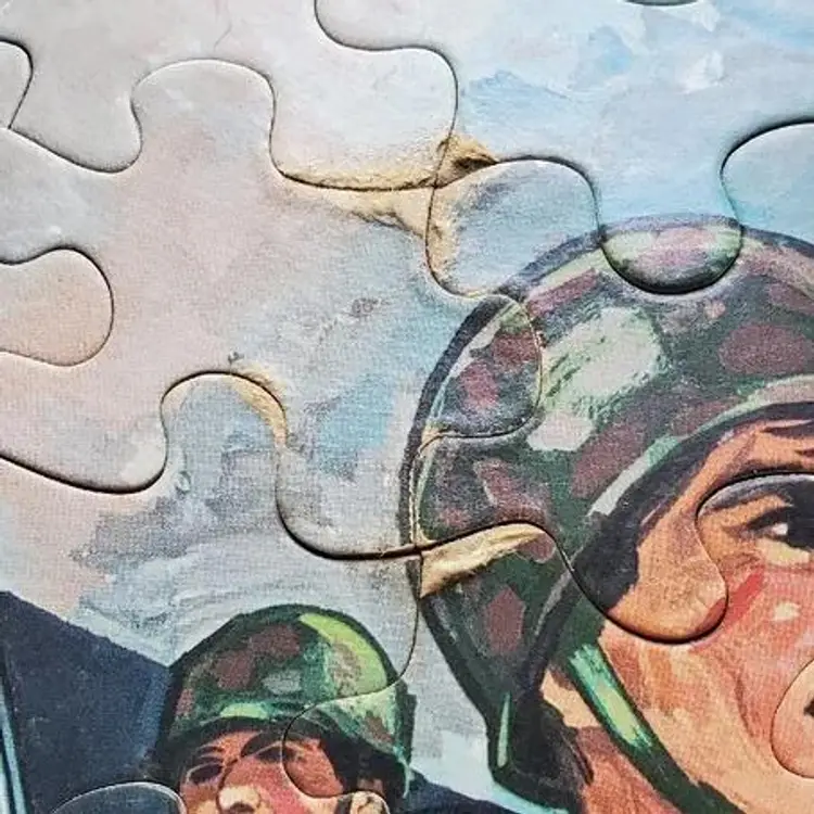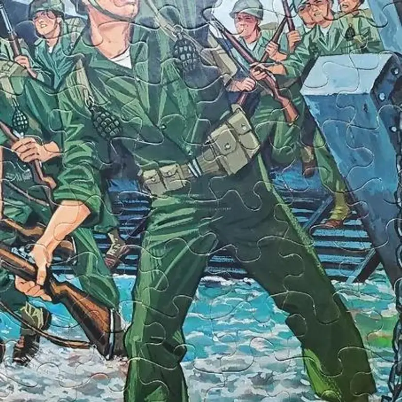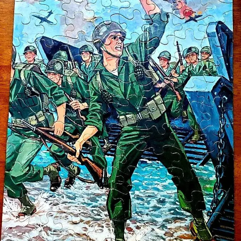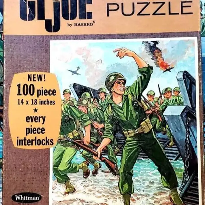 Vintage 1965 GI Joe 100-piece jigsaw puzzle of D-Day by Whitman and Hasbro. Puzzle is Complete and in great condition, but shows some wear in places. Please review pictures before purchasing, sold as is. Some pieces showing wear refer to pictures.