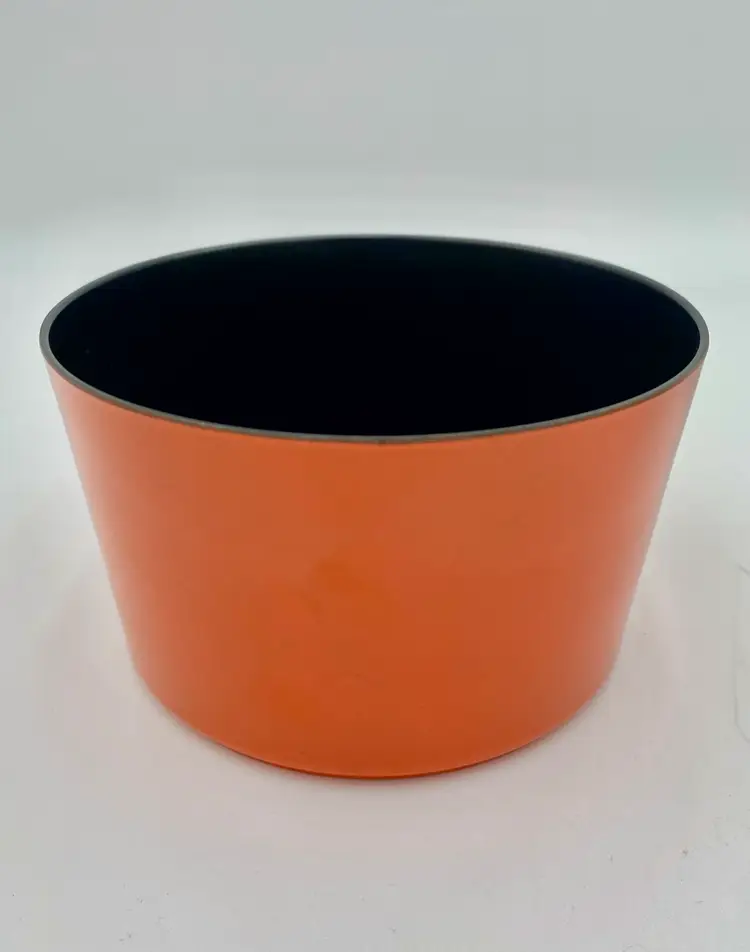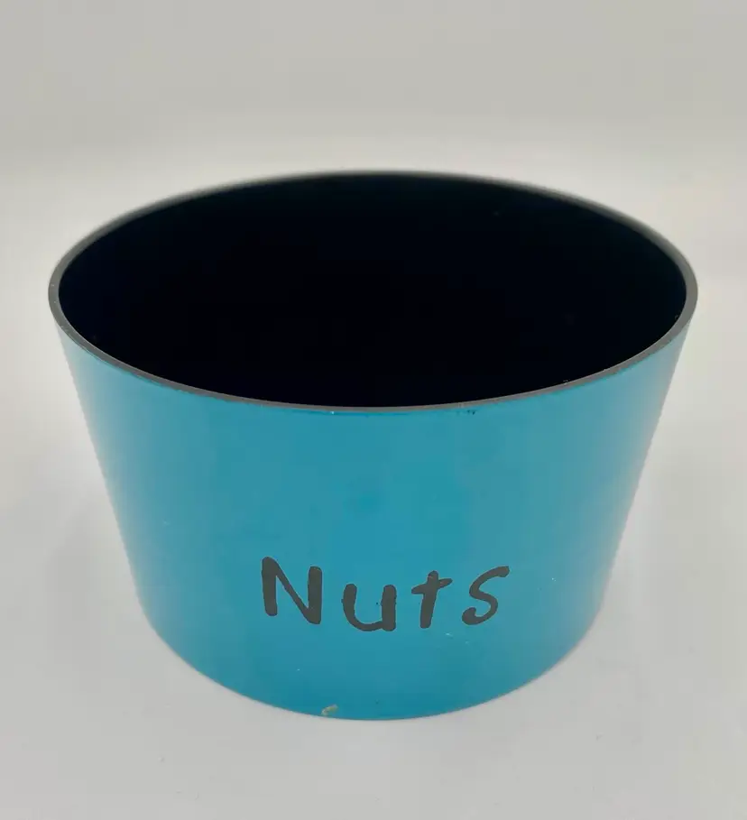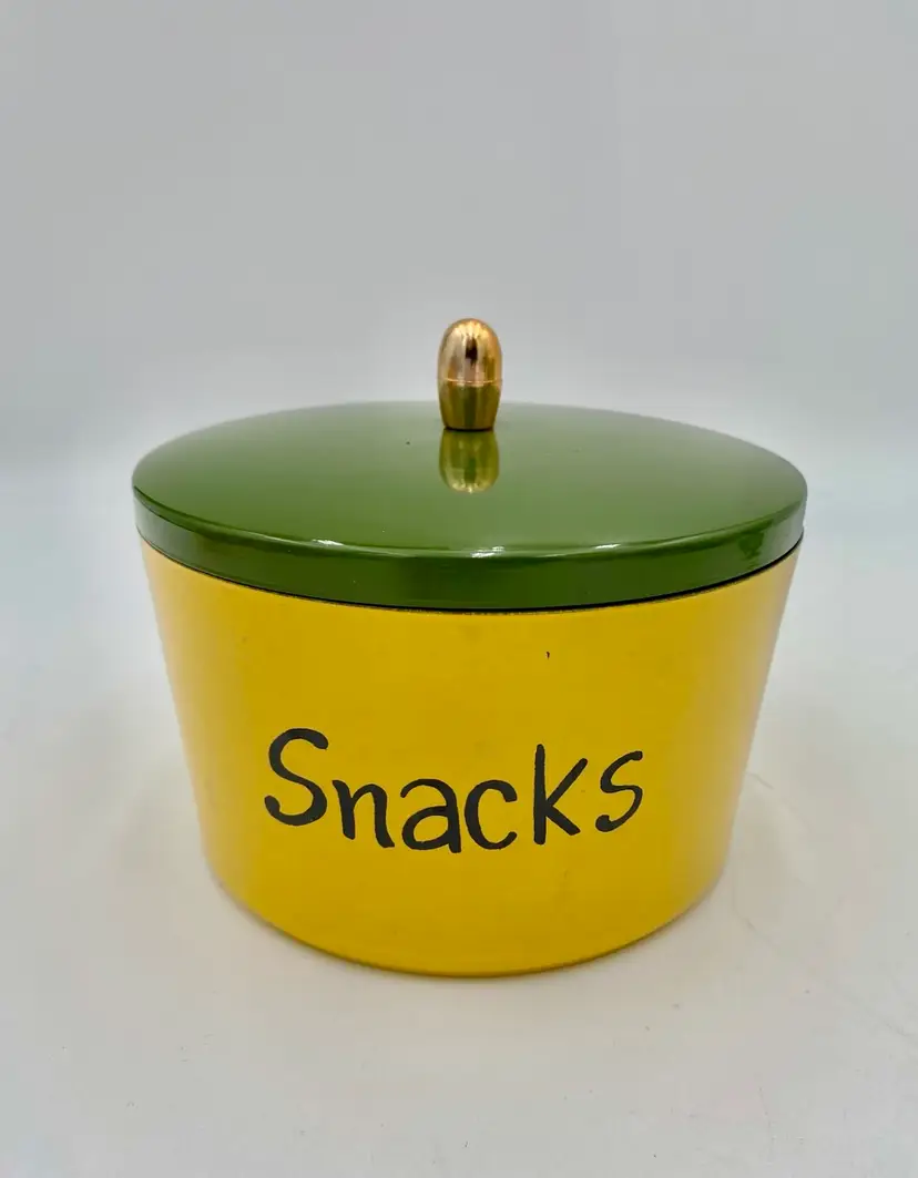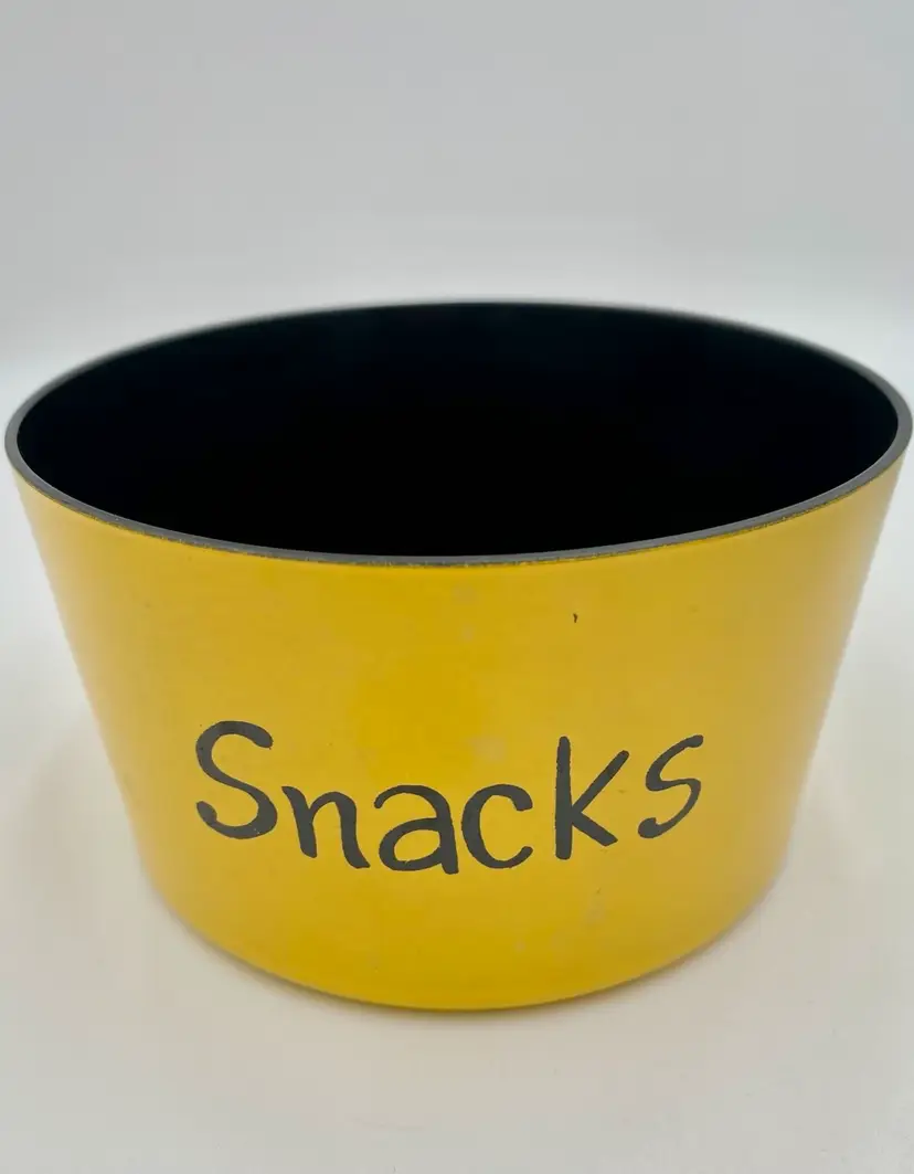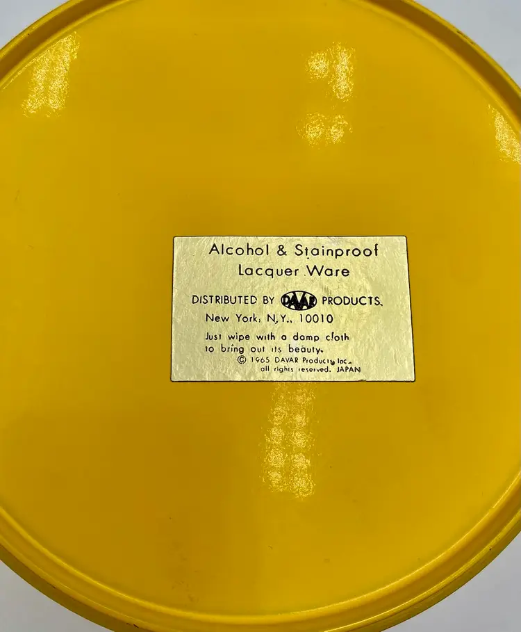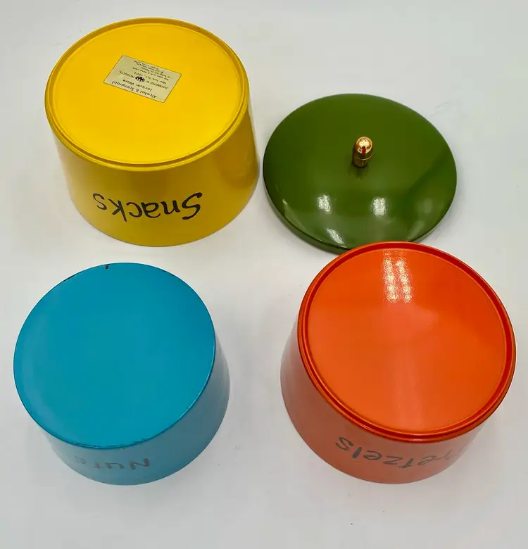 This vintage 1965 Lacquer Ware set of nesting snack bowls set includes three stackable, nested bowls along with a topping lid. Made in 1965 in Japan, these retro bowls feature a glossy finish and script printing in blue, yellow, green and orange. Made of plastic and bearing the original Lacquer Ware sticker on the underside of the largest bowl, the set is a collectible piece that showcases the popular design trends of the 1960s era.
