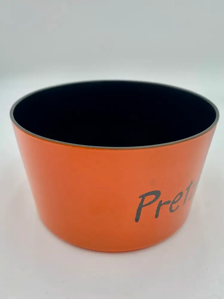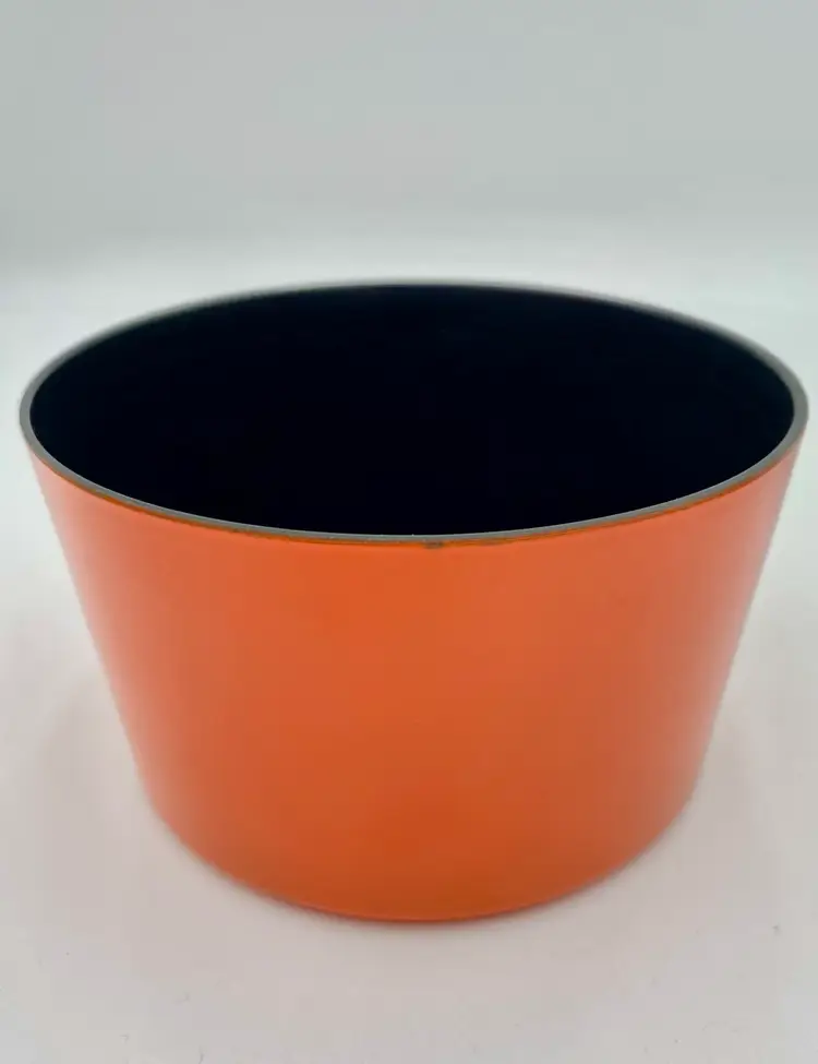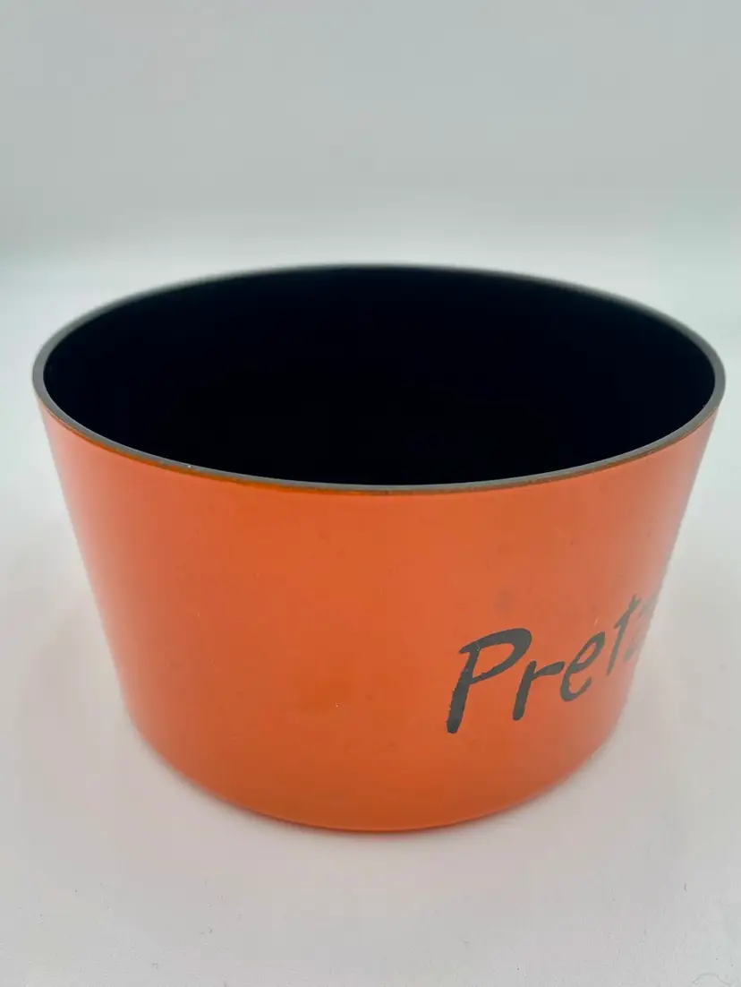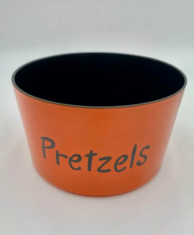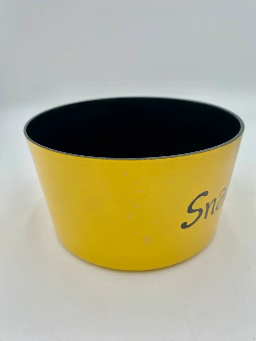 This vintage 1965 Lacquer Ware set of nesting snack bowls set includes three stackable, nested bowls along with a topping lid. Made in 1965 in Japan, these retro bowls feature a glossy finish and script printing in blue, yellow, green and orange. Made of plastic and bearing the original Lacquer Ware sticker on the underside of the largest bowl, the set is a collectible piece that showcases the popular design trends of the 1960s era.