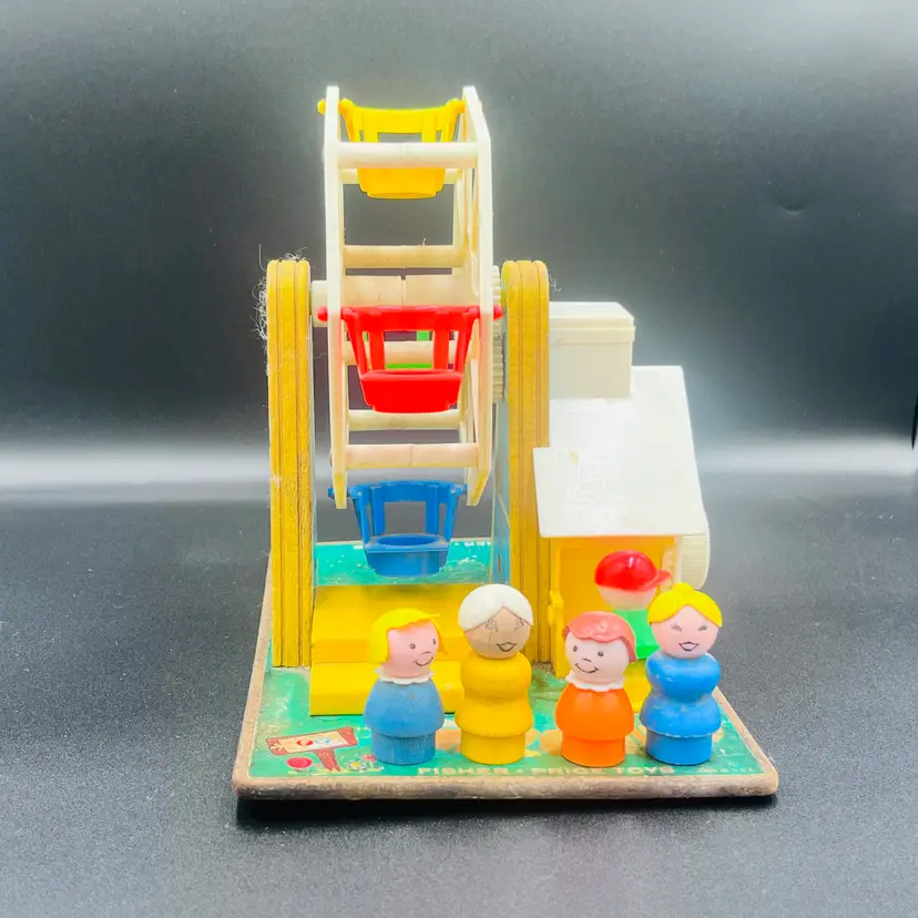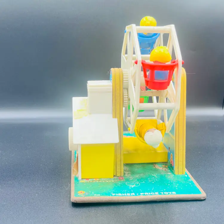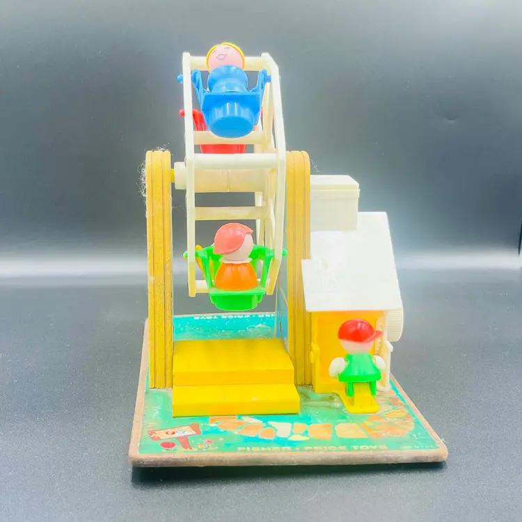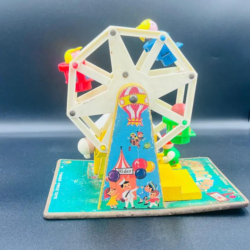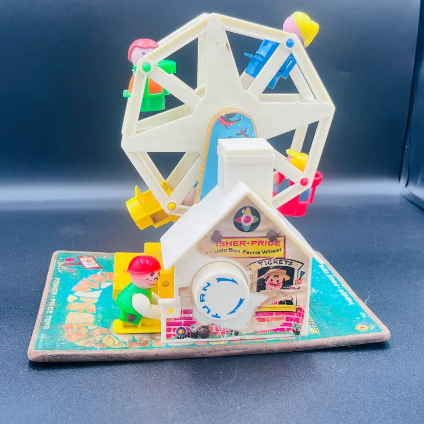 Take a nostalgic ride back in time with this charming 1966 Fisher Price. Music Box Ferris Wheel (#969) This whimsicalm amusement park toy features bright colorsk, classic lithographs, and includes Little People figures riding the spinning Ferris Wheel. When you turn the crank, it plays music and rotates the wheel, just like it did nearly 60 years ago!