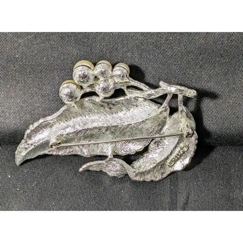 This Sarah Coventry brooch is from 1966 and is named "Silvery Splendor". It features brushed silver tone leaves and faux pearl berries. It has the Sarah Coventry signature on the back. It is approximately 3 inches long x 2" wide. It is in pristine vintage condition.