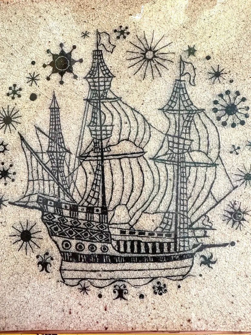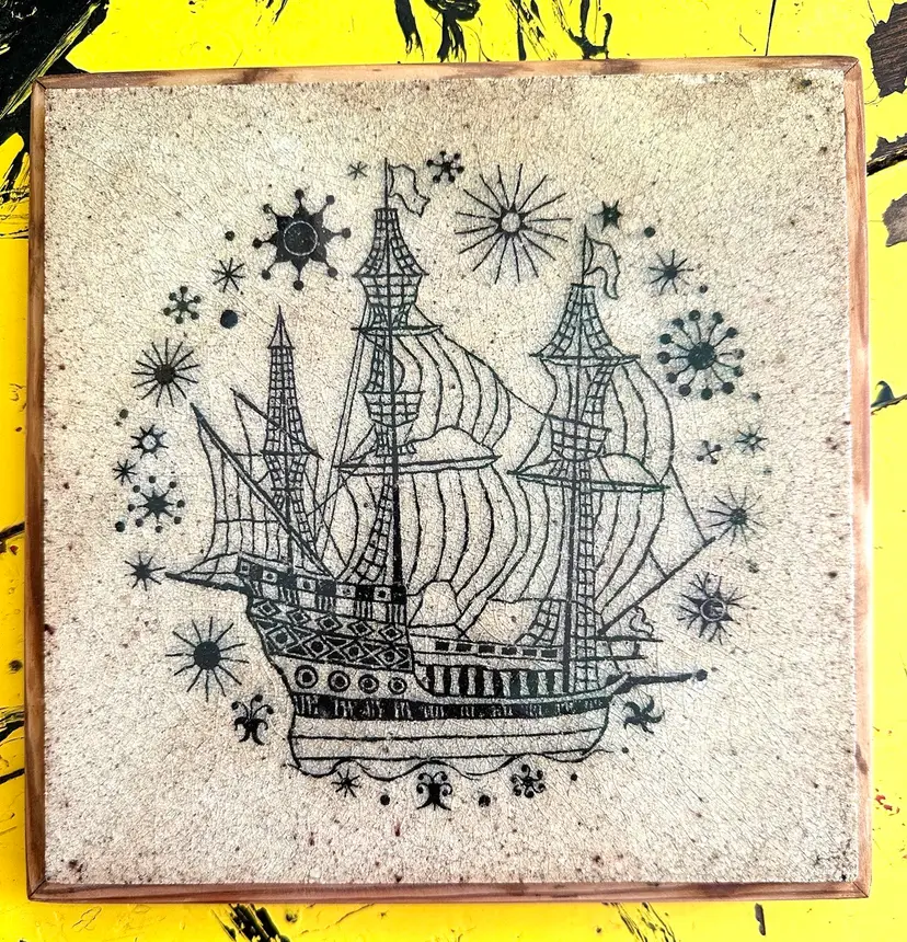 Ship at sea imagery on What seems like stoneware framed to 8.5” square no cracks noted natural and black. Signed K Galaaen 1967