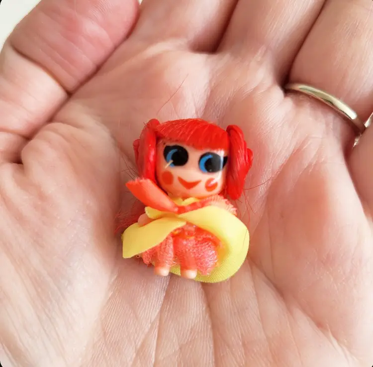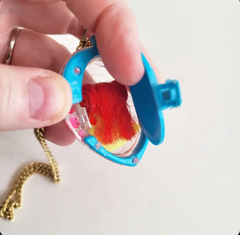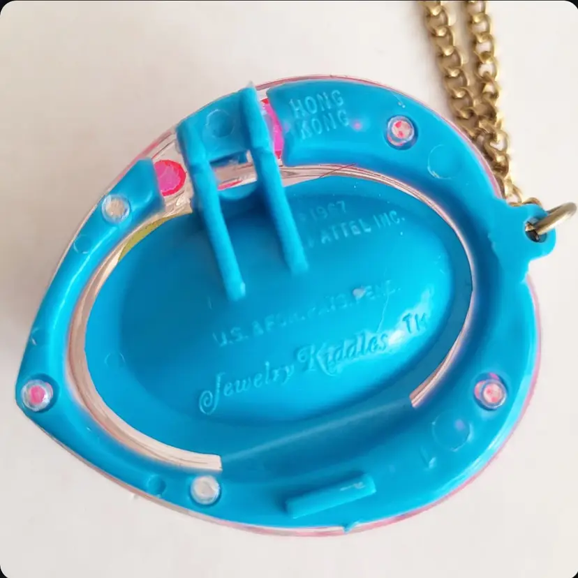 Amazing vintage 1967 Mattel Liddle Kiddles Jewlery locket doll necklace. Locket is 2 in x 1.5 in, doll measures 1 in x .75 in. Chain is 7.5 in drop (15 in long)