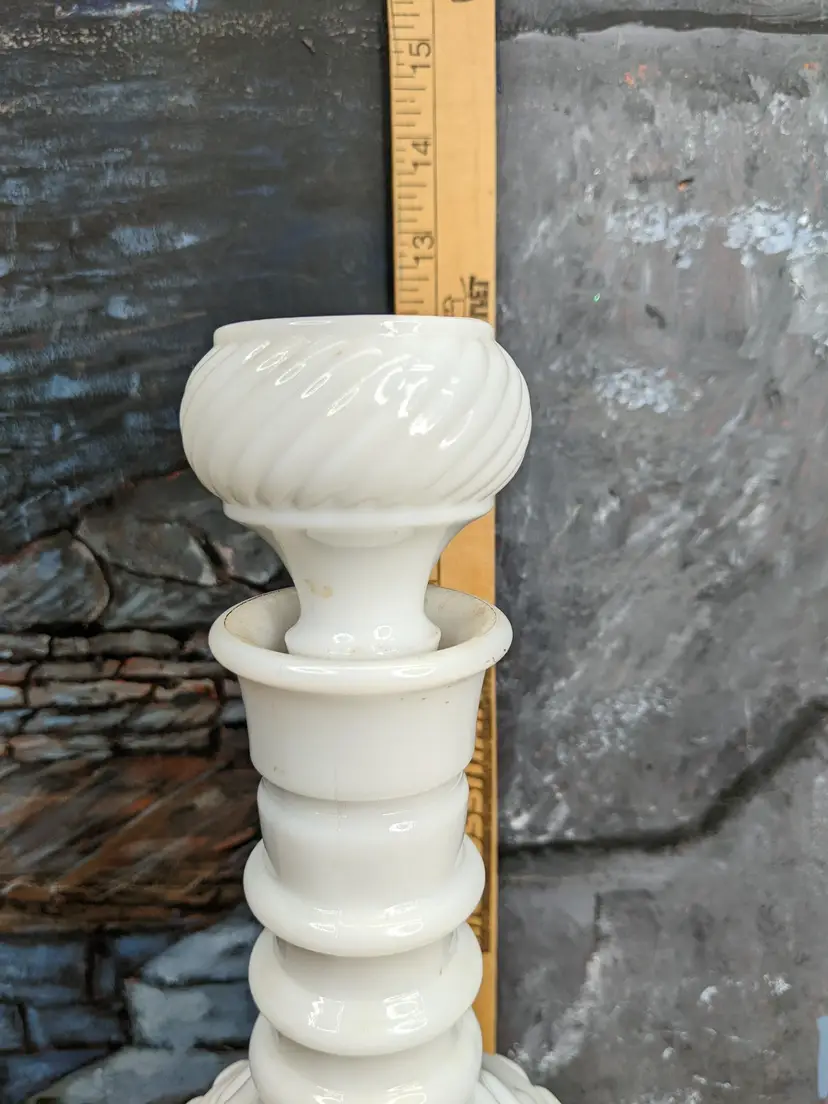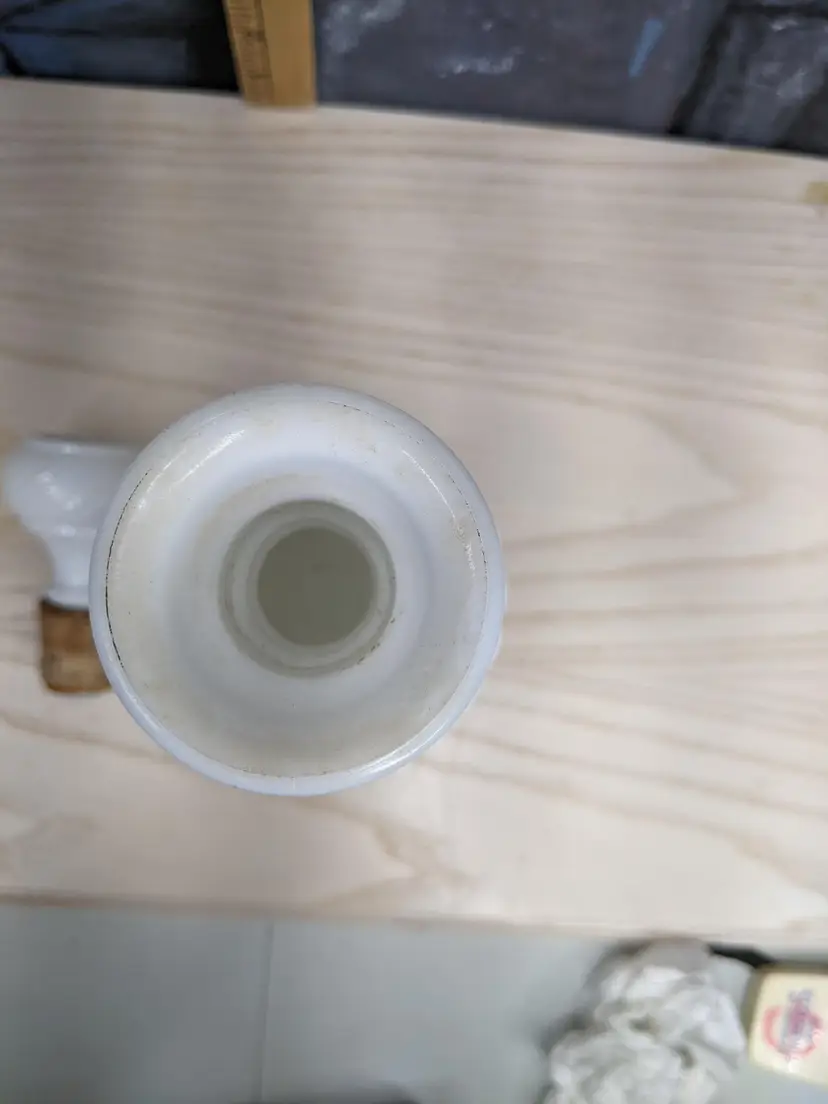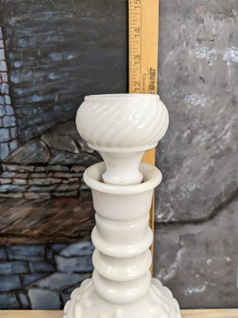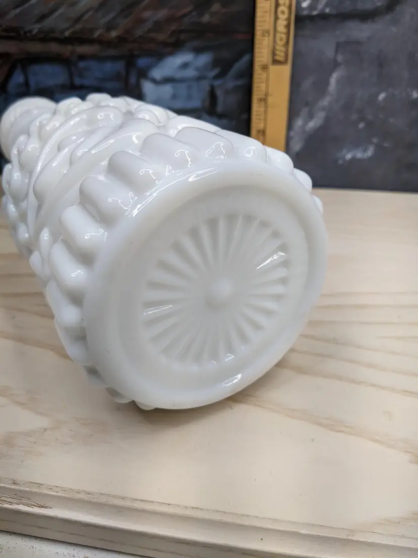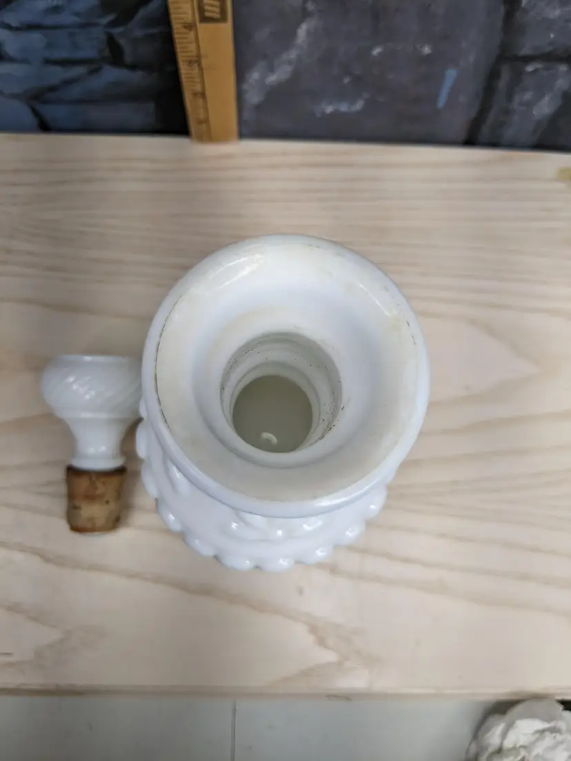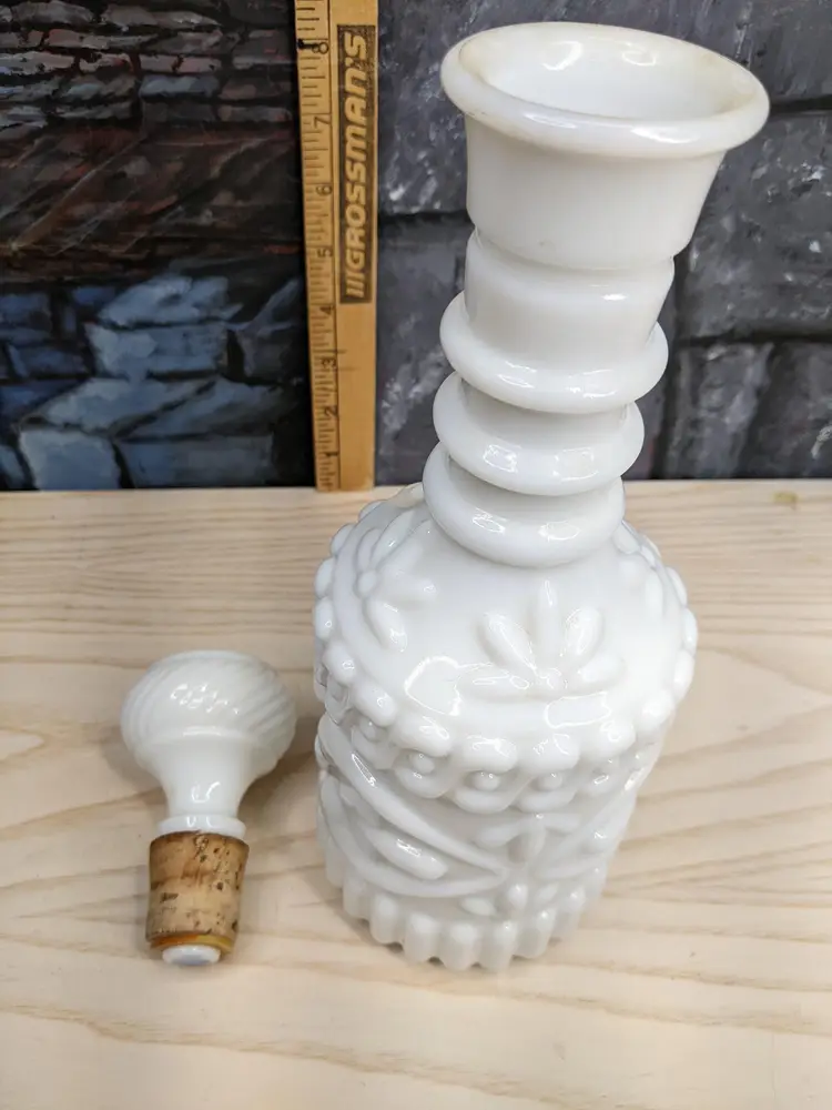 Beautiful, thick white milk glass bottle with a nice embossed design. The bottle is empty and the stopper/cork is intact. It Measurements ~ 4 x 12" Very good condition No chips or cracks empty Cork has a whisky smells. Please check the photos for details Perfect for your bar setup.