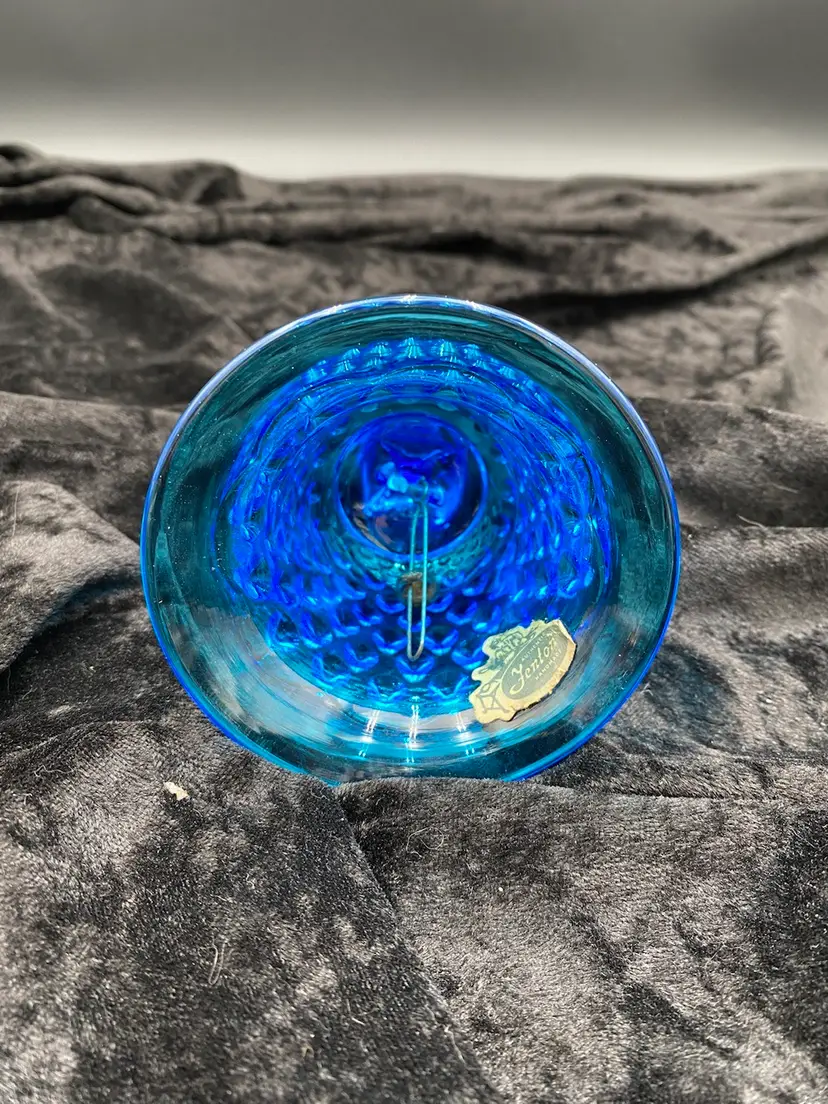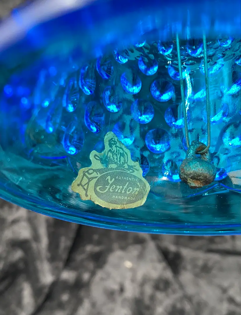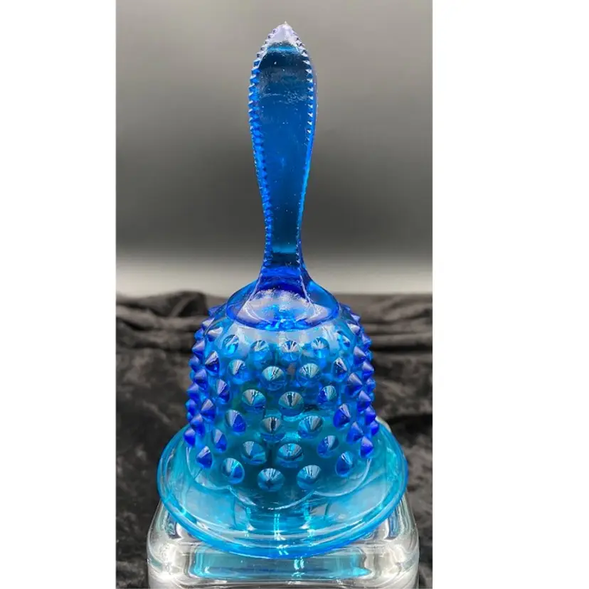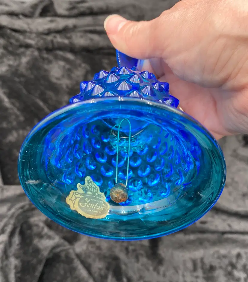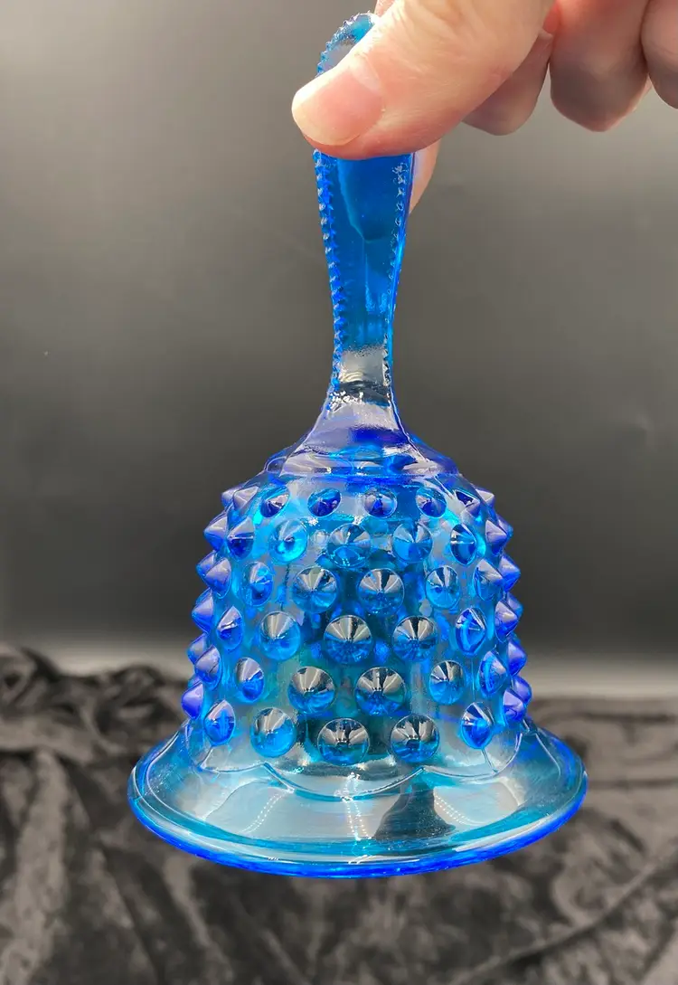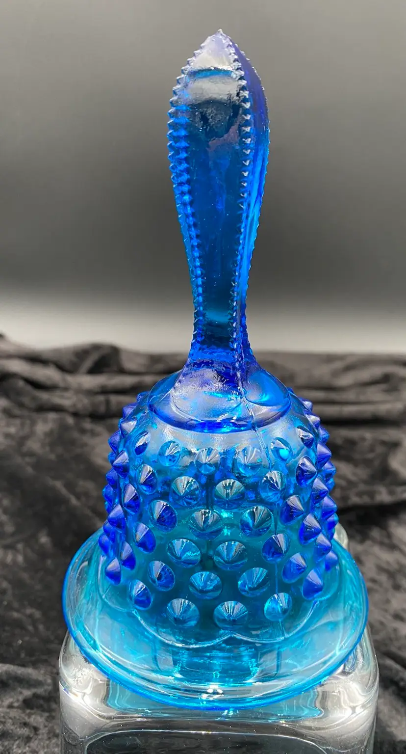 This vintage Fenton glass bell is a beautiful addition to any collection. With its blue hobnail pattern, sawtooth edging on the handle, and mid-century modern style, it is sure to catch the eye. The bell features an original sticker, adding to its authenticity. Crafted in West Virginia in 1970-71, this bell is a true piece of art glass. (Dating: This sticker was used starting in 1970; Fenton made this line from 1964-1979; there is no impressed logo, which means it was made before 1972.) It is made of hand-blown glass and is part of the Colonial Blue product line. This bell is perfect for collectors or those looking to add a unique touch to their home decor.